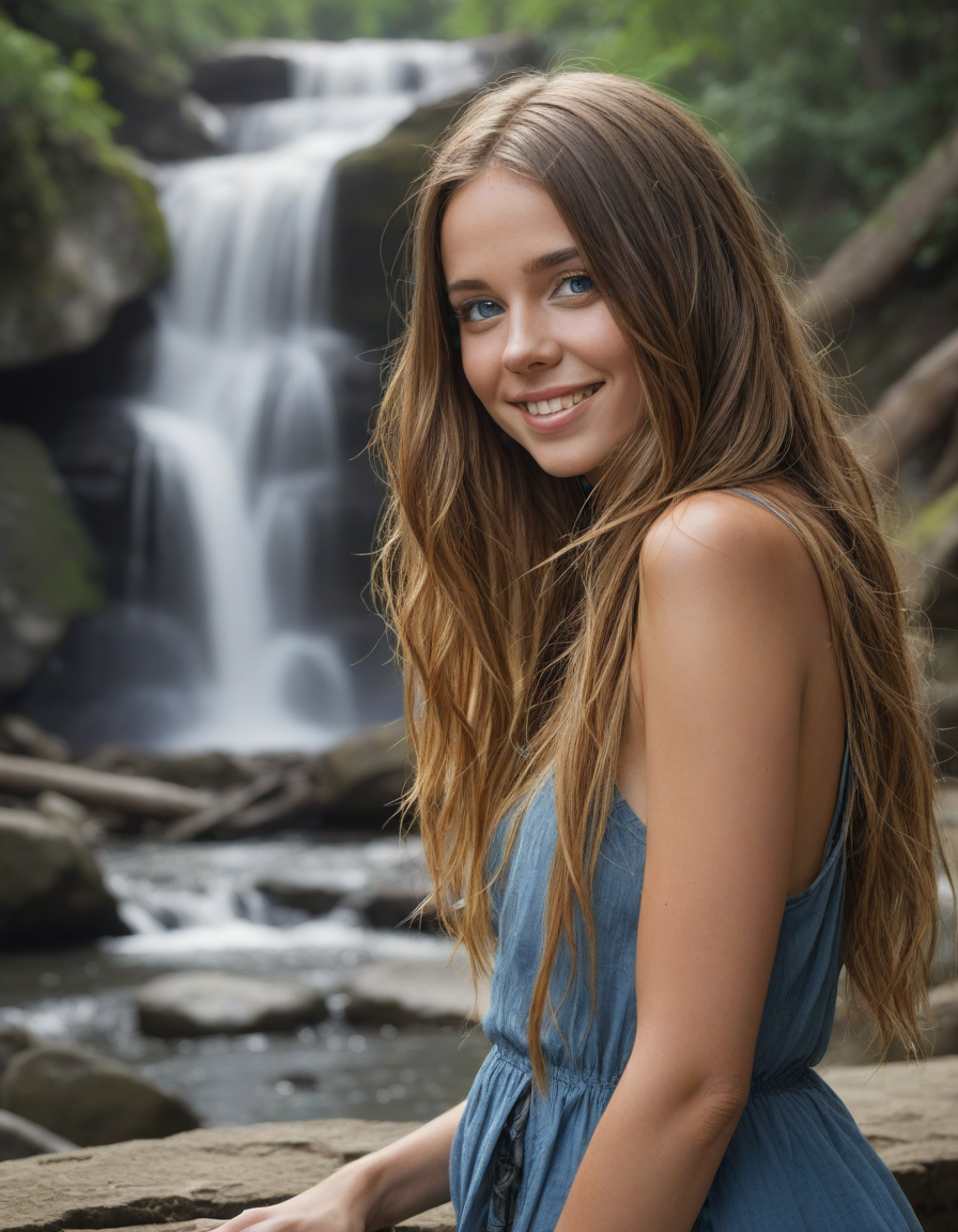 laughing, bright blue eyes, entrancing, is pretty, glistening waterfall