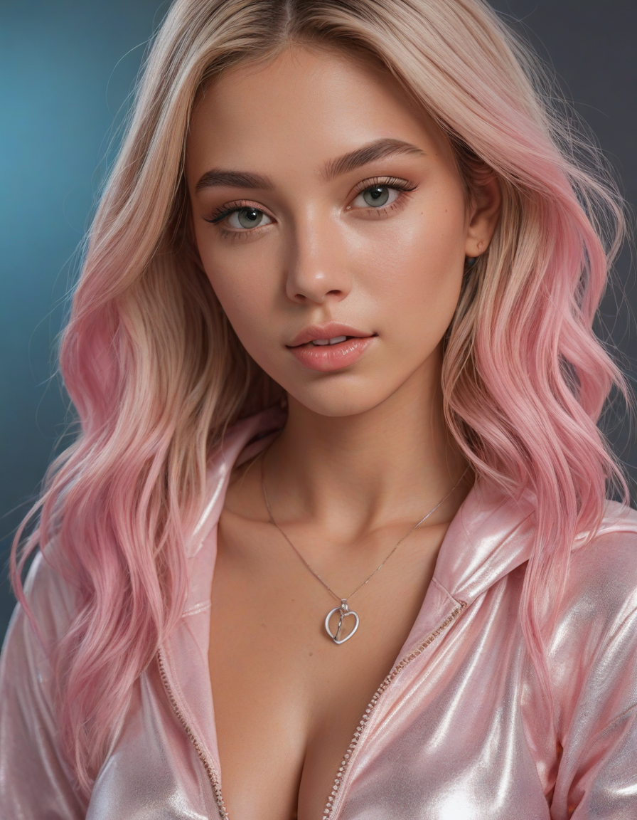 Her makeup is a canvas of e-girl artistry, with dramatic winged eyeliner that stretches towards her temples in a bold statement, eyeshadow in neon hues that electrify her gaze, and dark, matte lipstick that draws all eyes to her. A generous application of blush adds life and vibrancy to her cheeks, complemented by creatively designed nails that are both dark and daring. Accessories—silver chains, a heart pendant choker, and a collection of rings—add layers of personality and depth. Her hair, possibly featuring pastel or neon streaks, is styled in a way that balances edge with elegance, with temporary tattoos or stickers adorning her face to accentuate her playful rebellion.