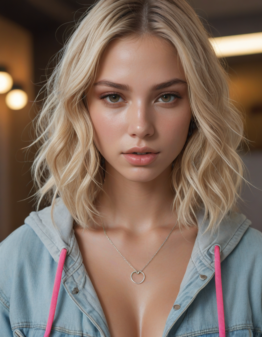 This visualization retains the essence of our previous description, now enhanced by a pose that speaks volumes of her confidence and the vibrant spirit of the e-girl aesthetic. It captures not just the photorealistic image of a young woman in the throes of digital age culture but also the bold statement of identity and self-expression that defines her at this significant moment in her life., Wielding a one-handed weapon in both hands, one-handed weapon, weapon, , oval face shape, almond-shaped eyes, voluminous lashes, slightly arched eyebrows, narrow nasal bridge, rounded nose tip, symmetrical nostrils, full lips, pronounced cupid's bow, slightly fuller lower lip, defined cheekbones, rounded chin, smooth complexion, softly contoured jawline, balanced facial proportions, symmetrical features, gently curved eyelids, soft brow ridge, harmonious cheek to jawline transition, subtle philtrum, delicate ear lobes, straight blonde hair, clear skin, hooded eyelids, light pink lip color, slightly pouty expression, casual pose with hand on face, slight head tilt, indoor lighting, Light blue irises, Medium-thickness eyebrows, Softly angled eyebrows, A hint of freckles across the nose and cheeks, Natural makeup, Gentle frown lines between the eyebrows, Soft nasolabial folds, Smooth forehead, Subtle dimple on the chin, Clear facial contour without distinct shadows, Even skin tone with a hint of natural pink undertones, Slightly rosy cheeks, Tapered jawline, Fine hair texture with gentle waves, Youthful appearance with soft facial features, excessive cleavage, low neckline, revealing chest, revealing cleavage, cleavage-baring, revealing, excessively revealing, very revealing, lowcut, lowrise,