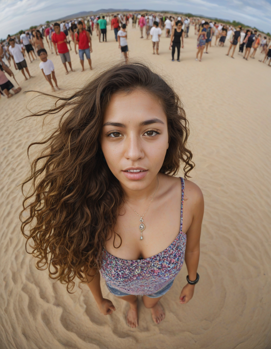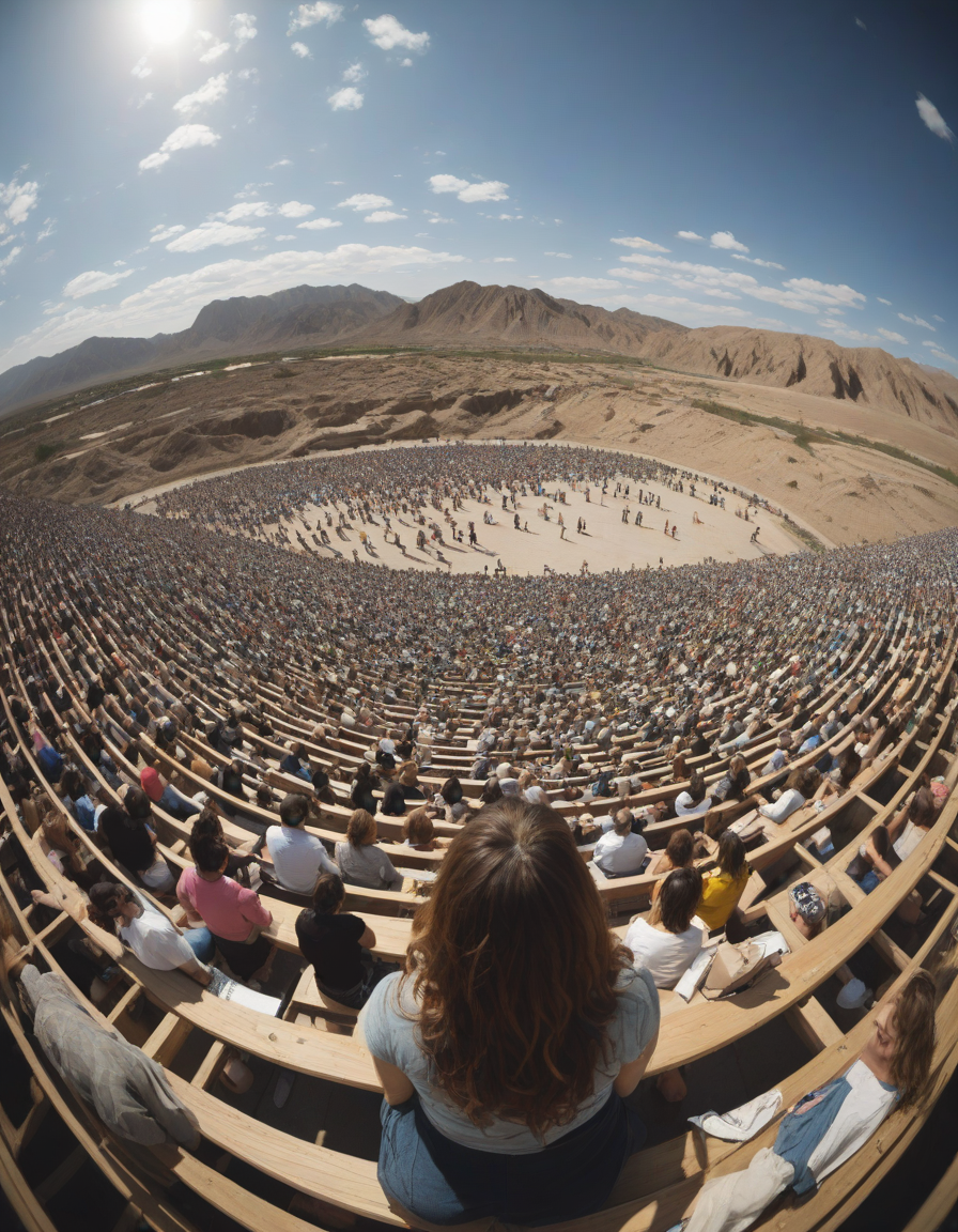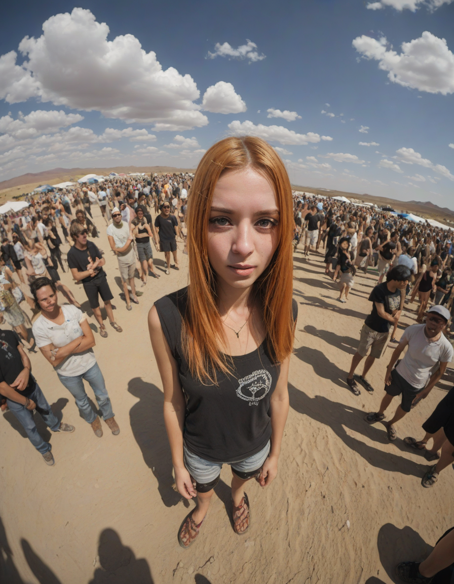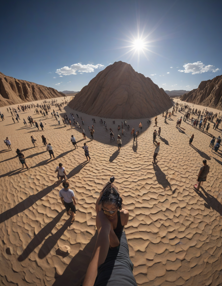 Extreme fish eye, fisheye lens, crowd of people, in the desert