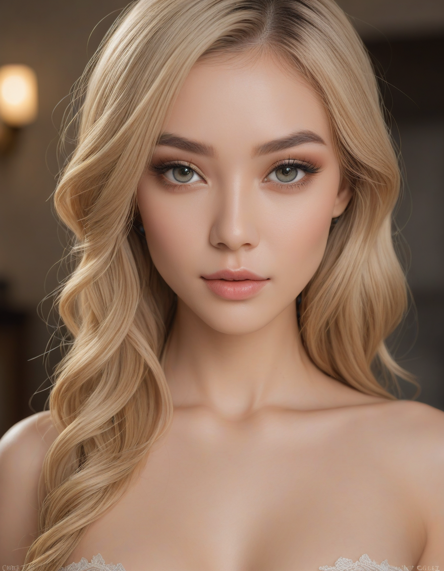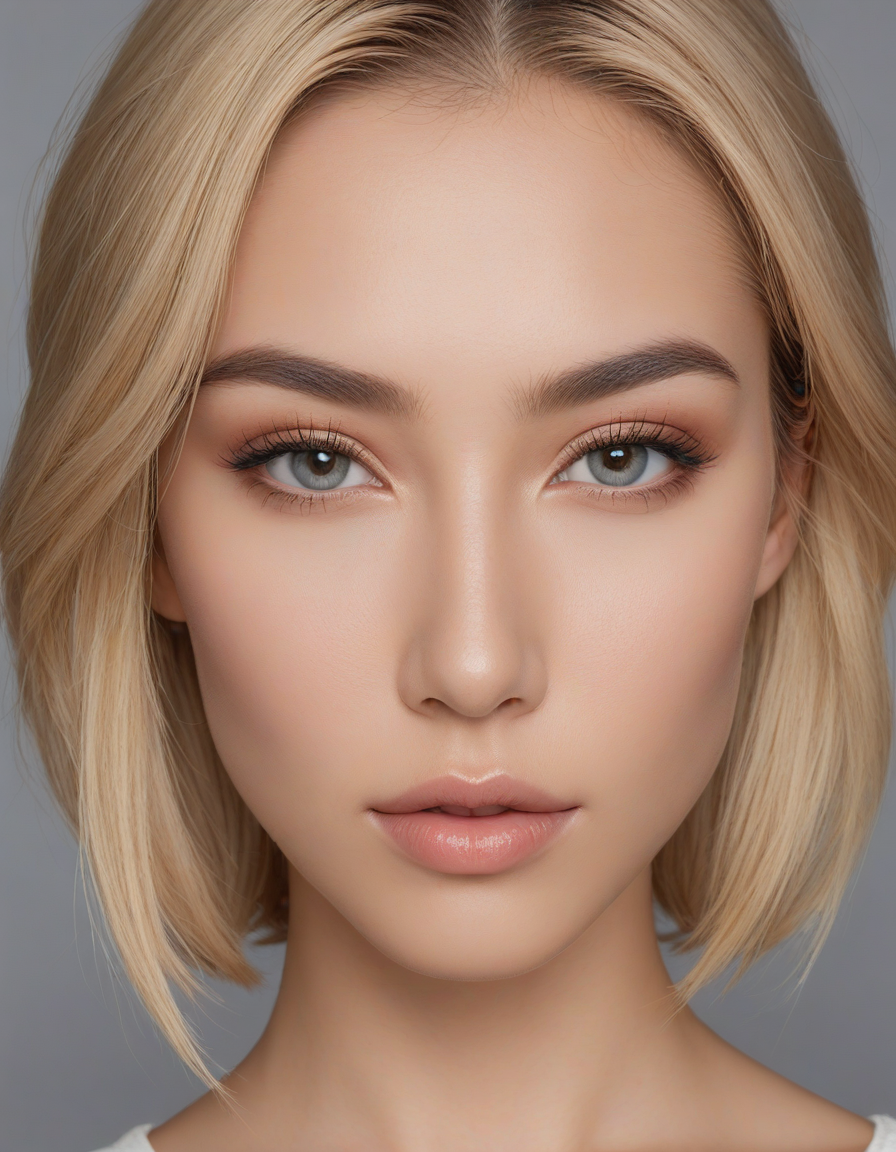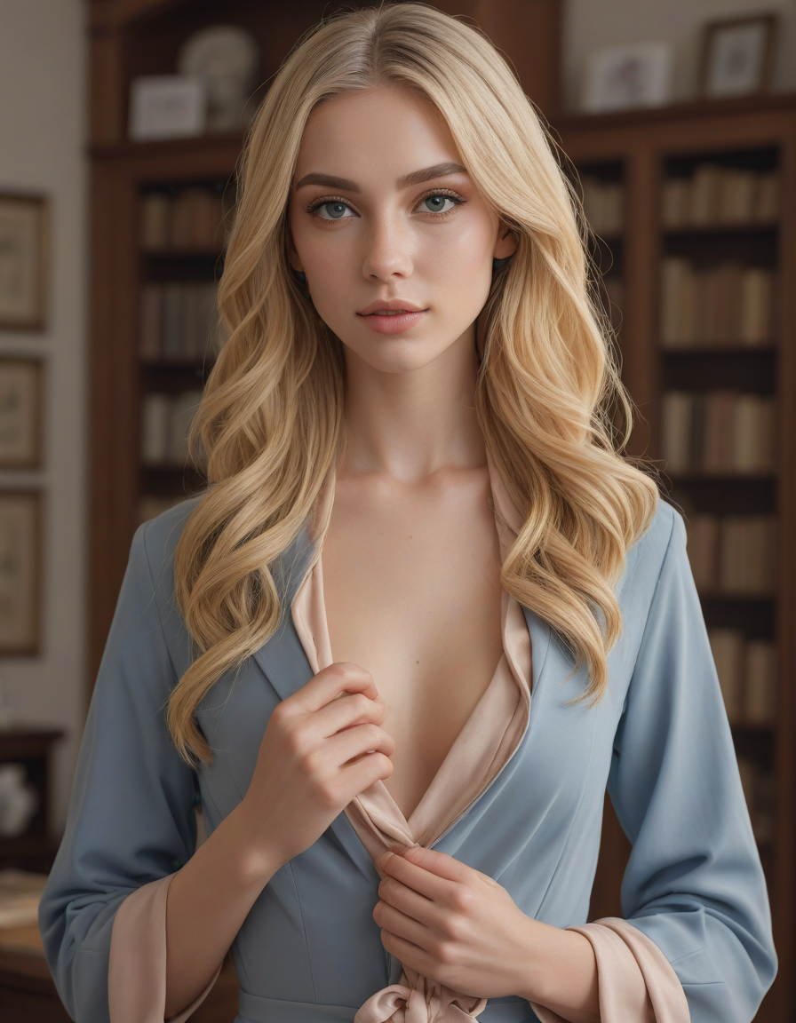 elegant, high waist tight overknee stiletto boots, looking at viewer, oval face shape, almond-shaped eyes, voluminous lashes, slightly arched eyebrows, narrow nasal bridge, rounded nose tip, symmetrical nostrils, full lips, pronounced cupid's bow, slightly fuller lower lip, defined cheekbones, rounded chin, smooth complexion, softly contoured jawline, balanced facial proportions, symmetrical features, gently curved eyelids, soft brow ridge, harmonious cheek to jawline transition, subtle philtrum, delicate ear lobes, straight blonde hair, clear skin, hooded eyelids, light pink lip color, slightly pouty expression, casual pose with hand on face, slight head tilt, indoor lighting, Light blue irises, Medium-thickness eyebrows, Softly angled eyebrows, A hint of freckles across the nose and cheeks, Natural makeup, Gentle frown lines between the eyebrows, Soft nasolabial folds, Smooth forehead, Subtle dimple on the chin, Clear facial contour without distinct shadows, Even skin tone with a hint of natural pink undertones, Slightly rosy cheeks, Tapered jawline, Fine hair texture with gentle waves, Youthful appearance with soft facial features
