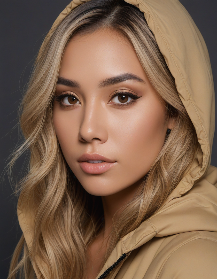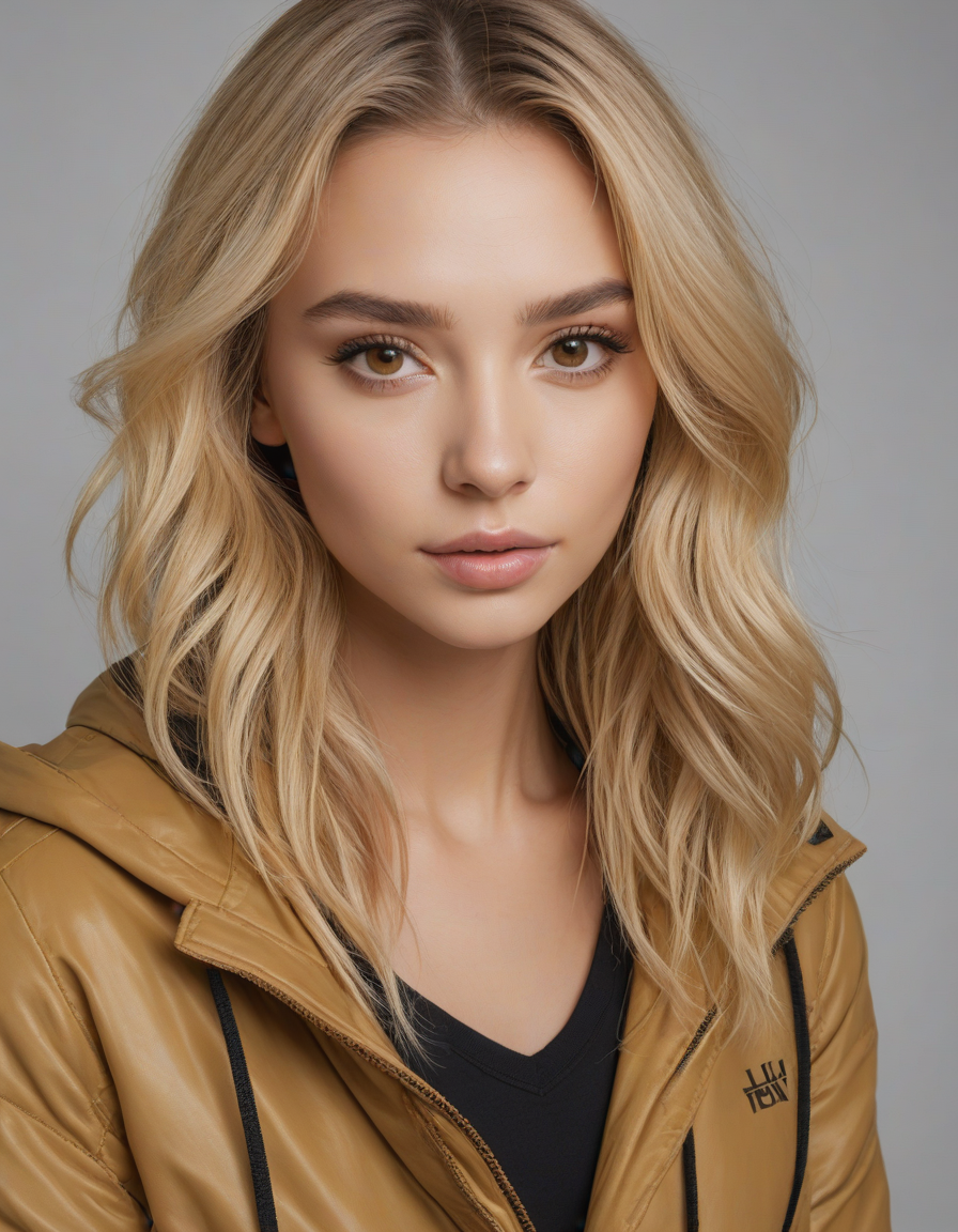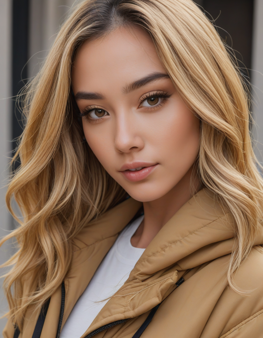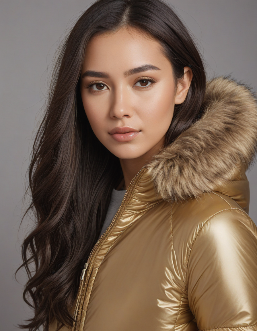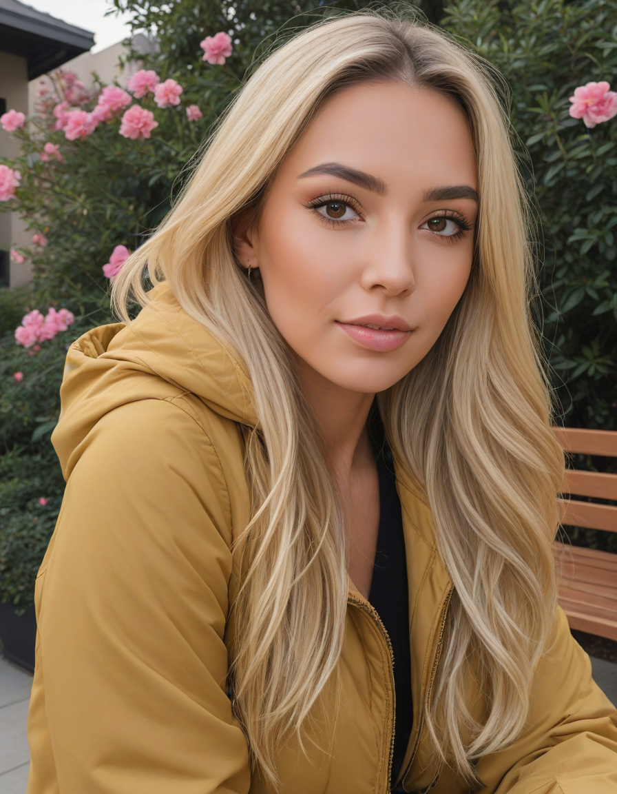 a lady wearing a hooded yellow parka and a pair of formfitting black leggings, polished, friend hugging, 18yo, 18 year old, Glamorous full-coverage foundation, high-gloss lip finish, dramatic eyelash extensions, deep contouring, bronzed skin glow, smoky eye effect, nude lip shades, defined eyebrow arches, shimmering eyeshadow, luxurious false lashes, precision lip contouring, radiant cheek highlight, voluminous hair effect in makeup, plump lip enhancement, classic winged eyeliner, soft-focus skin finish, meticulous face sculpting, sparkling eye accents, meticulous eyebrow definition, vibrant blush placement, sultry eye makeup, flawless skin illusion, high-definition makeup, polished aesthetic finish, celebrity-inspired glamour, egirl makeup, dolly makeup, , complex, crisp Blu-ray remaster, gingerbread house