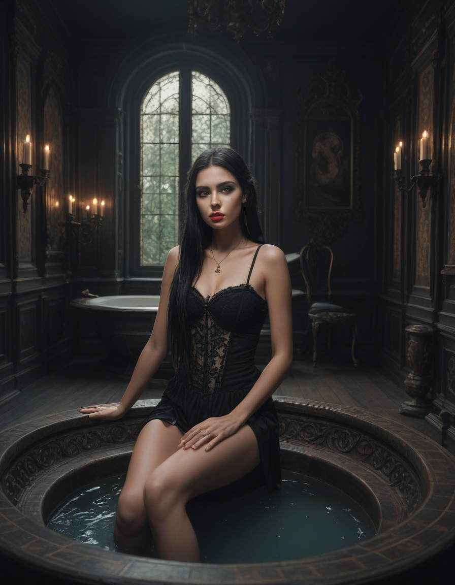 Focused lights, Gleeful, yet held back with an eerie tight-lipped glare, Gothic jacuzzi paradise