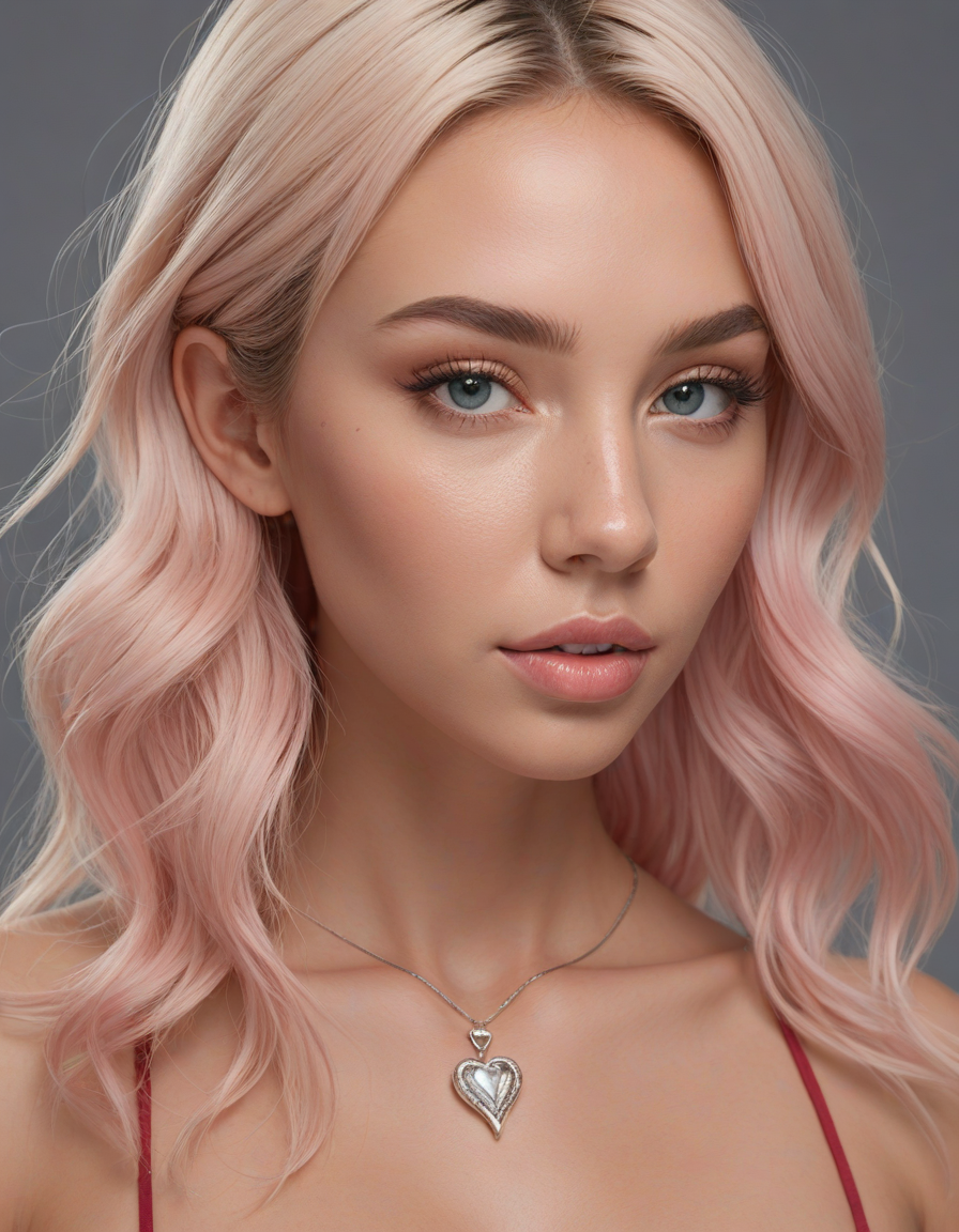 Her makeup is a canvas of e-girl artistry, with dramatic winged eyeliner that stretches towards her temples in a bold statement, eyeshadow in neon hues that electrify her gaze, and dark, matte lipstick that draws all eyes to her. A generous application of blush adds life and vibrancy to her cheeks, complemented by creatively designed nails that are both dark and daring. Accessories—silver chains, a heart pendant choker, and a collection of rings—add layers of personality and depth. Her hair, possibly featuring pastel or neon streaks, is styled in a way that balances edge with elegance, with temporary tattoos or stickers adorning her face to accentuate her playful rebellion.