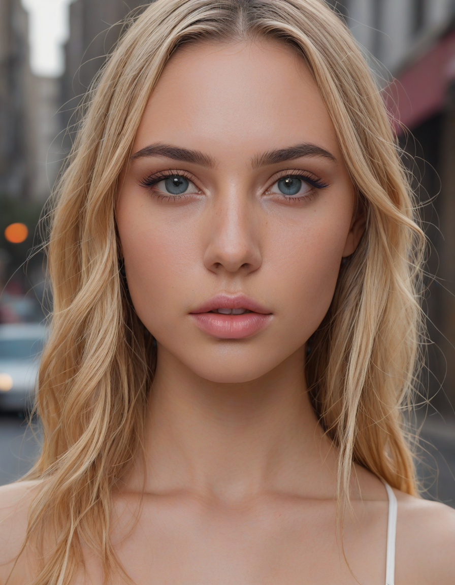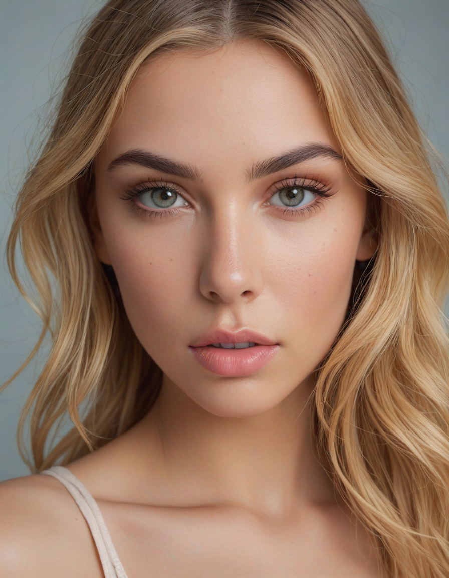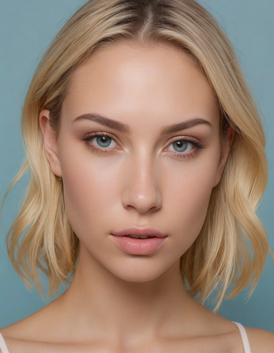 oval face shape, almond-shaped eyes, voluminous lashes, slightly arched eyebrows, narrow nasal bridge, rounded nose tip, symmetrical nostrils, full lips, pronounced cupid's bow, slightly fuller lower lip, defined cheekbones, rounded chin, smooth complexion, softly contoured jawline, balanced facial proportions, symmetrical features, gently curved eyelids, soft brow ridge, harmonious cheek to jawline transition, subtle philtrum, delicate ear lobes, straight blonde hair, clear skin, hooded eyelids, light pink lip color, slightly pouty expression, casual pose with hand on face, slight head tilt, indoor lighting, Light blue irises, Medium-thickness eyebrows, Softly angled eyebrows, A hint of freckles across the nose and cheeks, Natural makeup, Gentle frown lines between the eyebrows, Soft nasolabial folds, Smooth forehead, Subtle dimple on the chin, Clear facial contour without distinct shadows, Even skin tone with a hint of natural pink undertones, Slightly rosy cheeks, Tapered jawline, Fine hair texture with gentle waves, Youthful appearance with soft facial features, provocative clothing, slutty clothing, skimpy clothing, revealing clothing, seductive clothing, coquettish clothing, coquettish, seductive, taboo, sheer clothing,