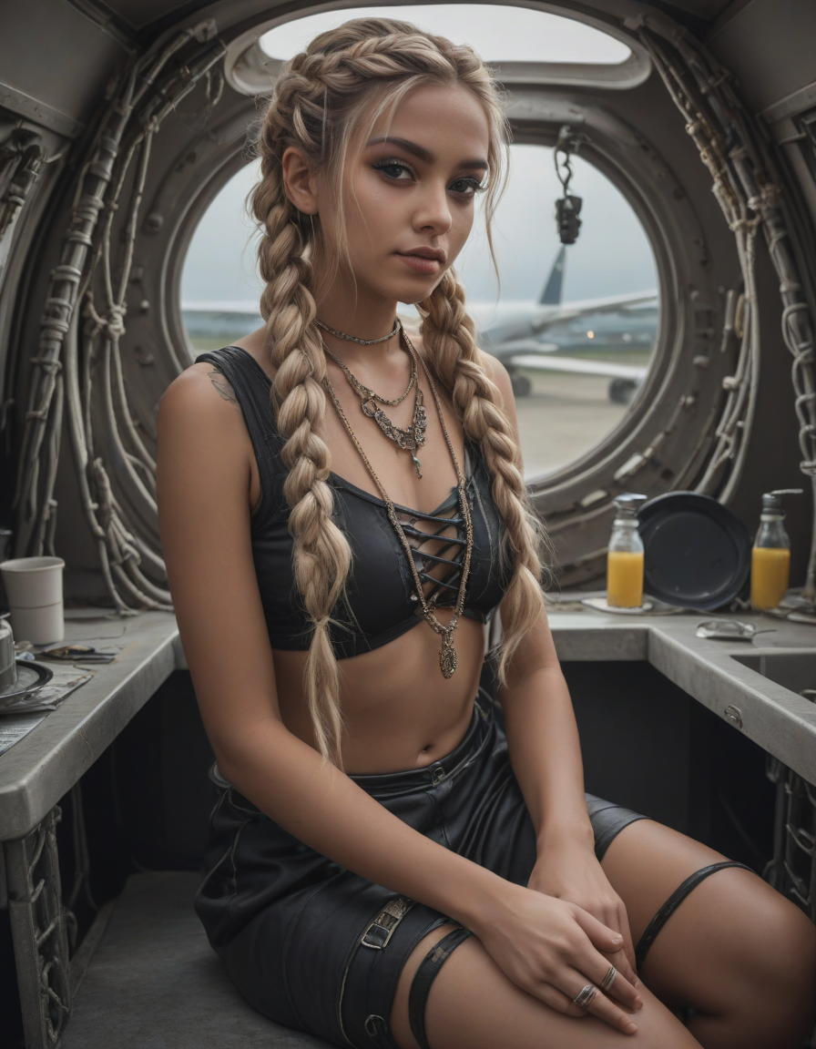 in an airplane, braided hair, Gothic jacuzzi paradise