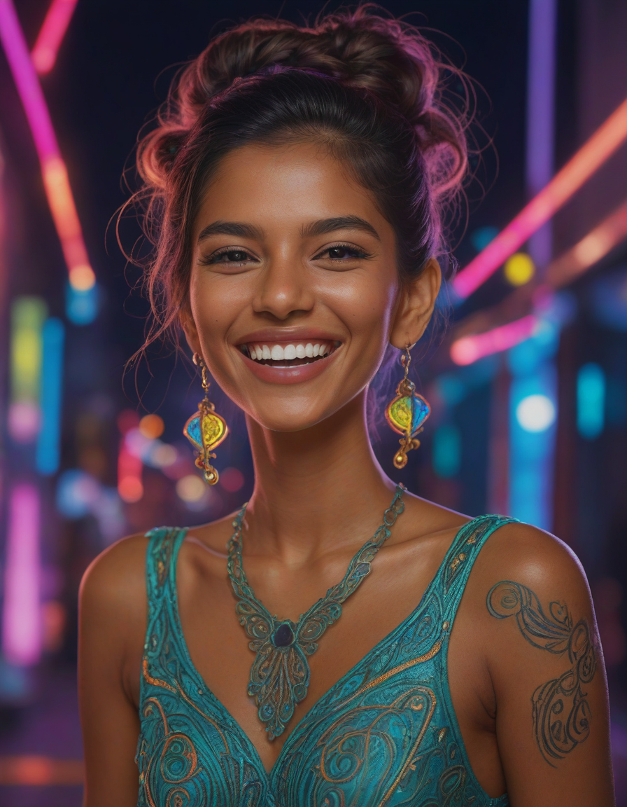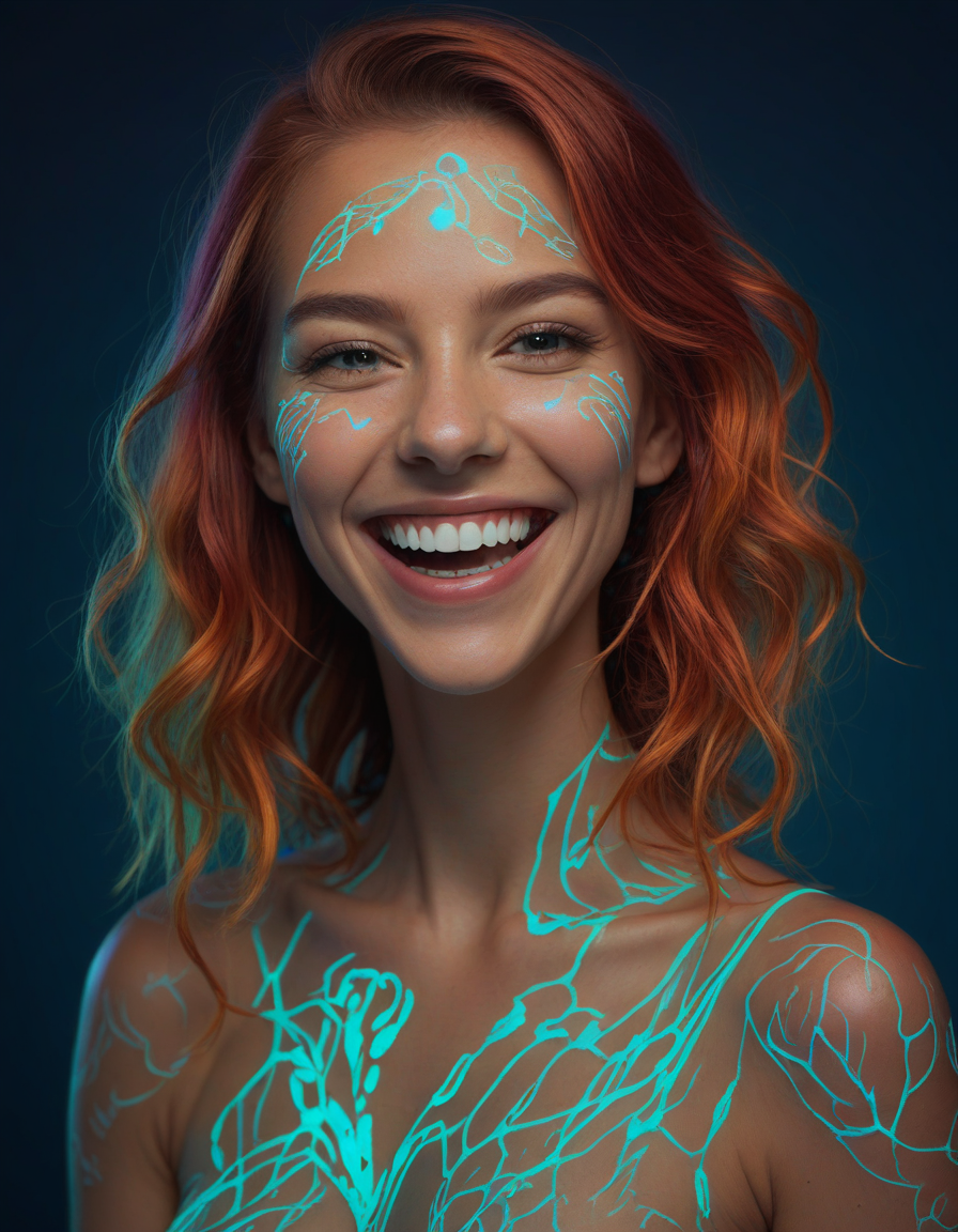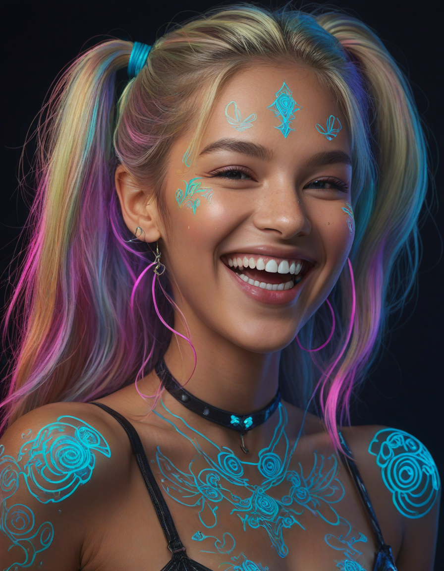 joyful laughing expression, bioluminescent tattoos glowing neon colors, colorful lighting