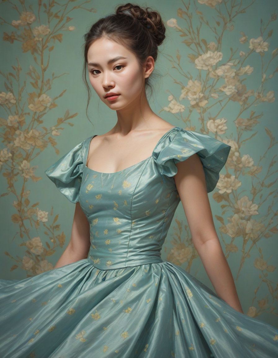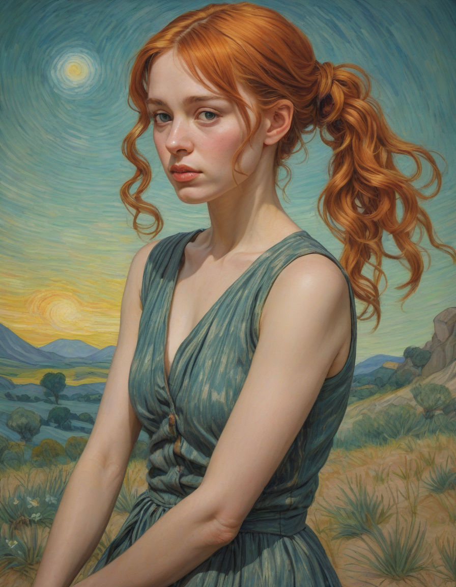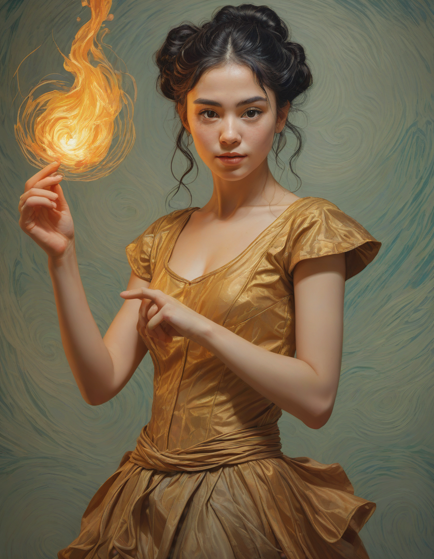 deft movements, van gogh, contemporary dancer onstage, puffed out cheeks, attractive, shimmering aura, Yearning in gaze
