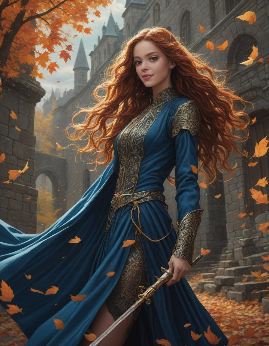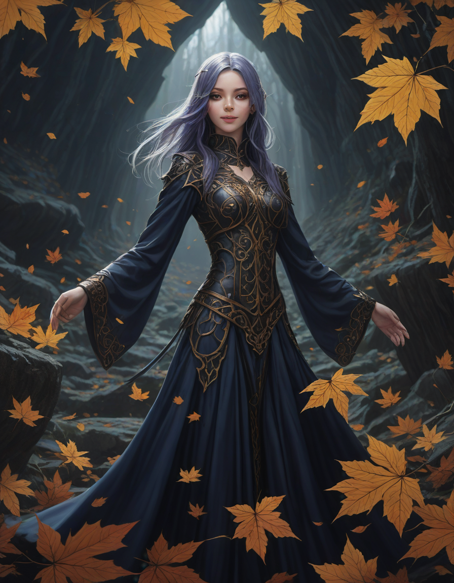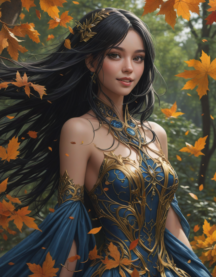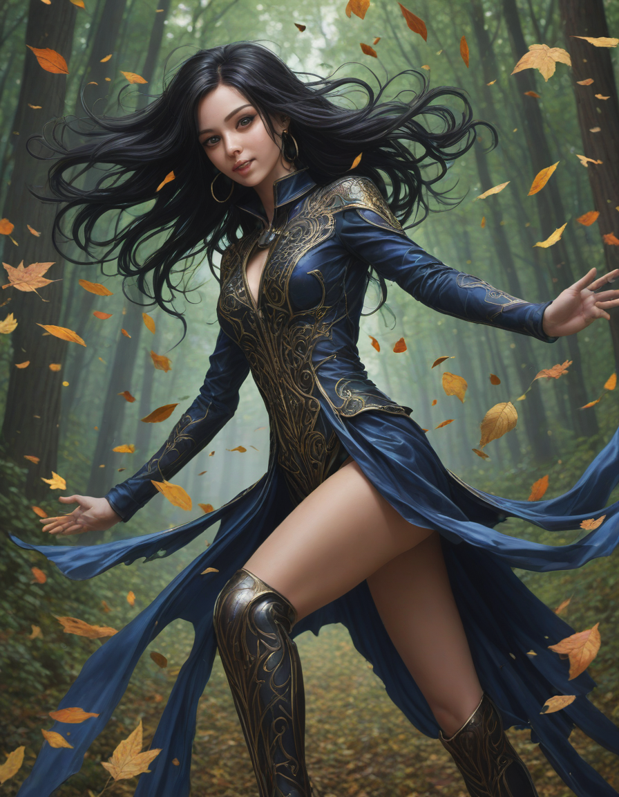 disintegrating, A sparkling, sapphire-eyed swordswoman who dances gracefully, beaming with pride, surprised, Cloaked in darkness, smiling, falling leaves, Raven-black hair cascading down their back, psychedelic trip