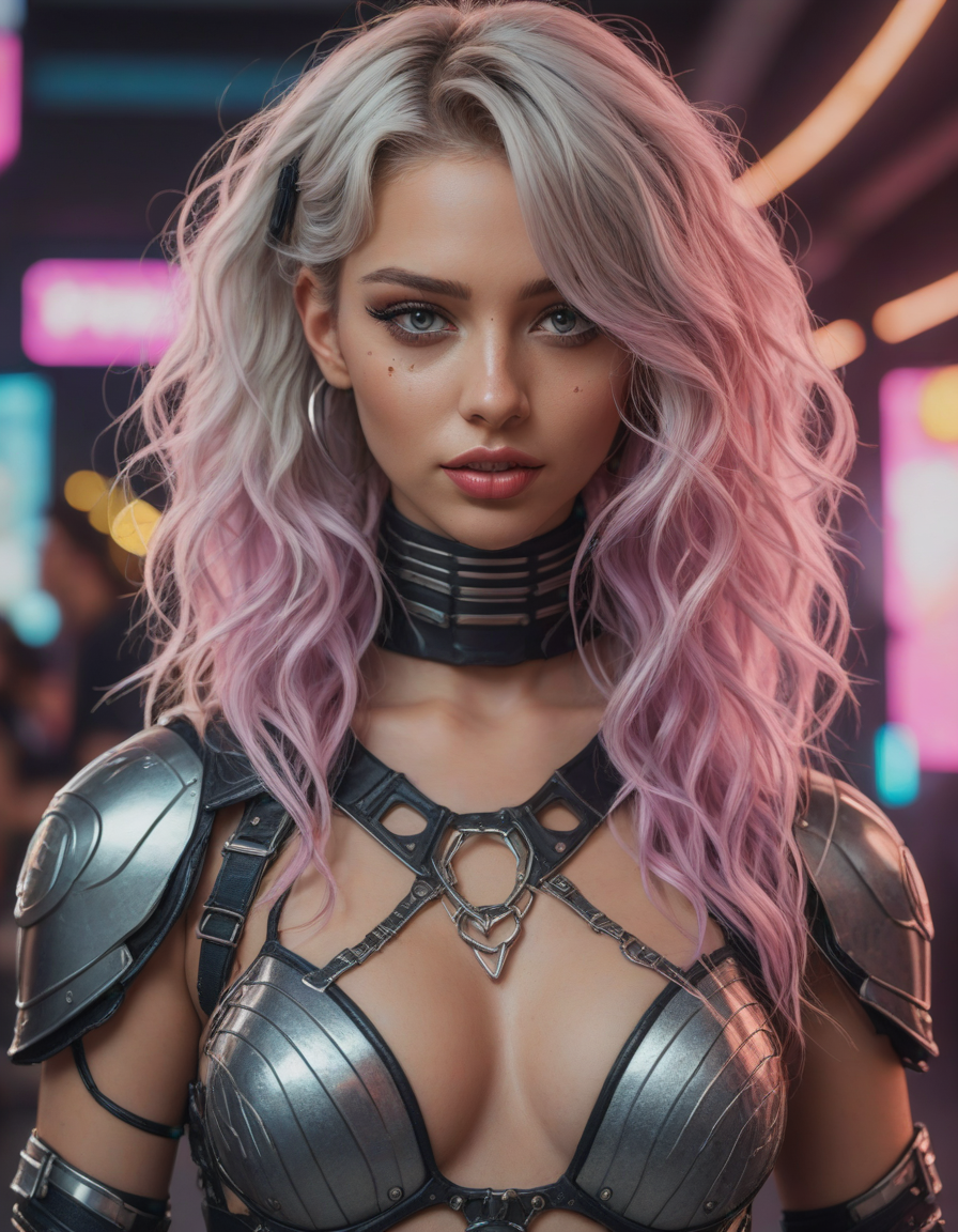 The background remains intentionally blurred, a mere suggestion of her personal space adorned with elements synonymous with the e-girl life—neon signs, band posters, and string lights—creating an ambiance that's both intimate and expressive. The lighting emphasizes the vivid colors of her makeup and the unique textures of her outfit, casting her in an ambiance that's dynamic and full of life.