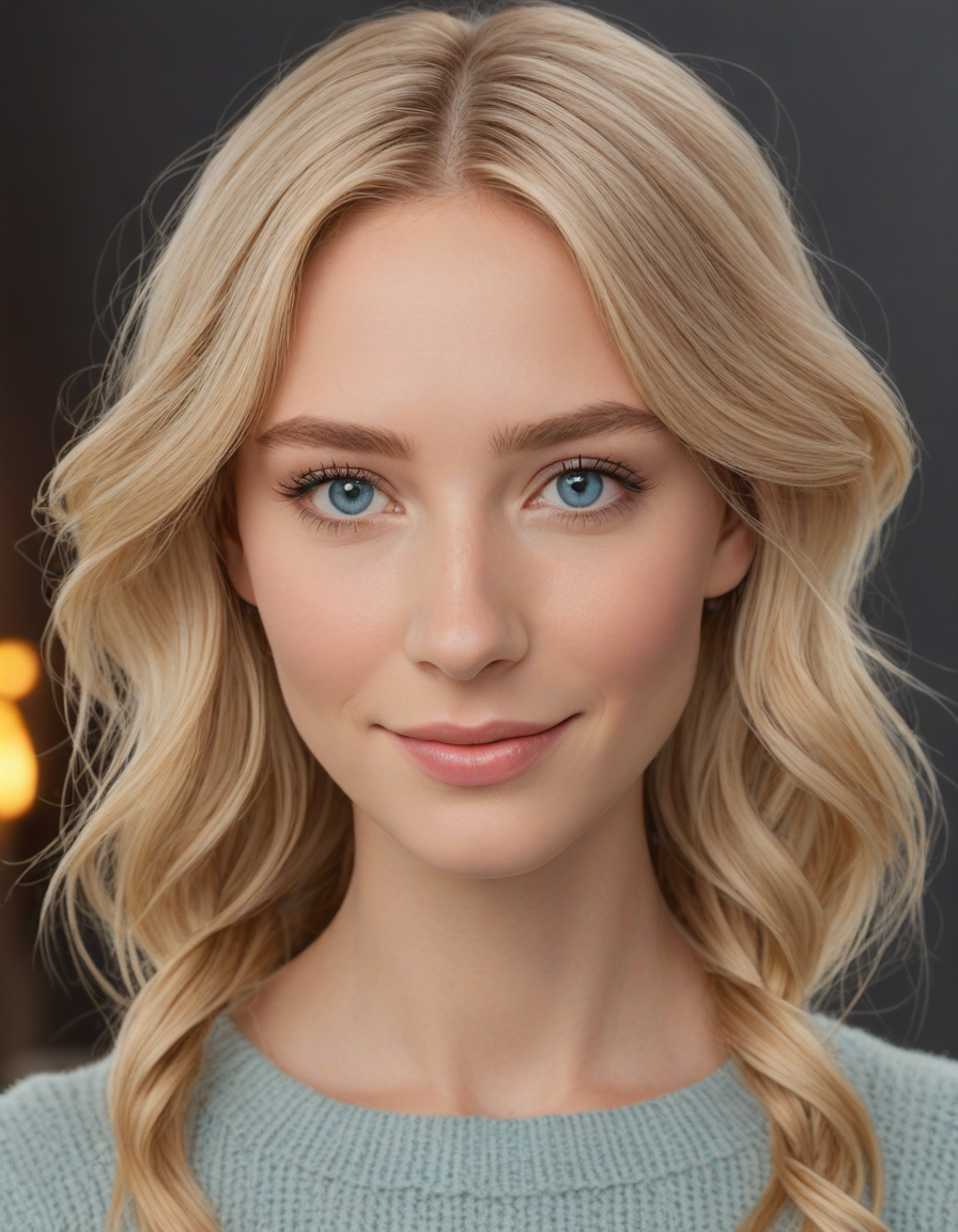 muppet, Light blue eyes, fair skin tone, high cheekbones, soft jawline, slender nose, fine hair texture, oval-shaped face, subtle brow arches, rosy cheeks, delicate lip shape, smooth skin texture, minimal facial hair, light blonde or brown hair, prominent forehead, narrow face structure, long eyelashes, natural blush, defined cheek contours, graceful neck line, ethereal facial glow, wispy eyebrow texture, cool skin undertones, translucent skin sheen, elegant nose bridge, soft facial angles, harmonious facial symmetry, passionate, pleased