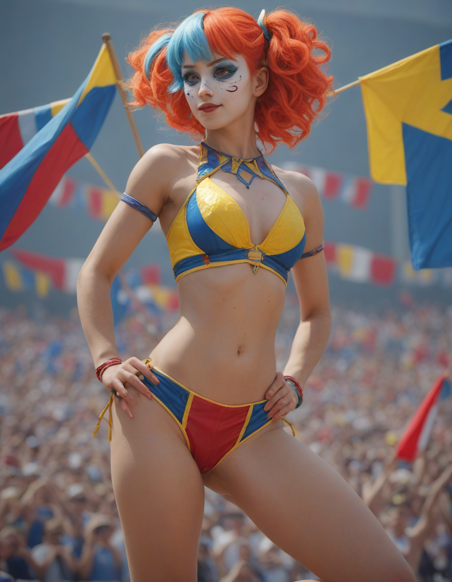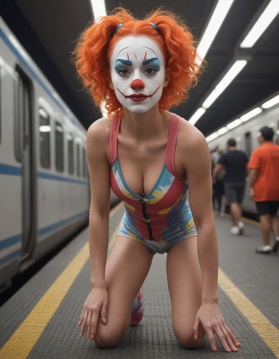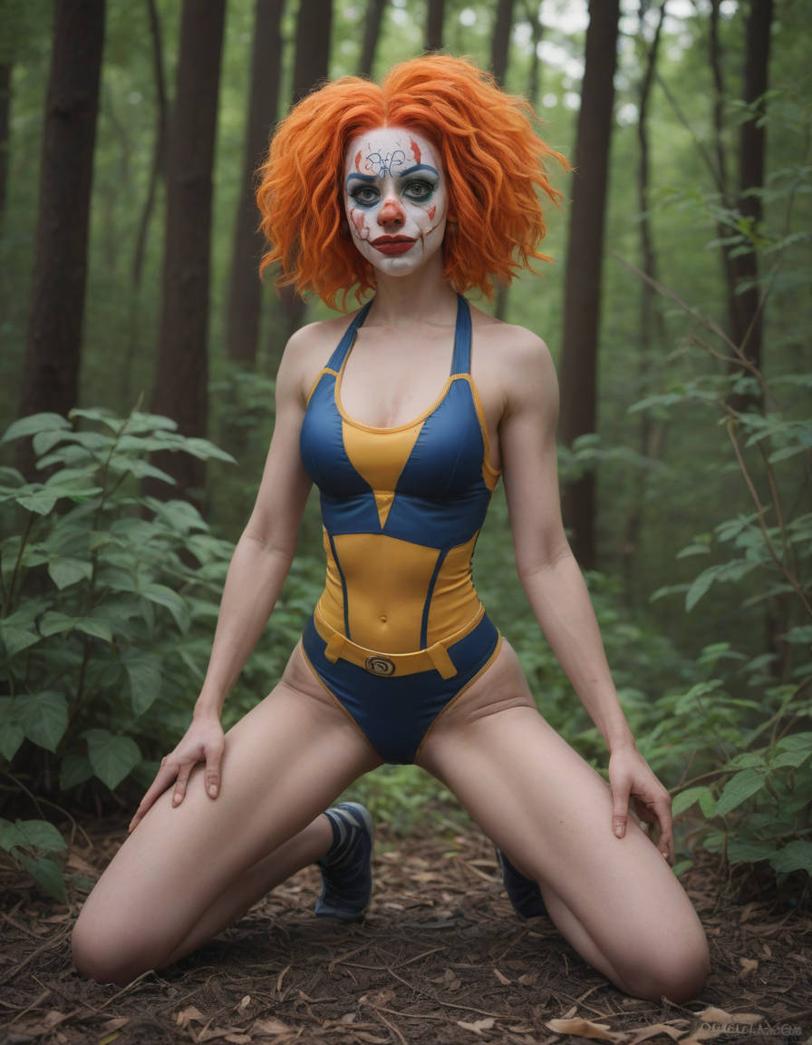 clown, voxels, radiant beauty, Scrutinizing, wearing cosplay outfit, weary expression, gymnast tumbling, muscular physique