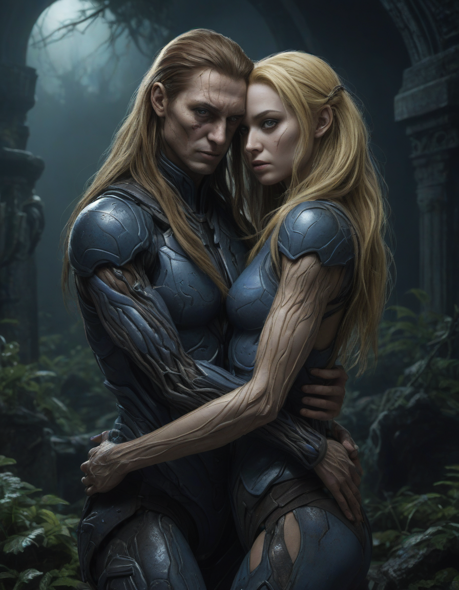 doom 3d, banshee, hugs embracing tightly, Bloodshot eyes, blue, symetrical, symmetrical, decadent feast