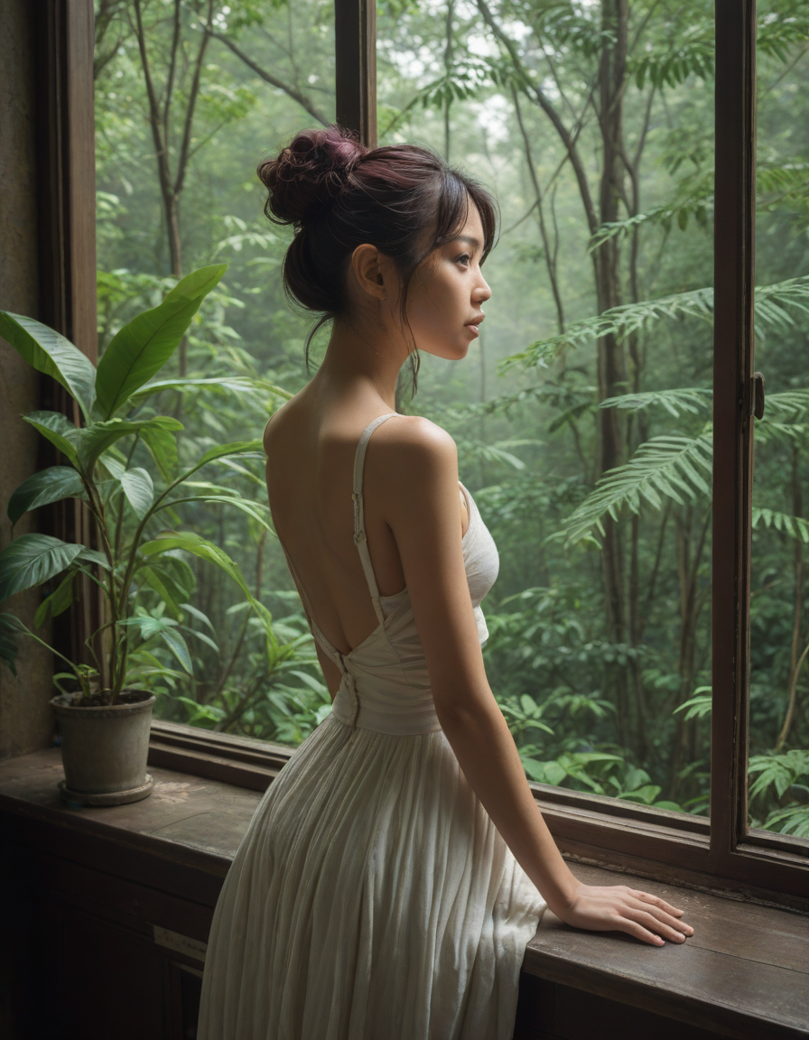 Leaning on window sill, Steamy jungle, thick with humid air, overenthusiastic, Unhinged