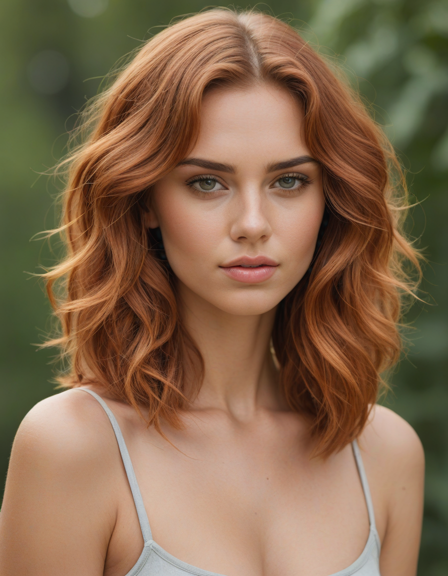 puffed out cheeks, High-arched eyebrows, pronounced cheekbones, very thick full lips, thick full lips, lip fillers, narrow facial structure, small chin, pointed nose tip, deep-set eyes with visible upper eyelid space, prominent jawline, smooth forehead, elongated face shape, subtle eye creases, thin nose bridge, voluminous cheek appearance, defined lip contour, sculpted facial silhouette, soft nasolabial folds, high forehead, delicate ear shape, refined jaw angle, sleek facial contour, radiant skin texture, luminous eye reflection, sculpted eyebrow tail, accentuated cupid's bow, pronounced chin dimple, light-catching cheek highlight, defined eyelid crease, long eyelashes, symmetrical face balance, graceful neck line, airy eyebrow density, contoured cheek shading, polished skin finish, captivating gaze, structured nose profile, gleaming skin surface., Sunburnt shoulders, aviator sunglasses, blushing beauty, short curly red hair