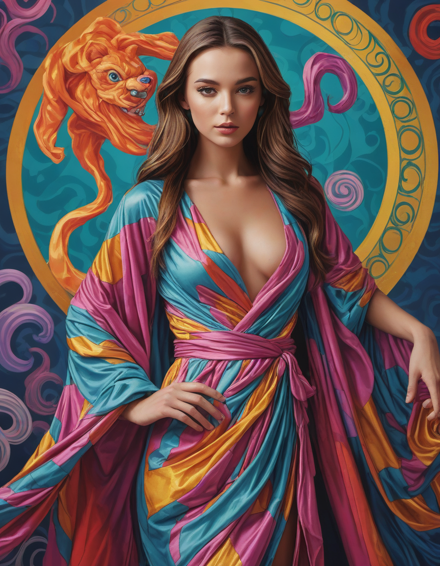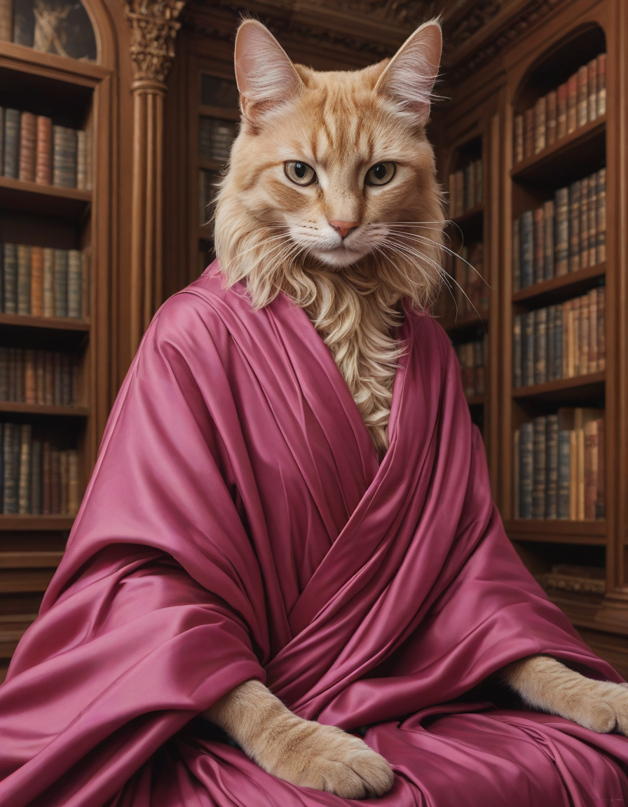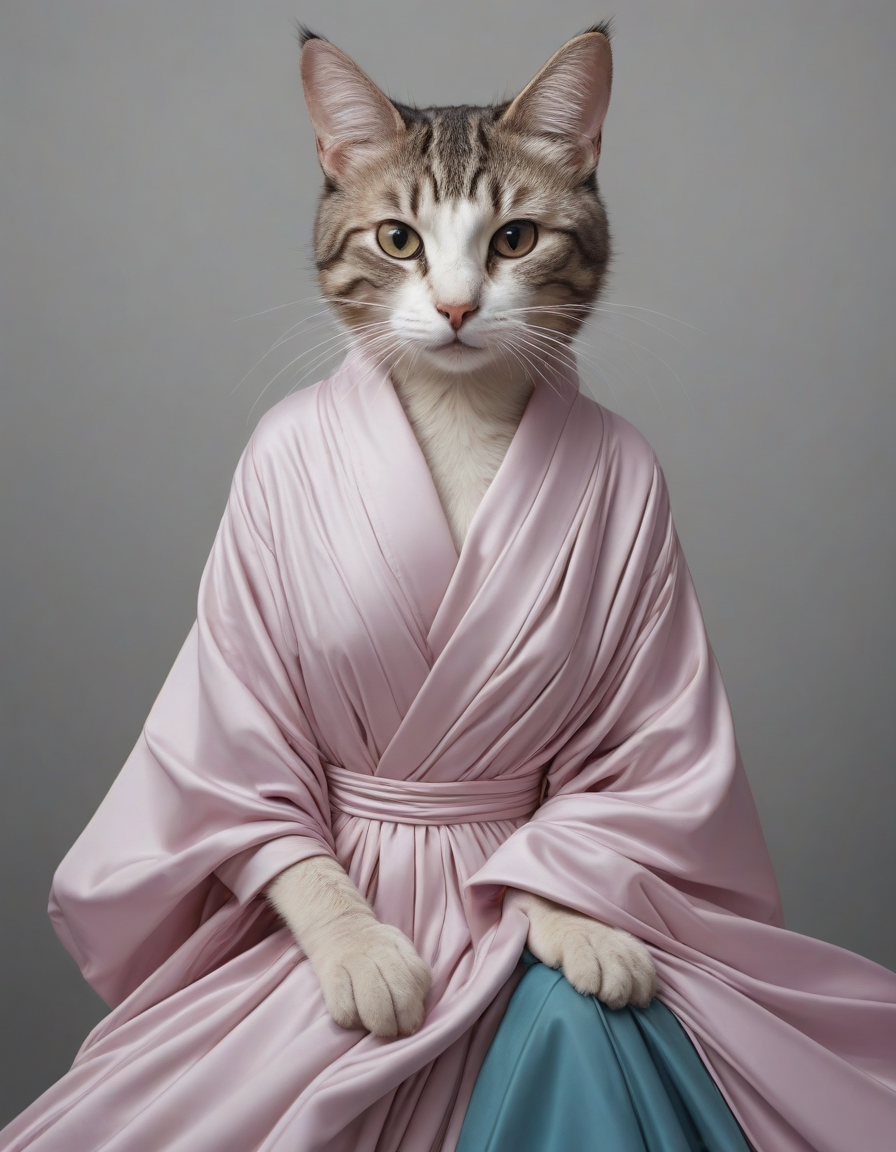 pop art, elegantly draped rich crinkled robes swirling gracefully, cat, perfect