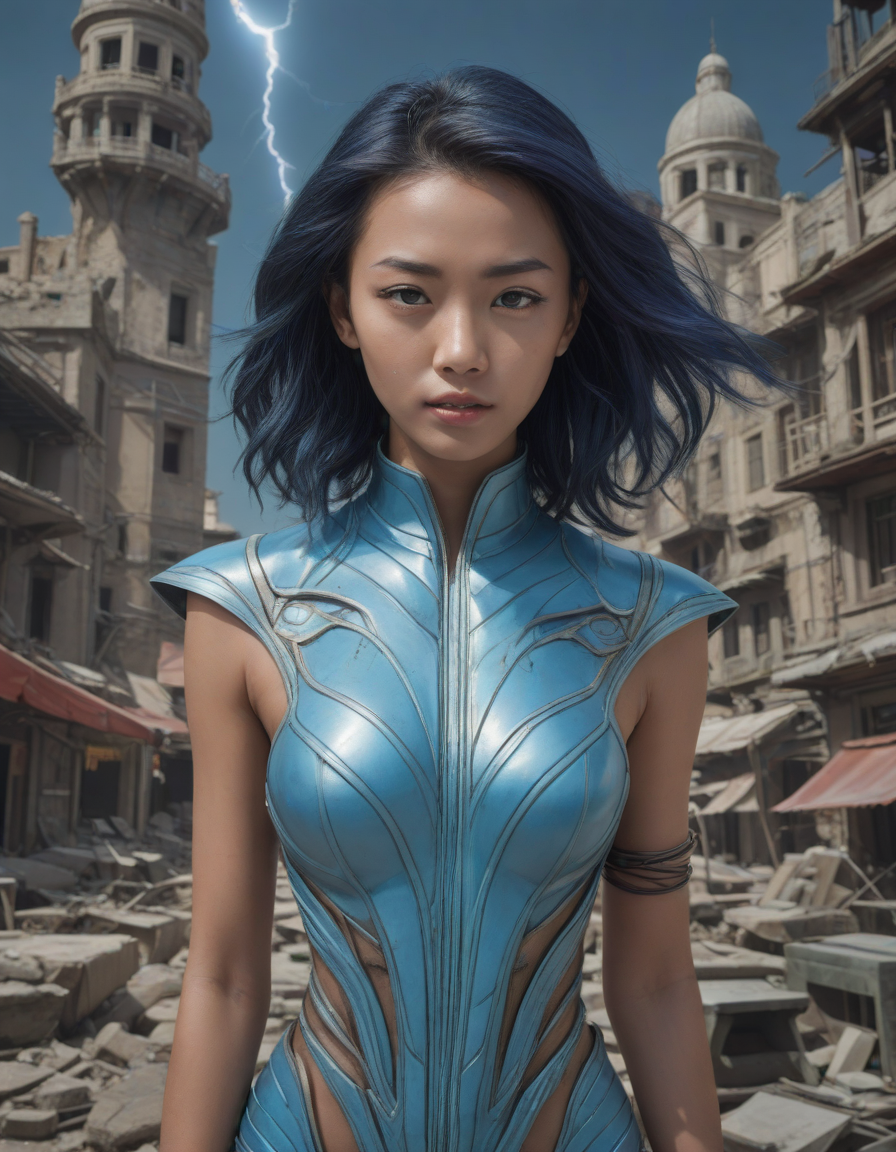 casting a spell, utopian paradise, laugh, lightning flashing, Unhinged, light blue colored iris pigment, light blue colored eyes, blue-iris-color, blue-eye-color,, scenic mesa, Tron-like