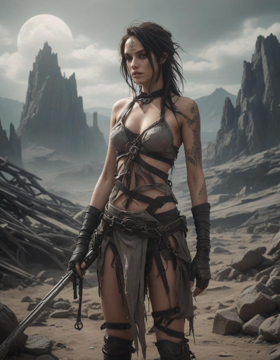 Tattered clothing, weilding a one-handed weapon in both hands, one-handed weapon, weapon, , eerie, post apocalypse, angelic vision, Seductive, evoking dark desires, Sun-kissed skin
