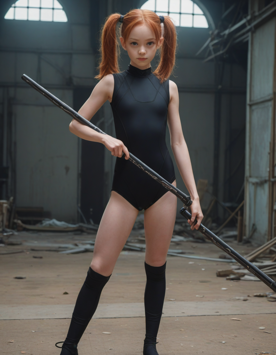 wearing sleeveless leotard, wearing one peice clothing, leotard, sleeveless, , Wielding a one-handed weapon in both hands, one-handed weapon, weapon,