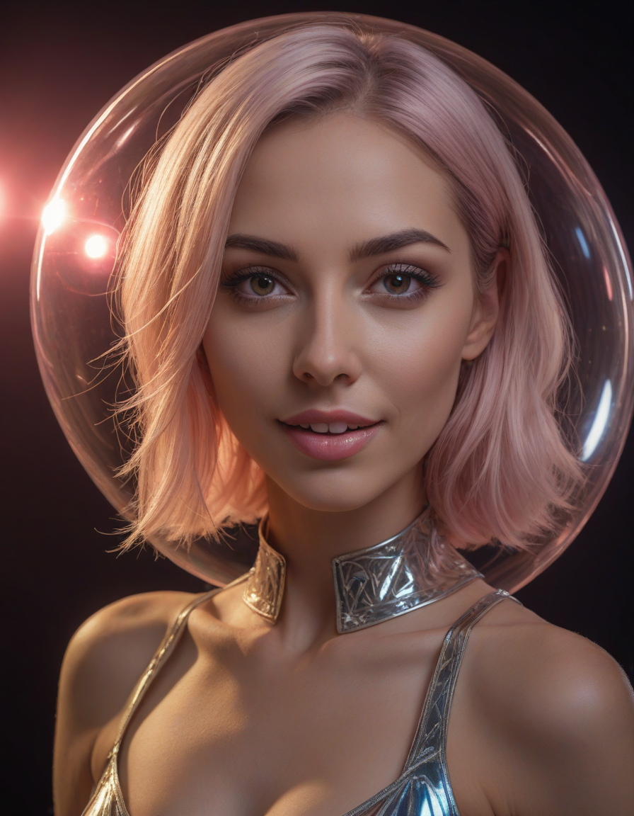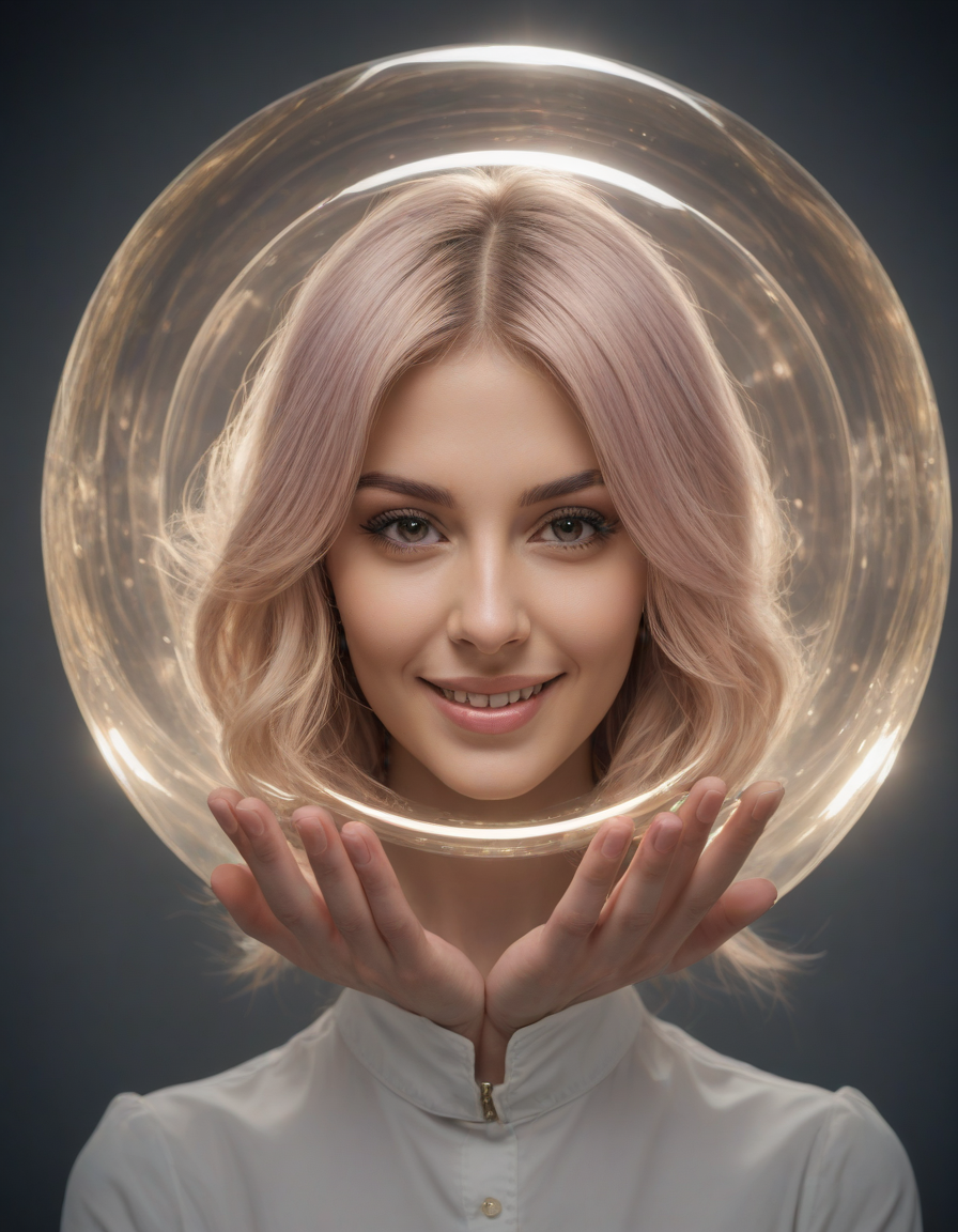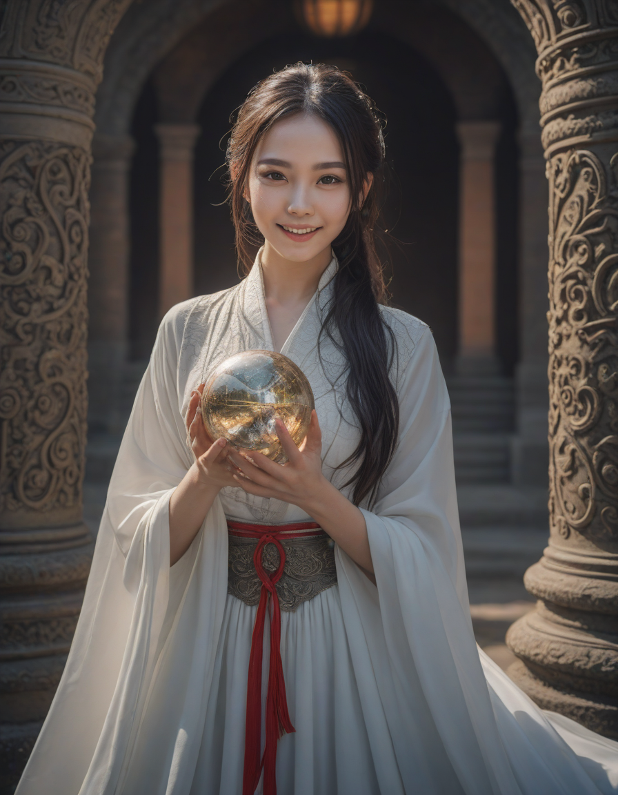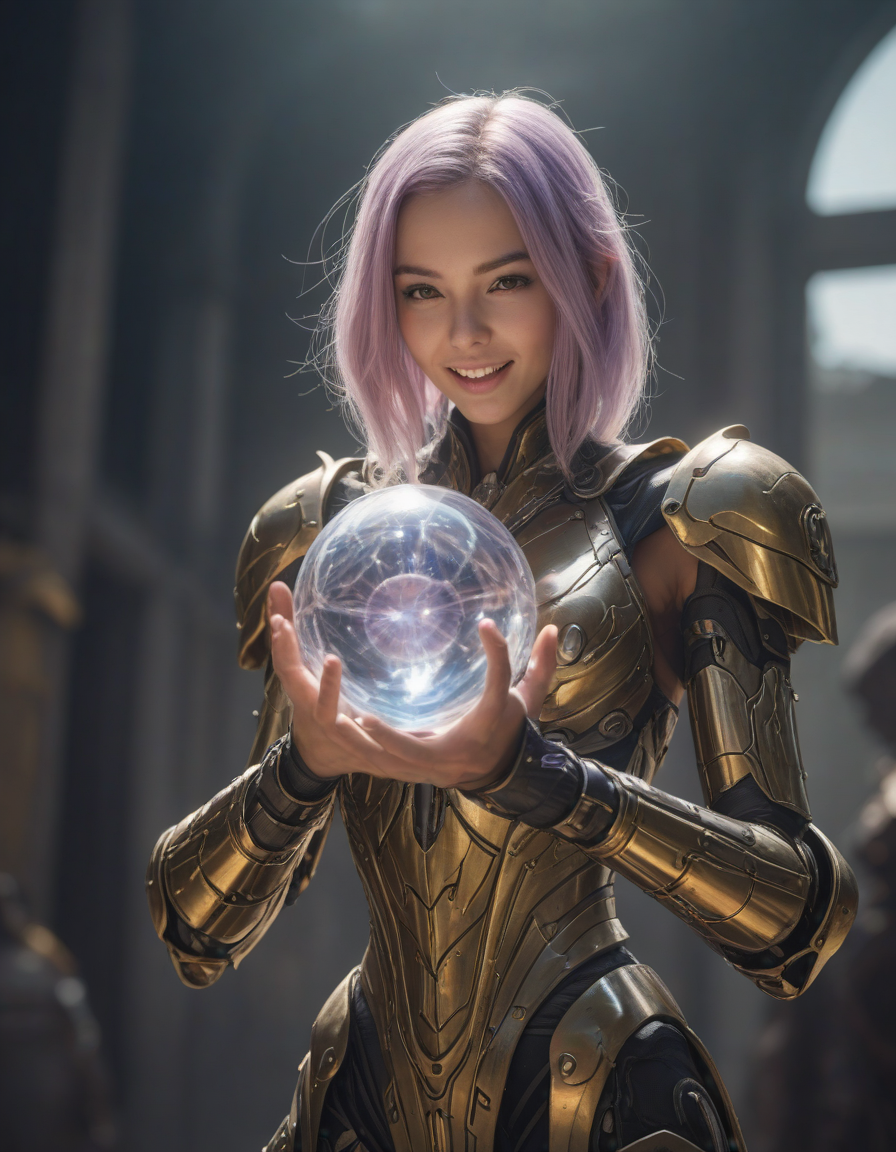 Crystal Ball Photography, gleaming smile, highres, looking at viewer, attractive, symetrical, Blinding sunrise, Blinding speed, A voluptuous form, magical energy swirling around
