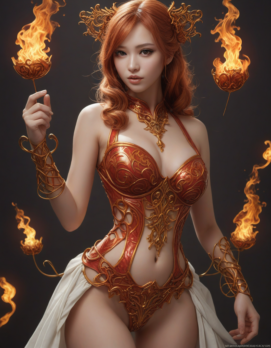 fire elemental, optical illusion dancing glyphs, fake round large breasts, round breasts, perky breasts, very perky, silicon-enhanced breasts, artificial breasts, flawless breasts, enhanced bust, silicon implant styled breasts,