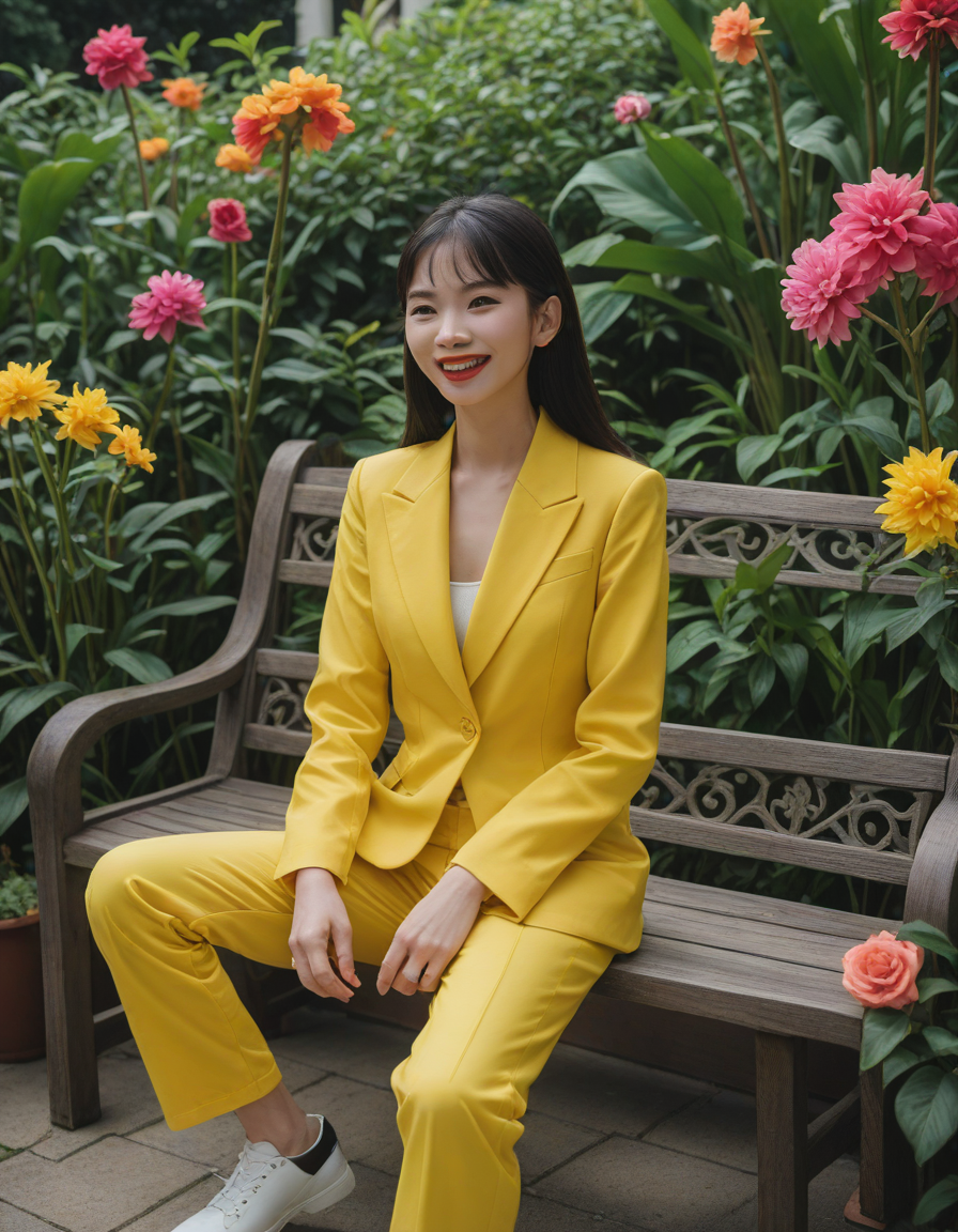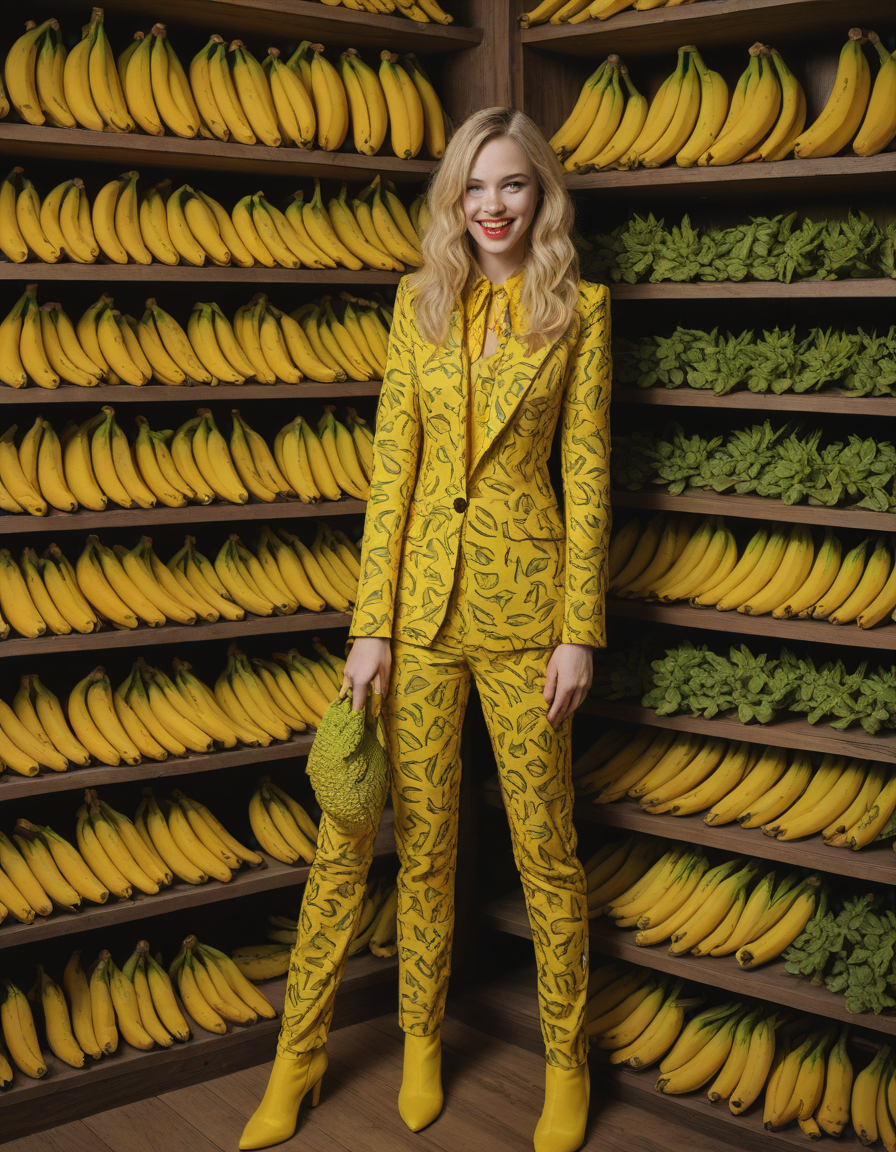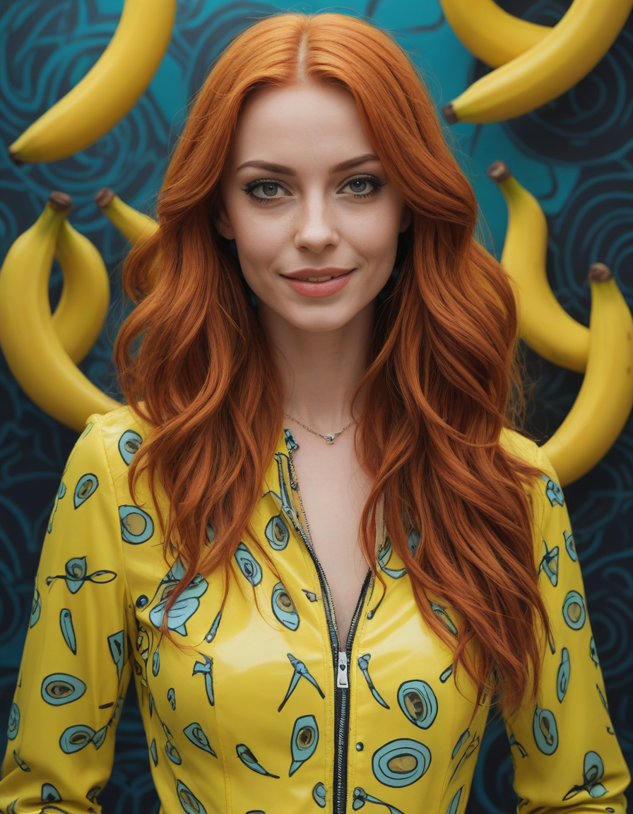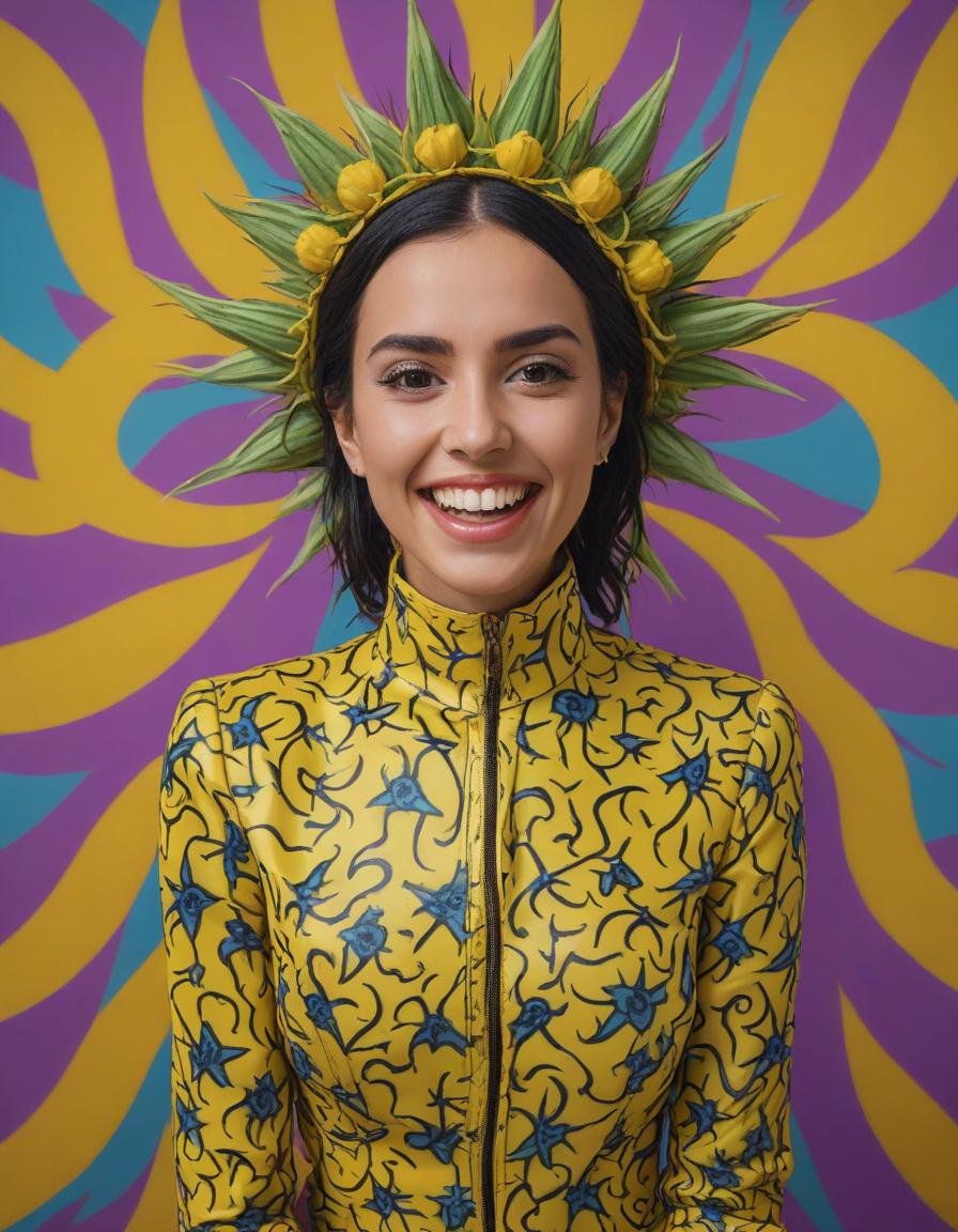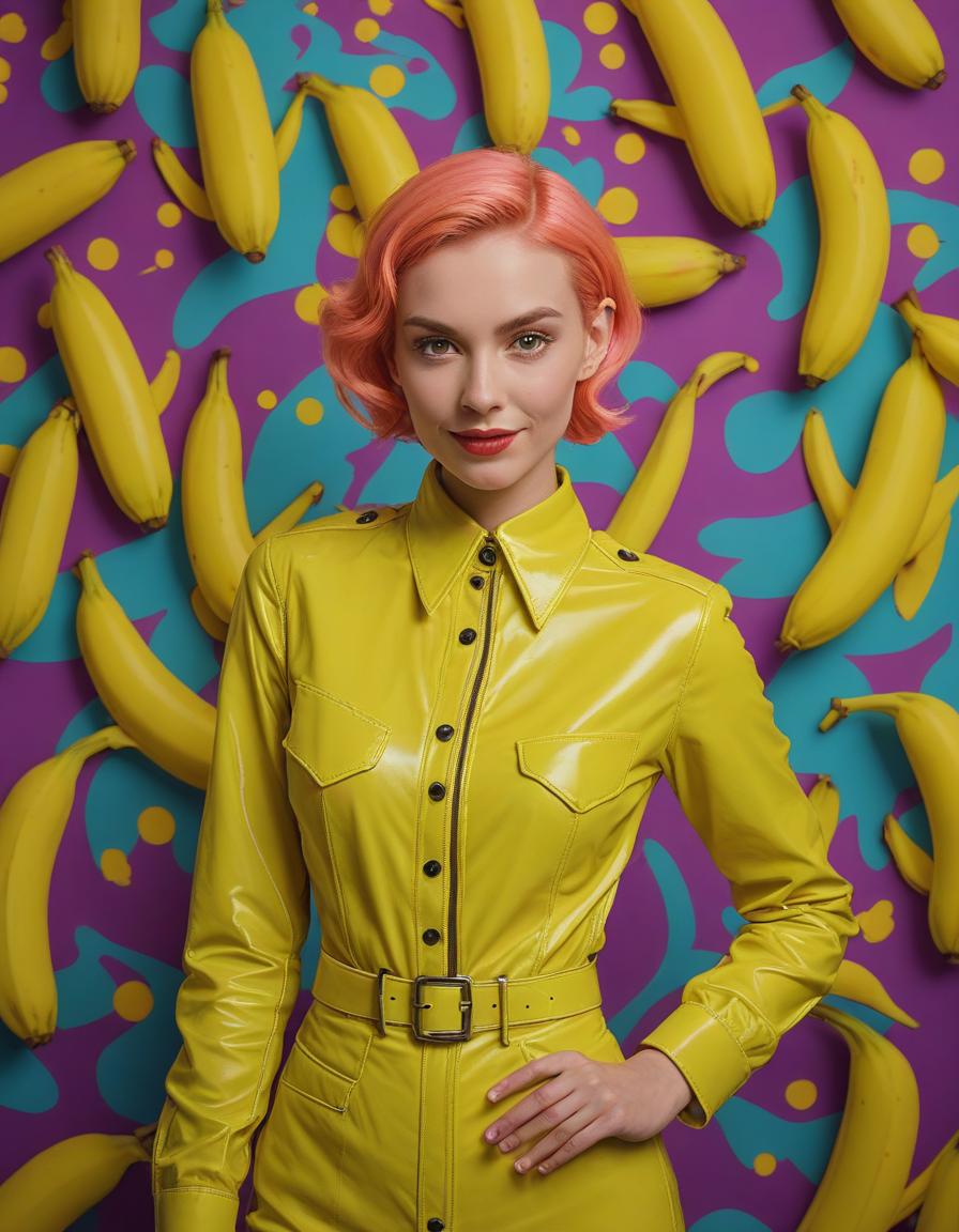 smiling faces, wearing a banana suit, Gothic, but chic as heck, a mysterious hologram, bashful embarrassment, majestic, vibrant, colorful pop art piece, demon