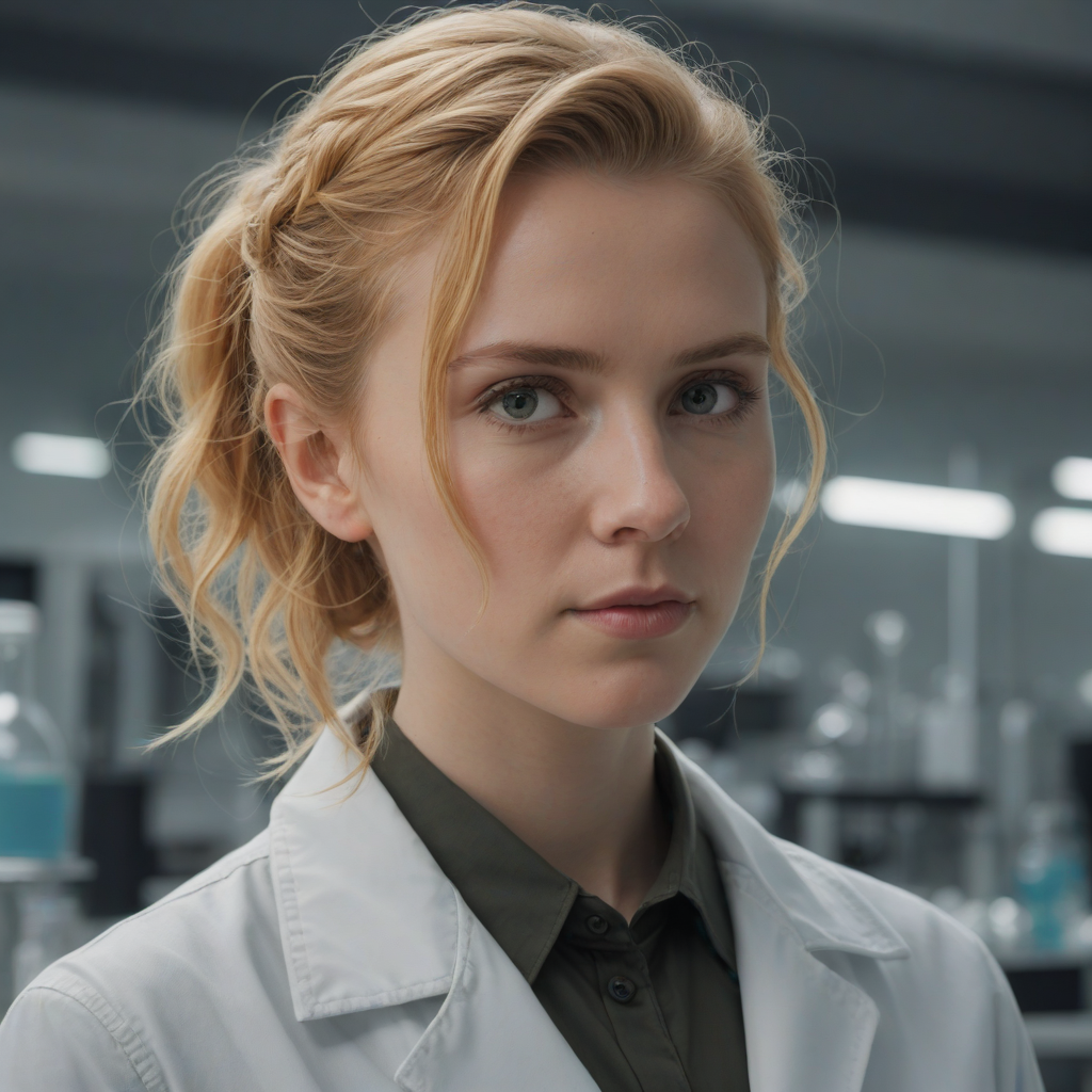 in a lab, Bittersweet indie graphic novel aesthetic, playful teasing, The adrenaline rush of bungee jumping off a cliff, short curly red hair, deft movements