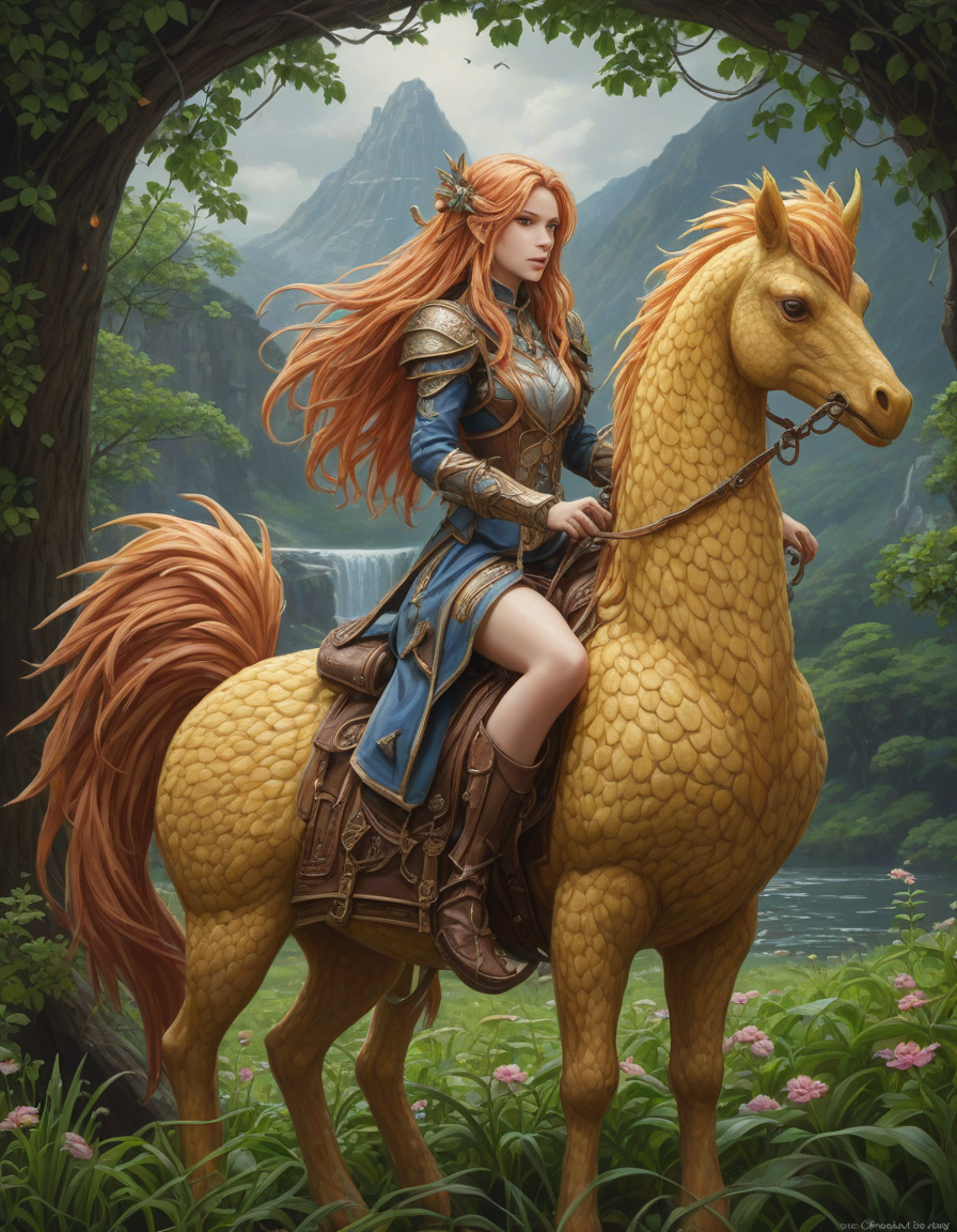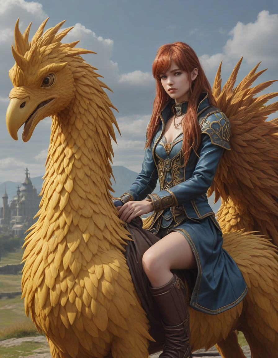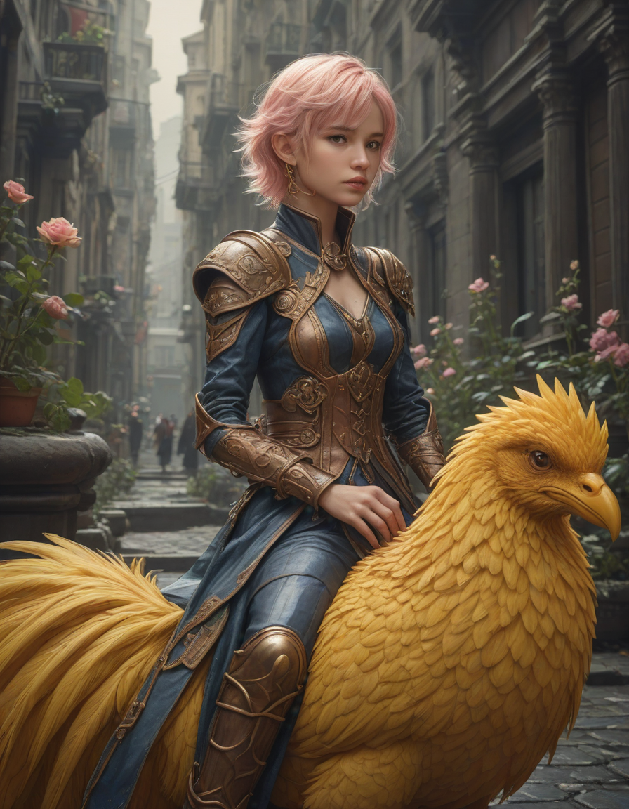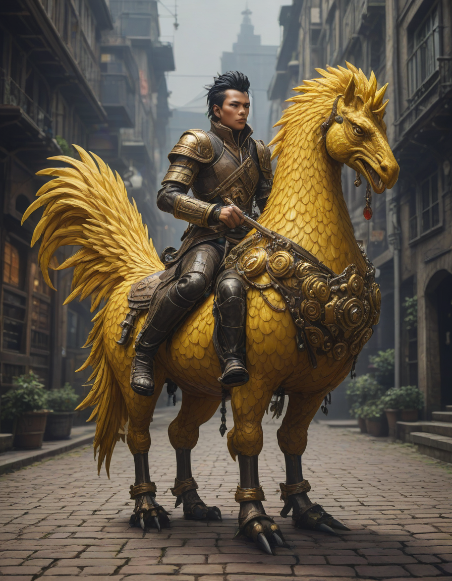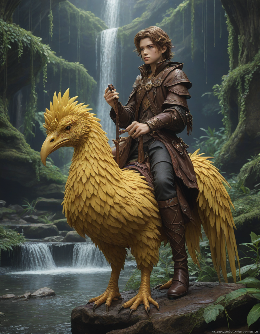 gloomy, downcast face, masterpiece, Riding a Chocobo, mighty sorcerer, Immaculately Tidy, pixel art, Transfixed, in love, Prismatic renaissance