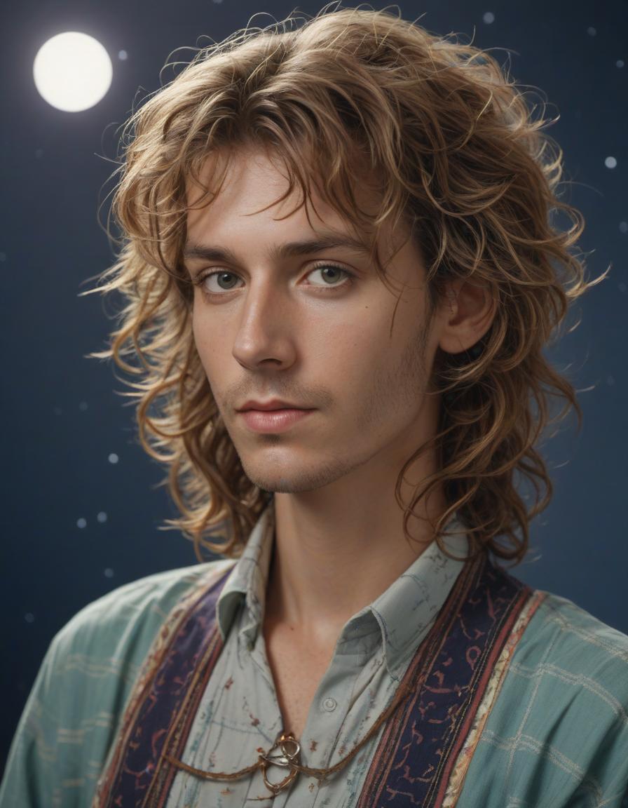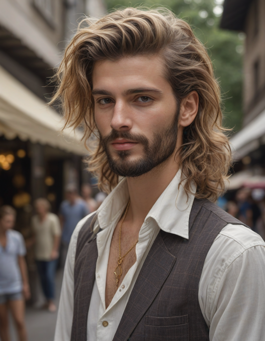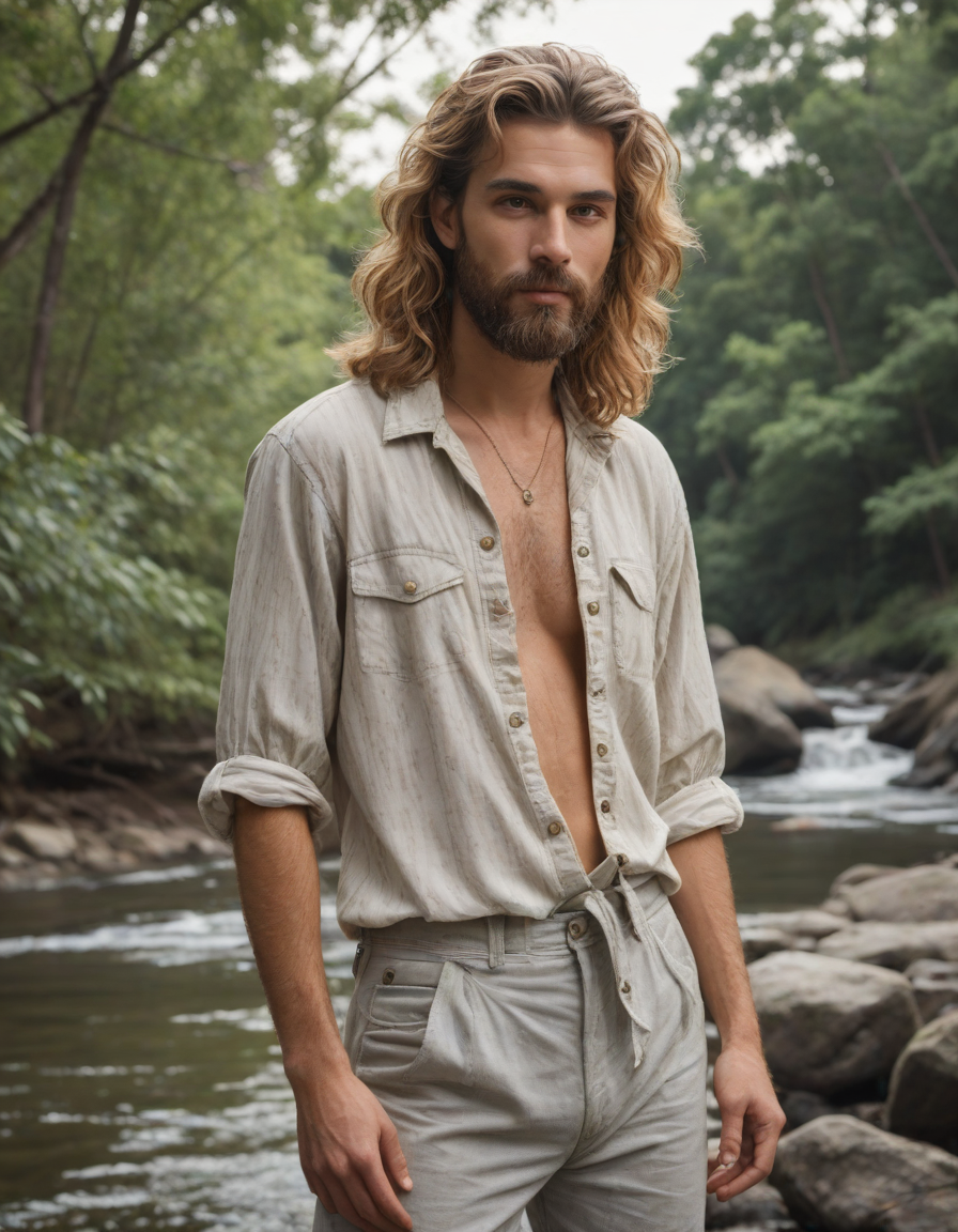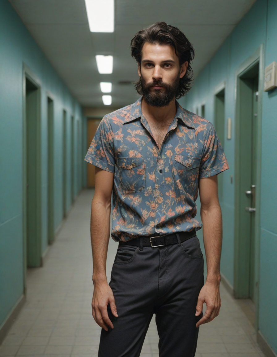 Bliss, New Romantic 80s clothing, a man with a wild, unkempt beard