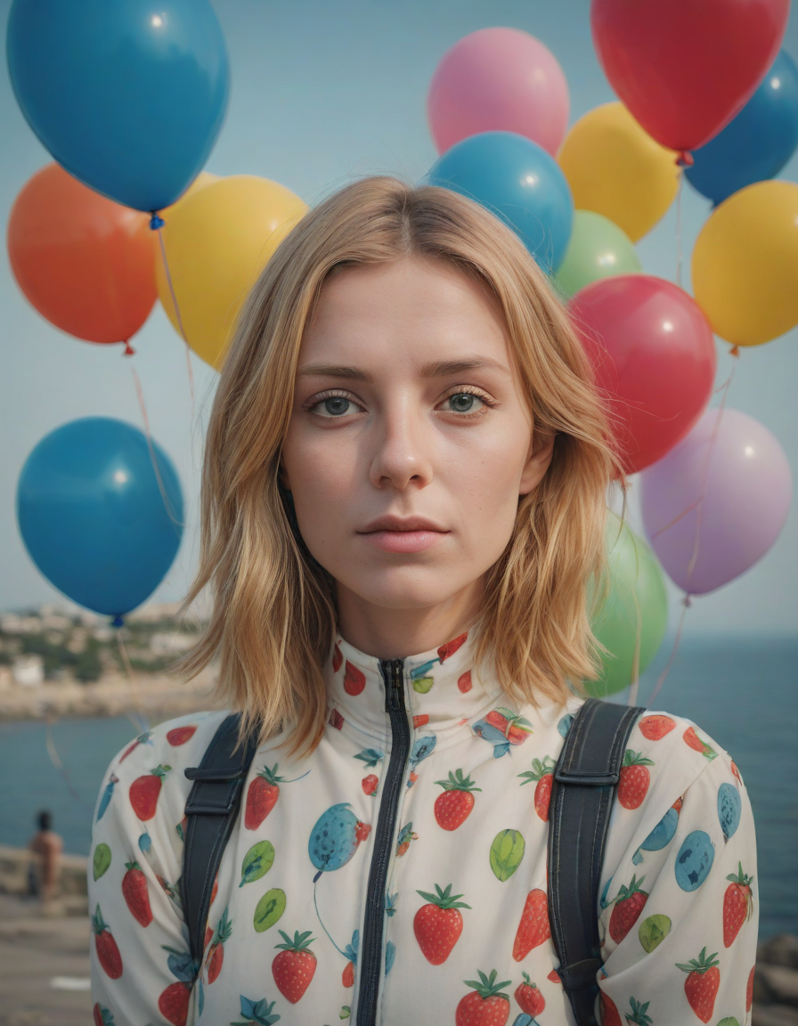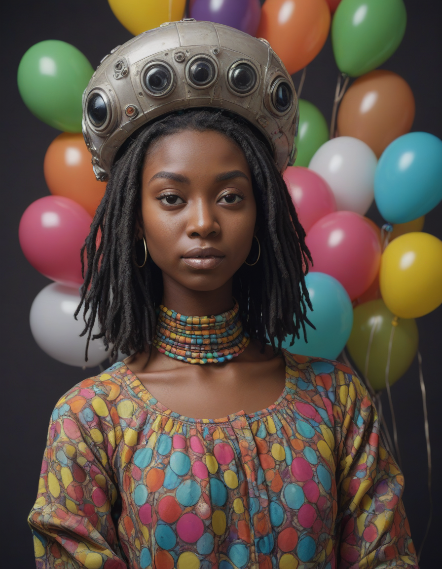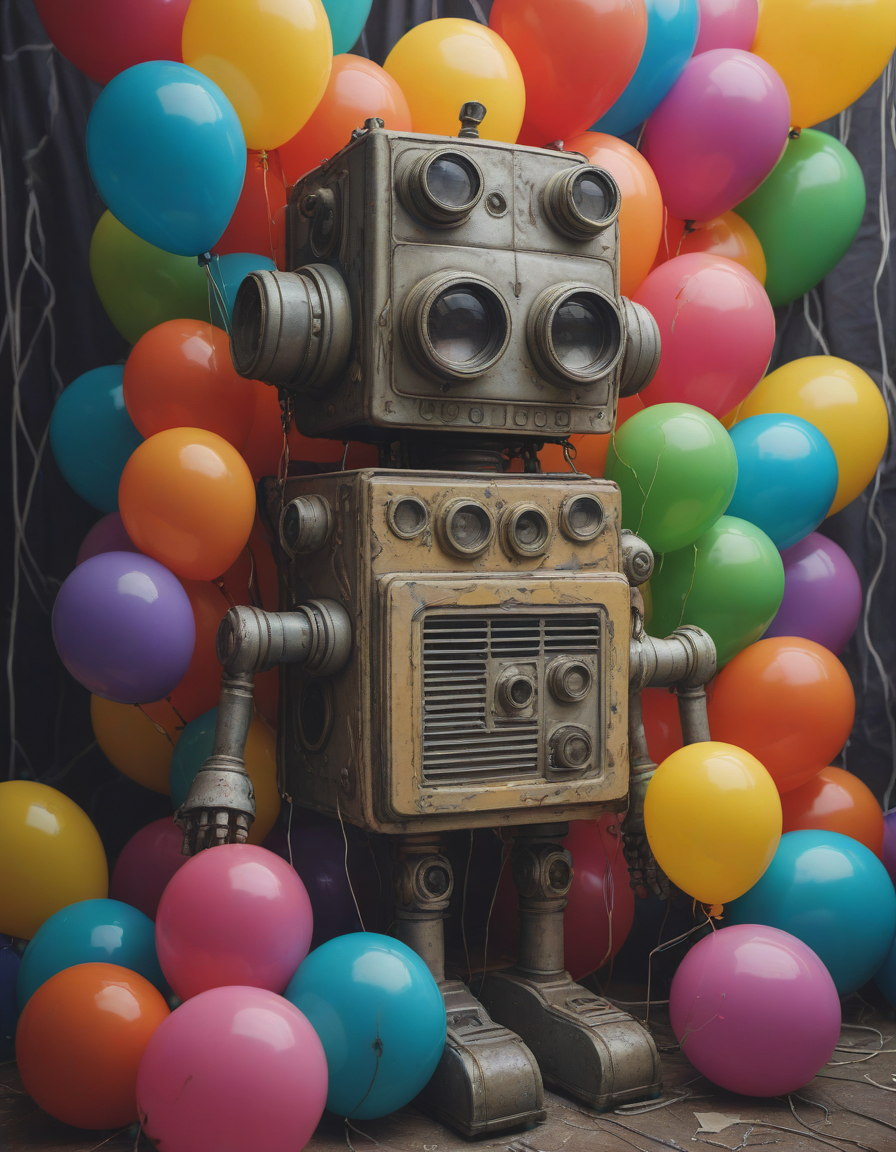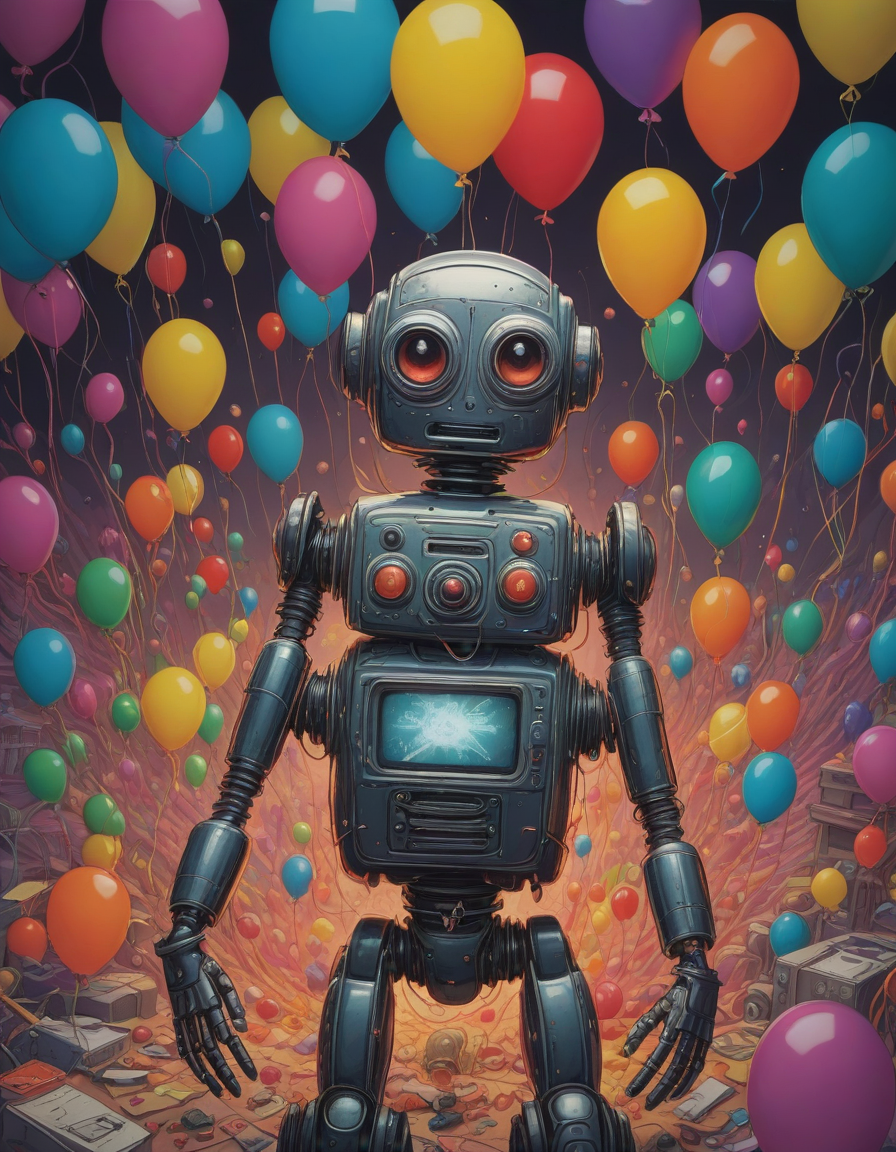 Hapless robot, Focused lights, watching television, hugs embracing tightly, psychedelic trip, surrounded by balloons, acting smug