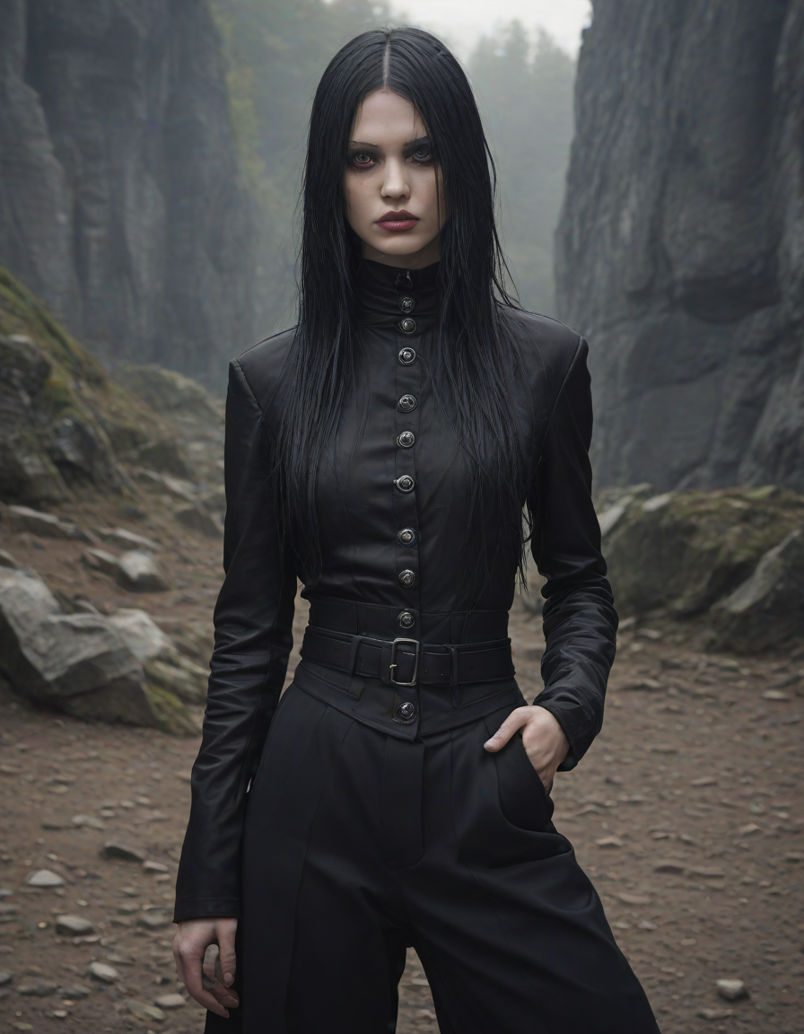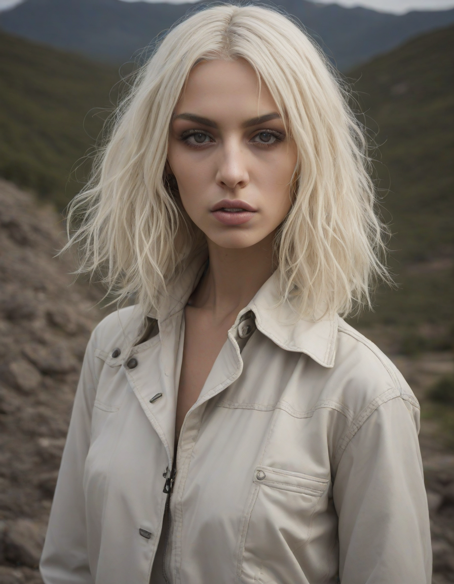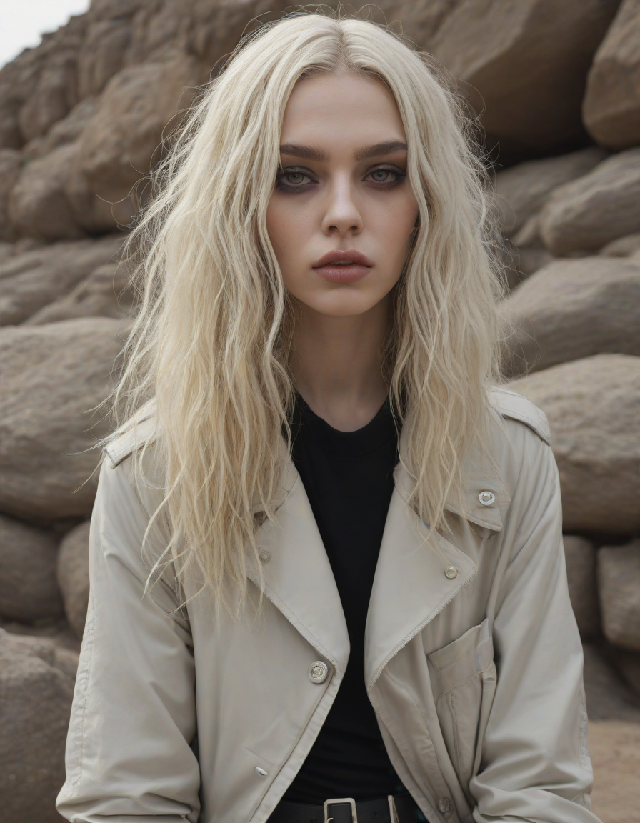 Blinding, hungry, balenciaga, gothic individual with pale makeup, Rugged terrain