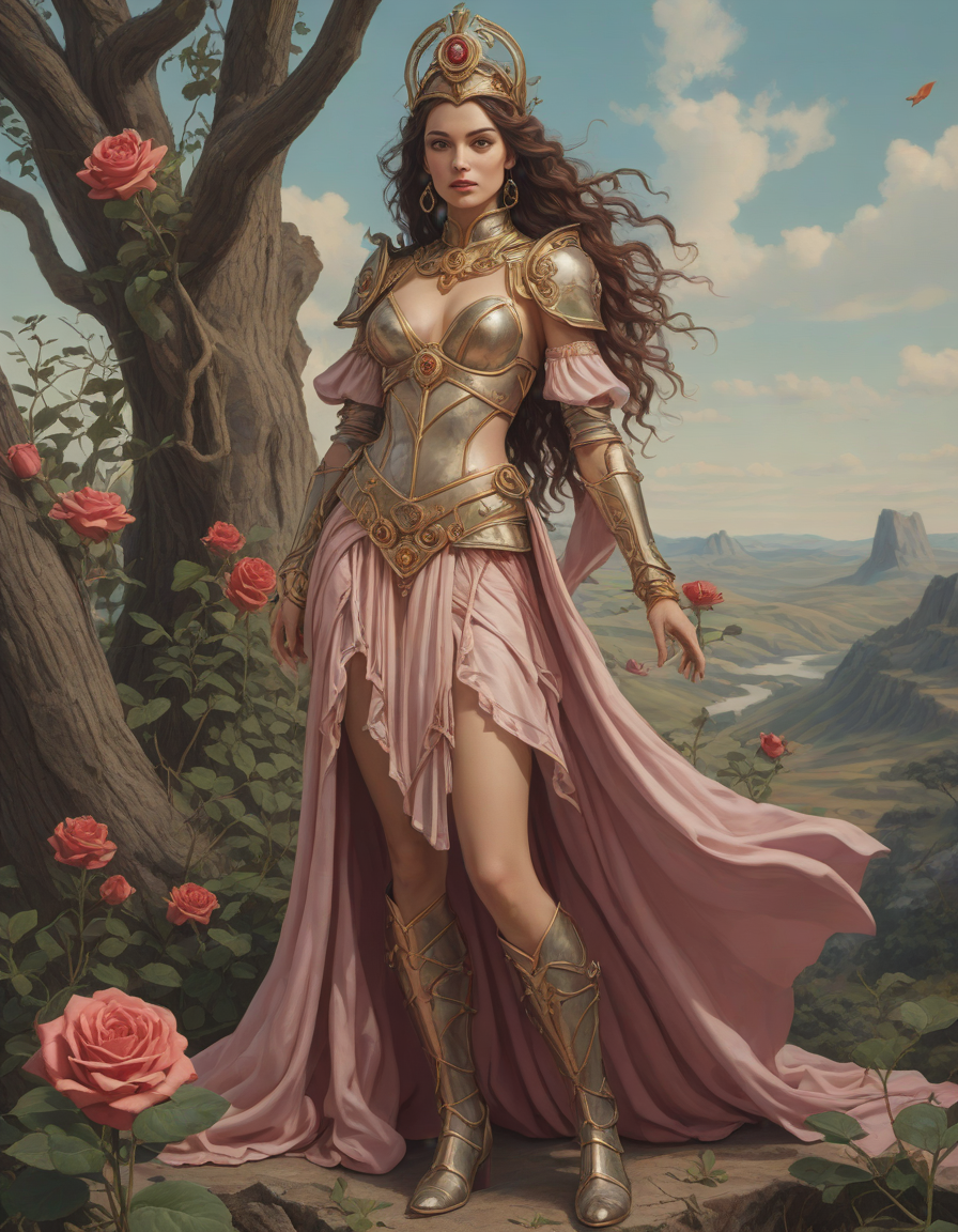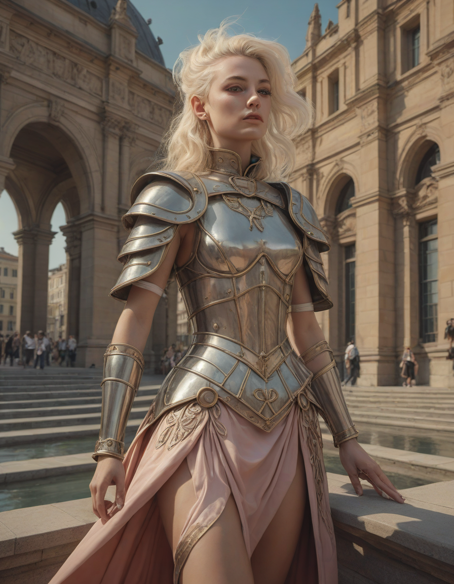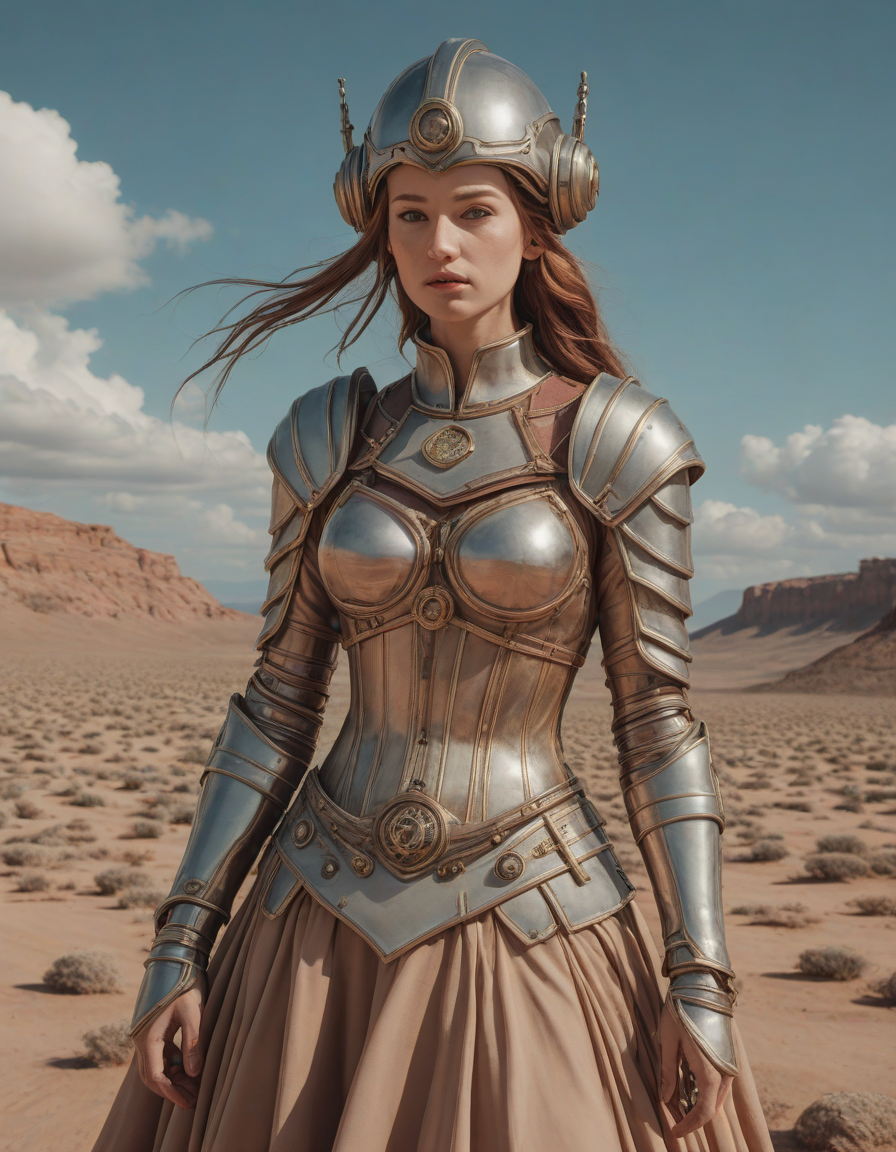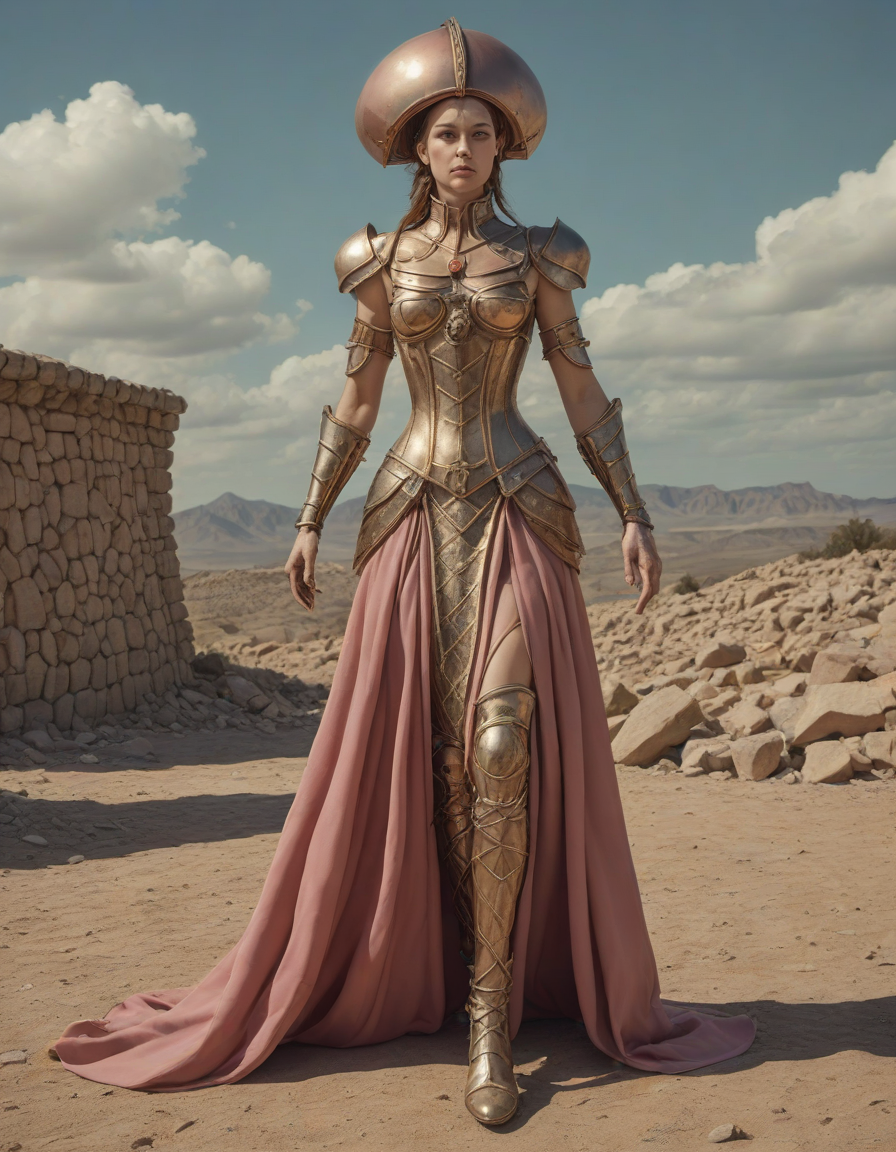 high quality, best quality, highly detailed, high quality, realistic, exceptional quality, exception, masterpeice, breathtaking, logical, logical detail, , Rose colored long dress flowing in the wind in a curious way, voxels, Wearing helmet, Wearing breastplate, Wearing gauntlets, Wearing greaves, Wearing pauldrons, Wearing vambraces, Wearing cuisses, Wearing sabatons, Wearing gorget, Wearing tassets, Wearing bracers, Wearing cuirass, Wearing faulds, Wearing plackart, Wearing spaulders, Wearing besagews, in the style of the painting the persistence of memory by Salvador Dali, Bizarrely