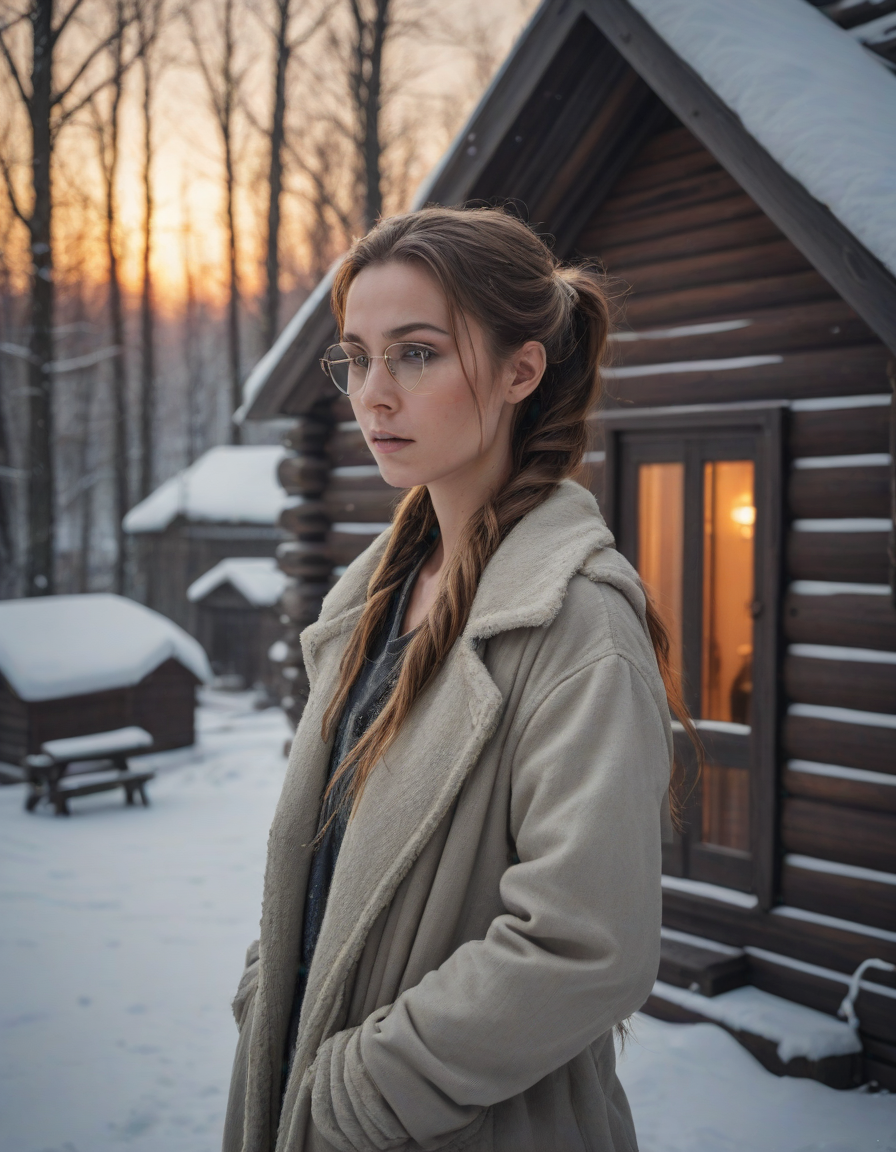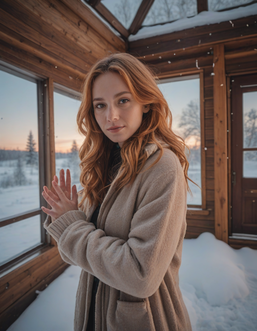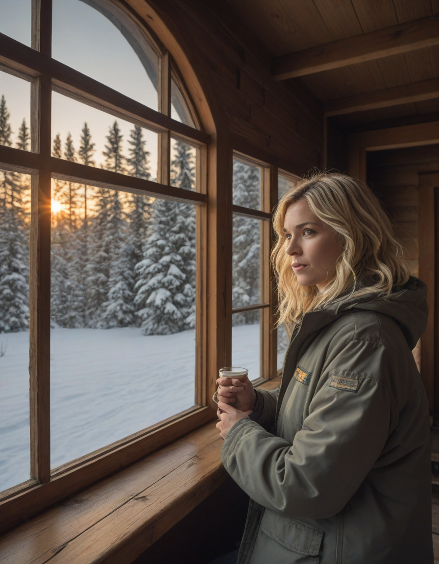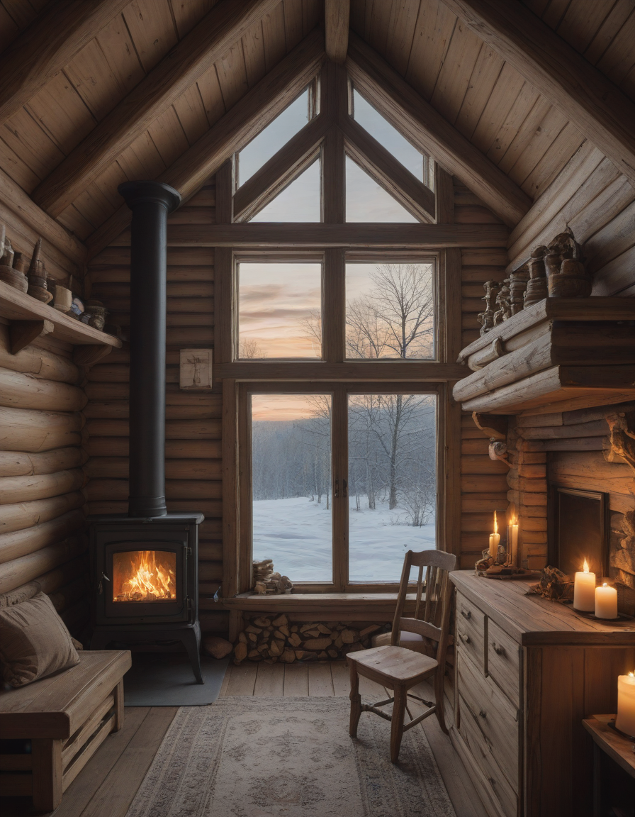 trapped in ice, cozy in a cabin with a roaring fireplace while it snows outside, Blinding sunrise