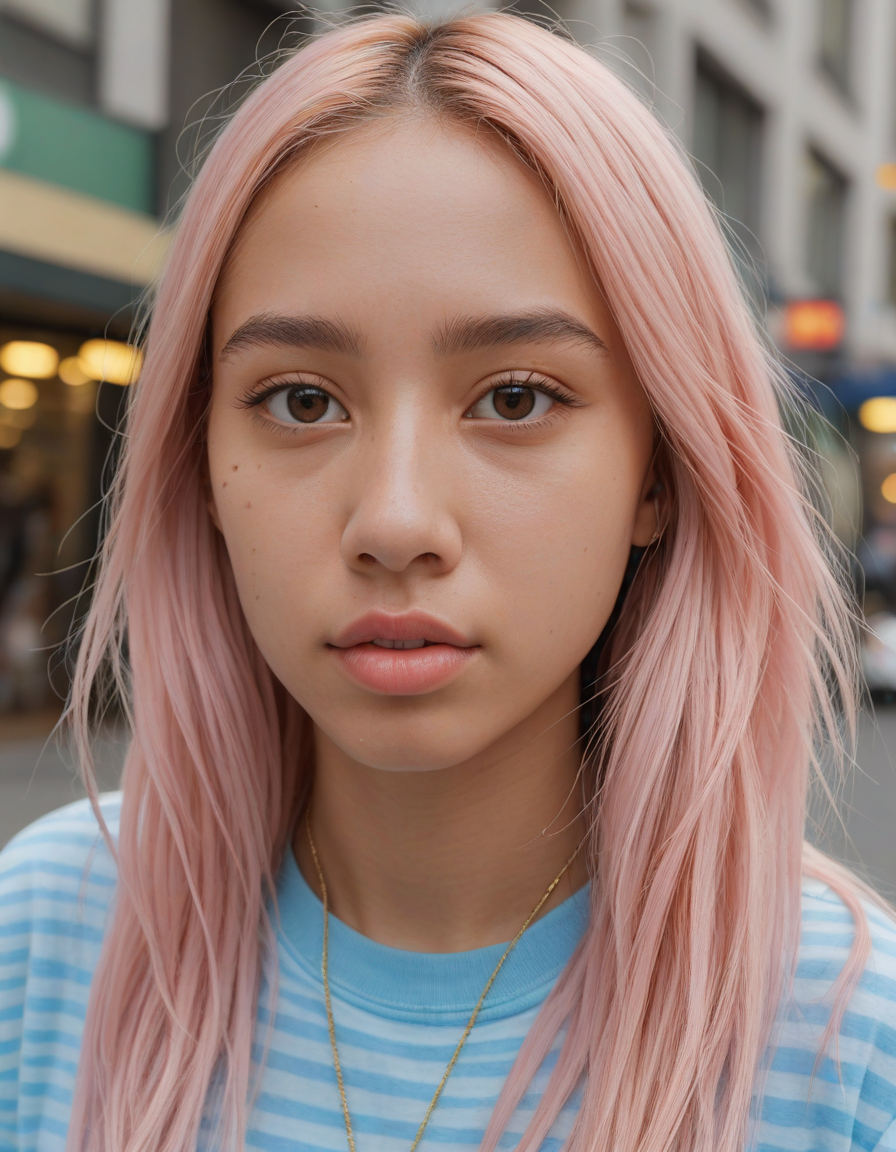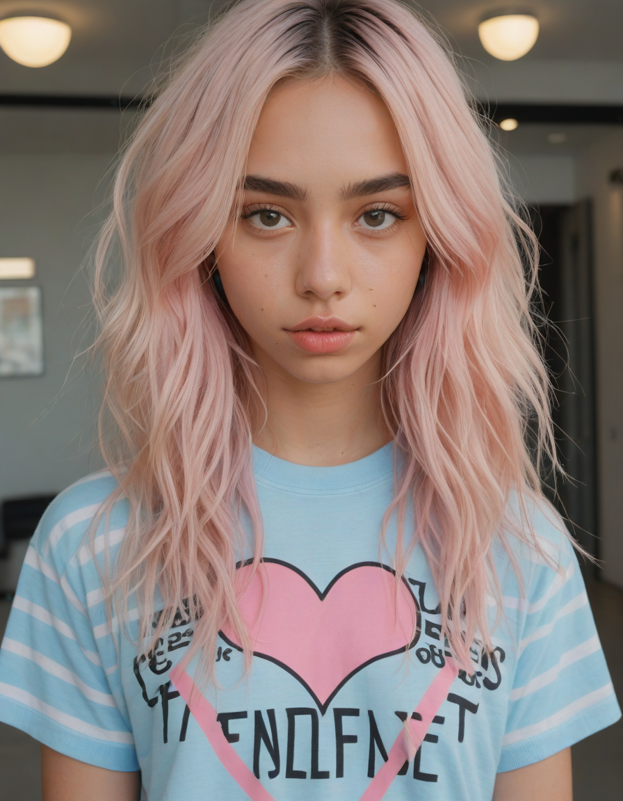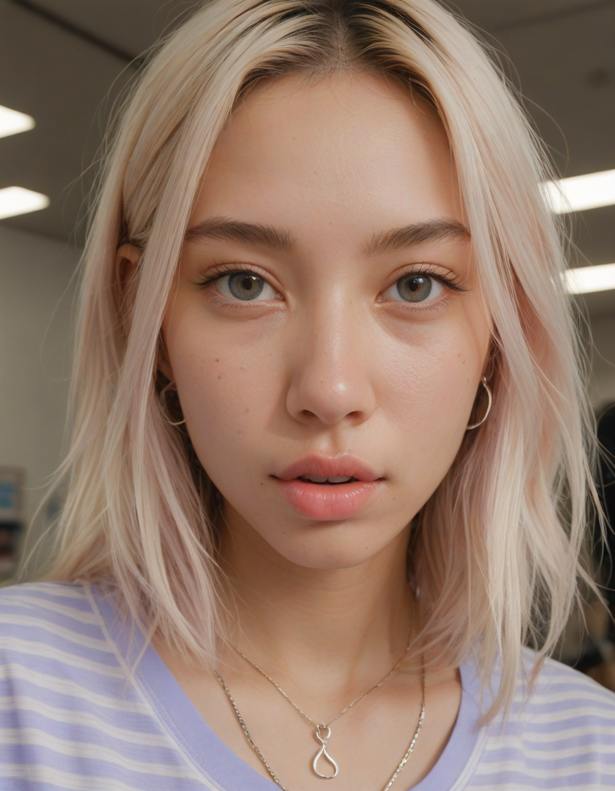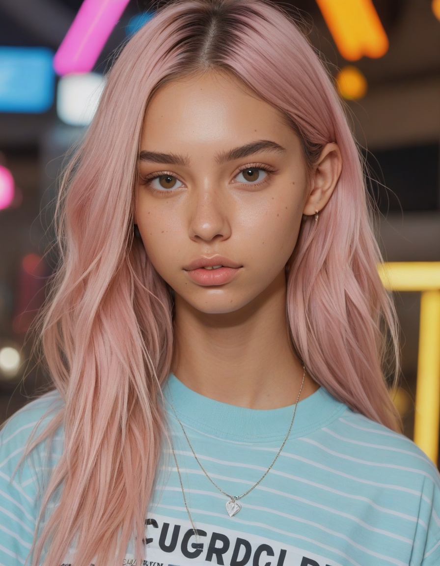 Visualize a photorealistic portrayal of an 18-year-old high school senior girl, epitomizing the e-girl aesthetic with a blend of internet culture's vibrancy and personal audacity. Clad in an oversized striped shirt under a black graphic t-shirt dress, her style is a testament to e-girl fashion's layered intricacy, complemented by fishnet tights and chunky boots. Her makeup features dramatic winged eyeliner, neon eyeshadow, and dark lipstick, with blush bringing her face to life. Accessories like silver chains and a heart pendant choker, along with pastel or neon hair streaks, enhance her playful rebellion. Standing hands-on-hips, she exudes confidence and individuality against a backdrop suggestive of e-girl life, with neon signs and string lights. This scene captures her bold identity and expressive spirit at this pivotal moment., oval face shape, almond-shaped eyes, voluminous lashes, slightly arched eyebrows, narrow nasal bridge, rounded nose tip, symmetrical nostrils, full lips, pronounced cupid's bow, slightly fuller lower lip, defined cheekbones, rounded chin, smooth complexion, softly contoured jawline, balanced facial proportions, symmetrical features, gently curved eyelids, soft brow ridge, harmonious cheek to jawline transition, subtle philtrum, delicate ear lobes, straight blonde hair, clear skin, hooded eyelids, light pink lip color, slightly pouty expression, casual pose with hand on face, slight head tilt, indoor lighting, Light blue irises, Medium-thickness eyebrows, Softly angled eyebrows, A hint of freckles across the nose and cheeks, Natural makeup, Gentle frown lines between the eyebrows, Soft nasolabial folds, Smooth forehead, Subtle dimple on the chin, Clear facial contour without distinct shadows, Even skin tone with a hint of natural pink undertones, Slightly rosy cheeks, Tapered jawline, Fine hair texture with gentle waves, Youthful appearance with soft facial features