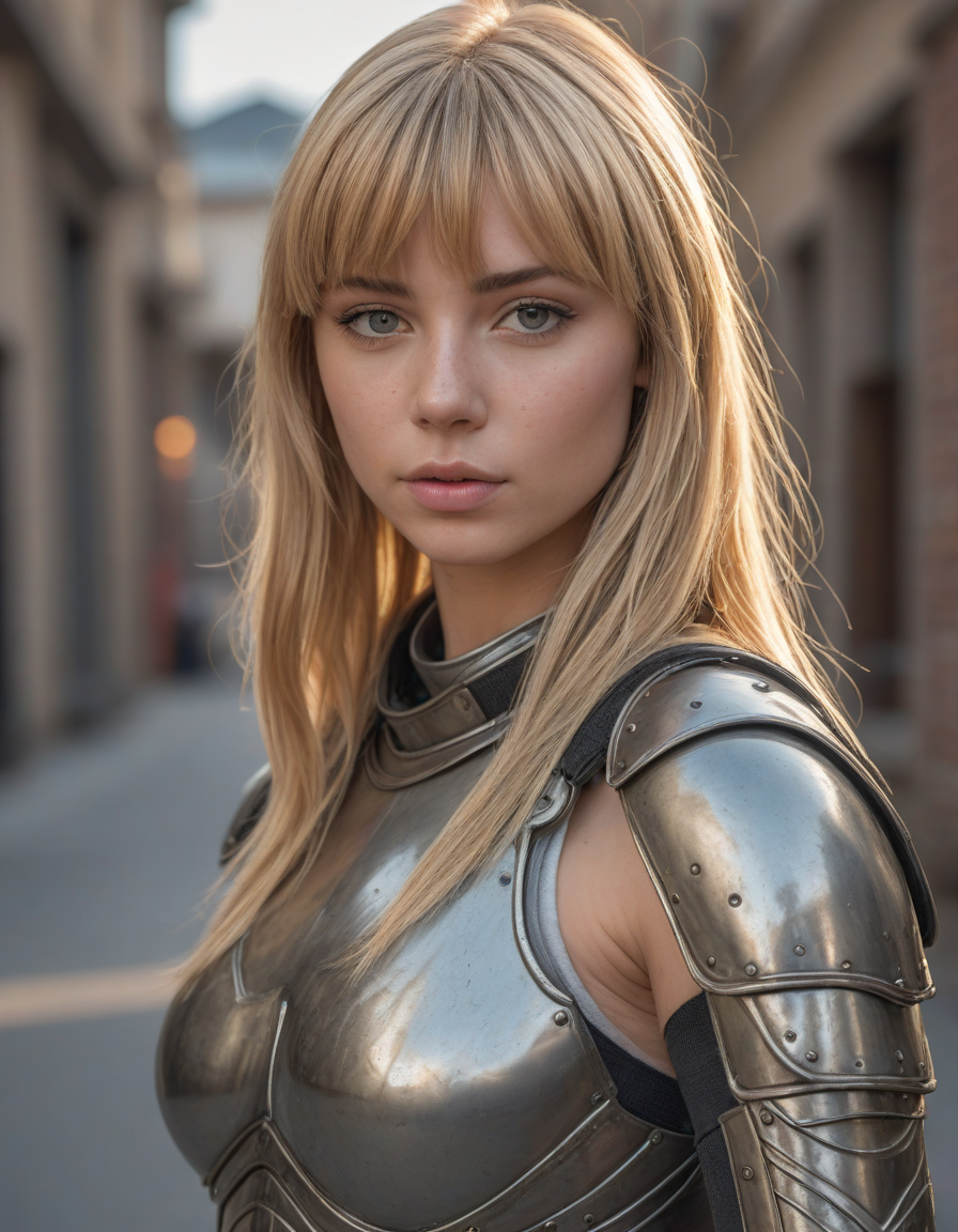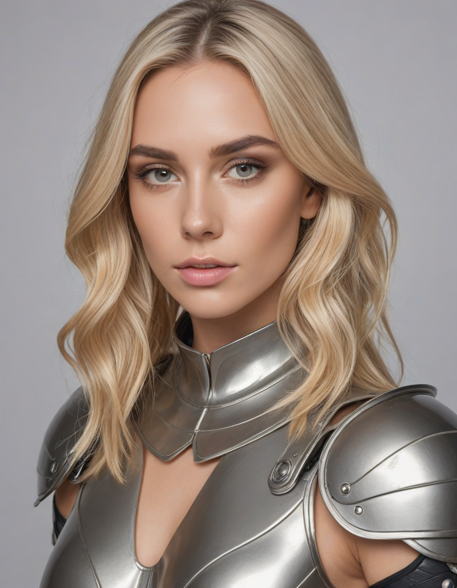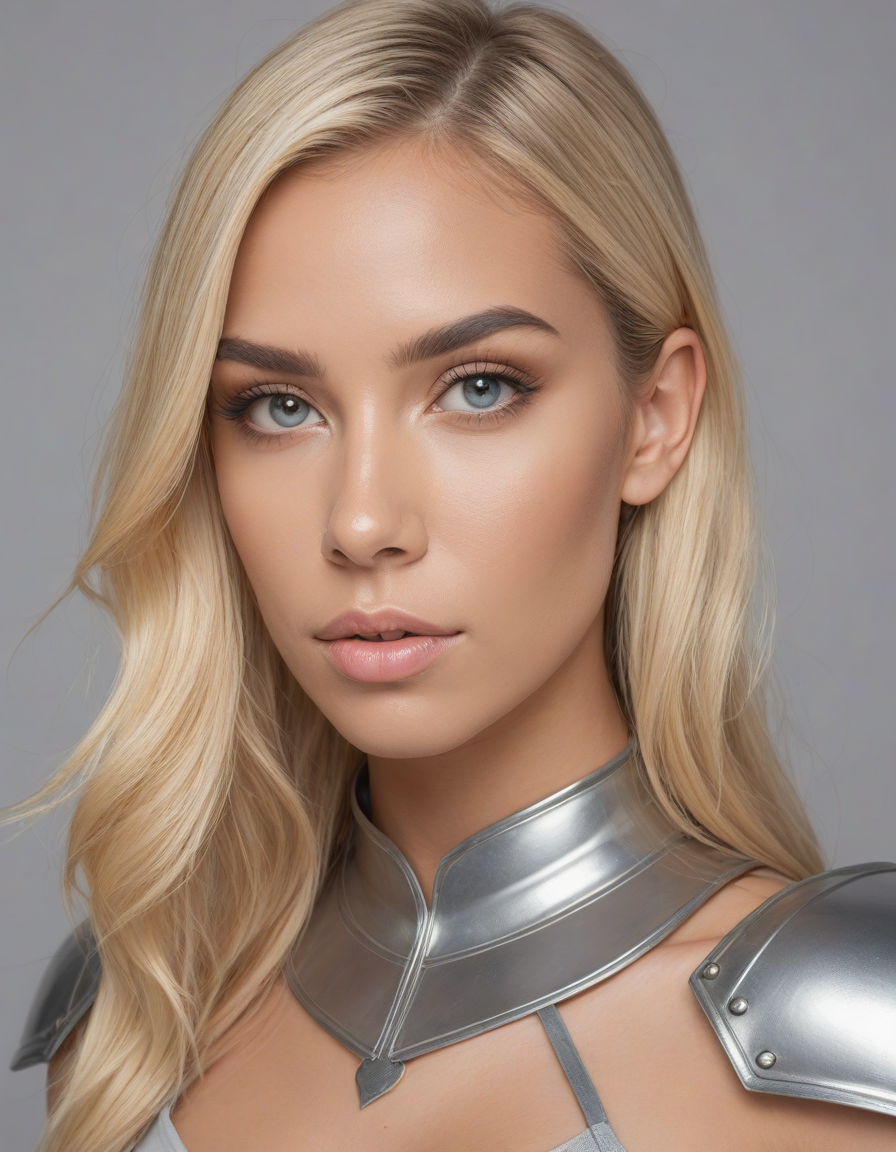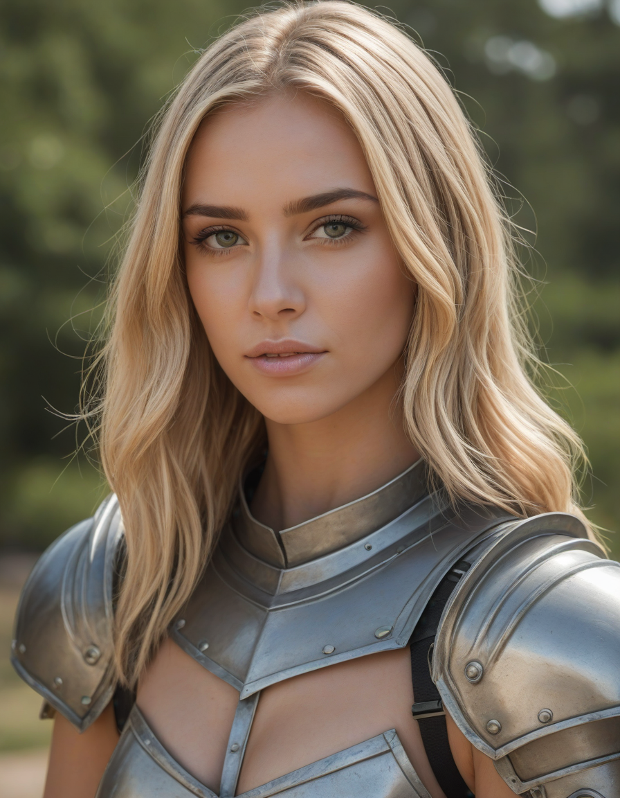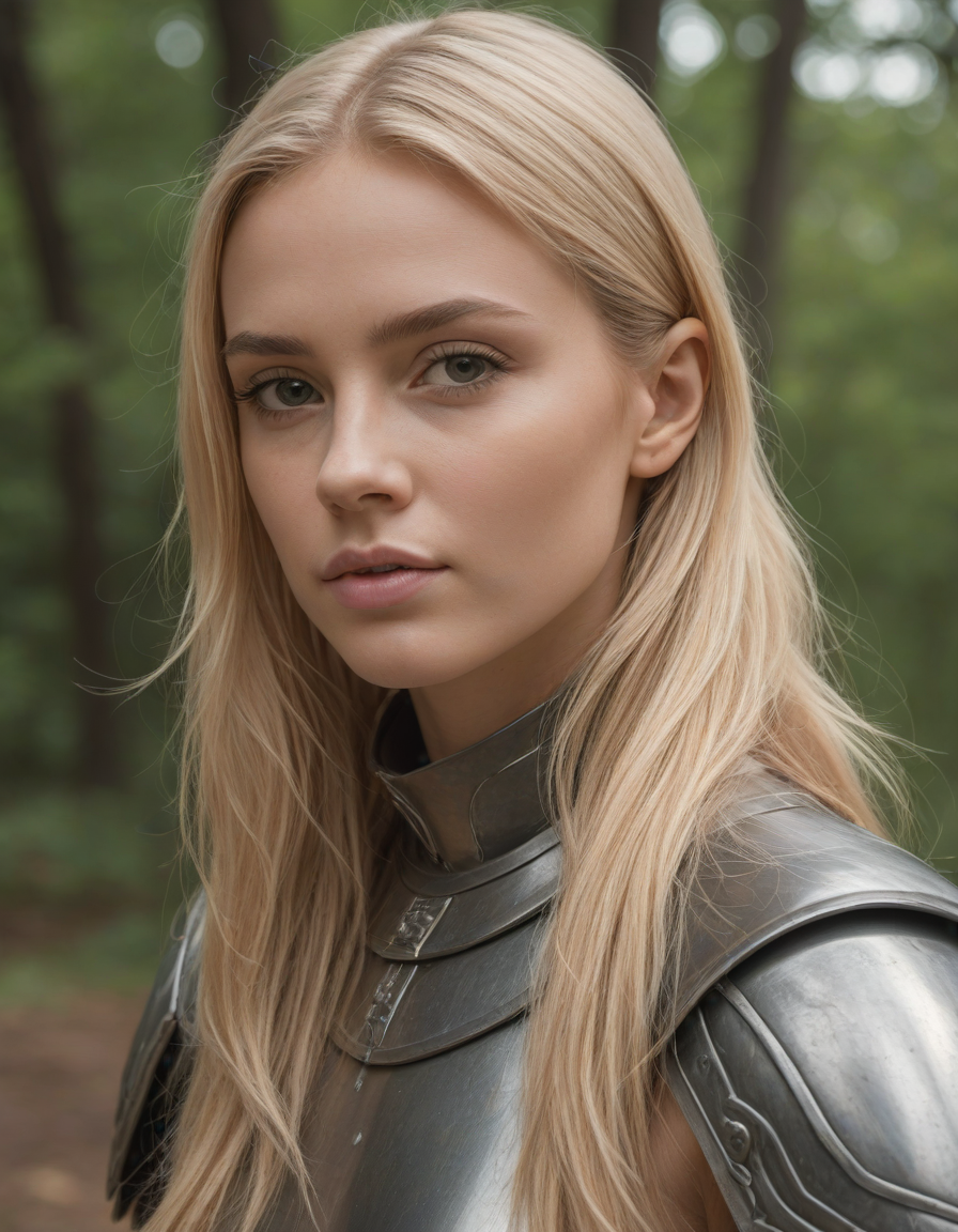 oval face shape, almond-shaped eyes, voluminous lashes, slightly arched eyebrows, narrow nasal bridge, rounded nose tip, symmetrical nostrils, full lips, pronounced cupid's bow, slightly fuller lower lip, defined cheekbones, rounded chin, smooth complexion, softly contoured jawline, balanced facial proportions, symmetrical features, gently curved eyelids, soft brow ridge, harmonious cheek to jawline transition, subtle philtrum, delicate ear lobes, straight blonde hair, clear skin, hooded eyelids, light pink lip color, slightly pouty expression, casual pose with hand on face, slight head tilt, indoor lighting, Light blue irises, Medium-thickness eyebrows, Softly angled eyebrows, A hint of freckles across the nose and cheeks, Natural makeup, Gentle frown lines between the eyebrows, Soft nasolabial folds, Smooth forehead, Subtle dimple on the chin, Clear facial contour without distinct shadows, Even skin tone with a hint of natural pink undertones, Slightly rosy cheeks, Tapered jawline, Fine hair texture with gentle waves, Youthful appearance with soft facial features, wearing complete set of armor, wearing full armor, Wearing chest armor, wearing leg armor, wearing feet armor, wearing bracer, wearing pauldrons,, wearing complete set of armor, wearing full armor, Wearing chest armor, wearing leg armor, wearing feet armor, wearing bracer, wearing pauldrons, Wearing helmet, Wearing breastplate, Wearing gauntlets, Wearing greaves, Wearing pauldrons, Wearing vambraces, Wearing cuisses, Wearing sabatons, Wearing gorget, Wearing tassets, Wearing bracers, Wearing cuirass, Wearing faulds, Wearing plackart, Wearing spaulders, Wearing besagews, provocative clothing, slutty clothing, skimpy clothing, revealing clothing, seductive clothing, coquettish clothing, coquettish, seductive, taboo, sheer clothing,