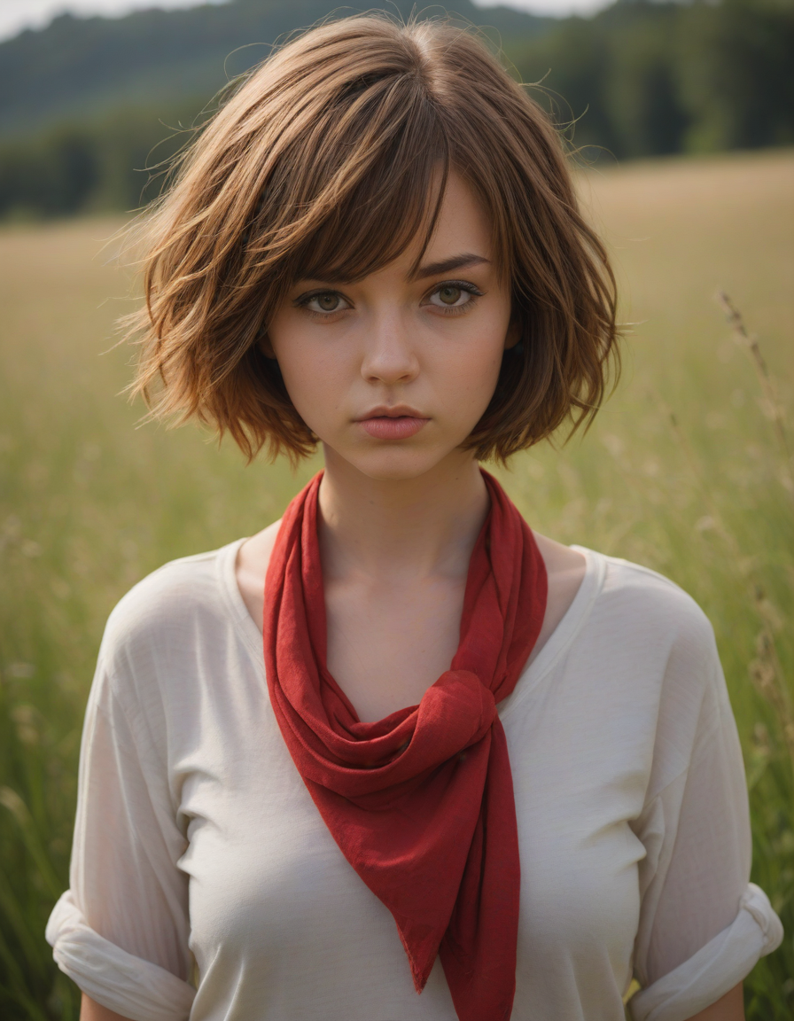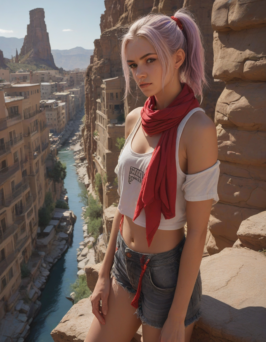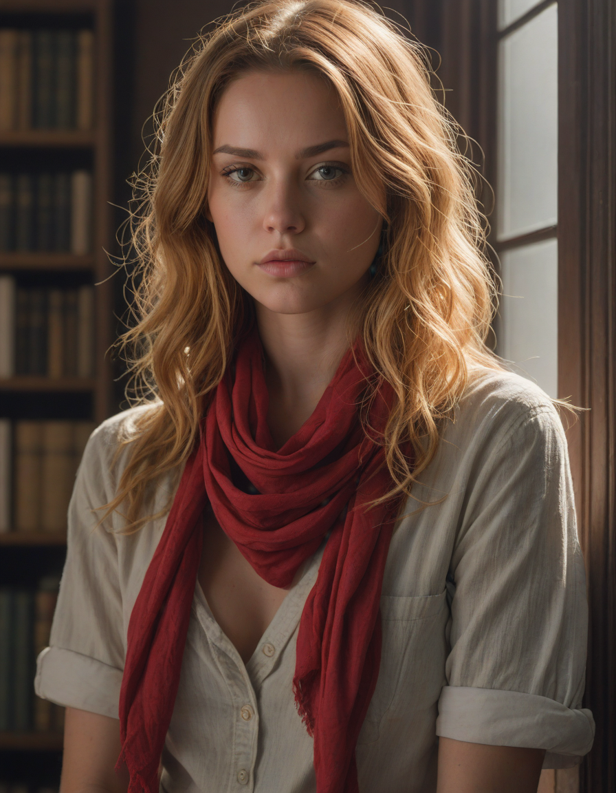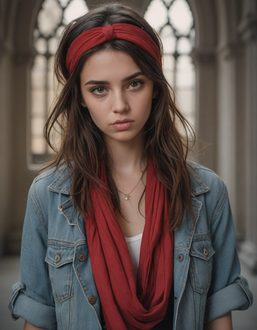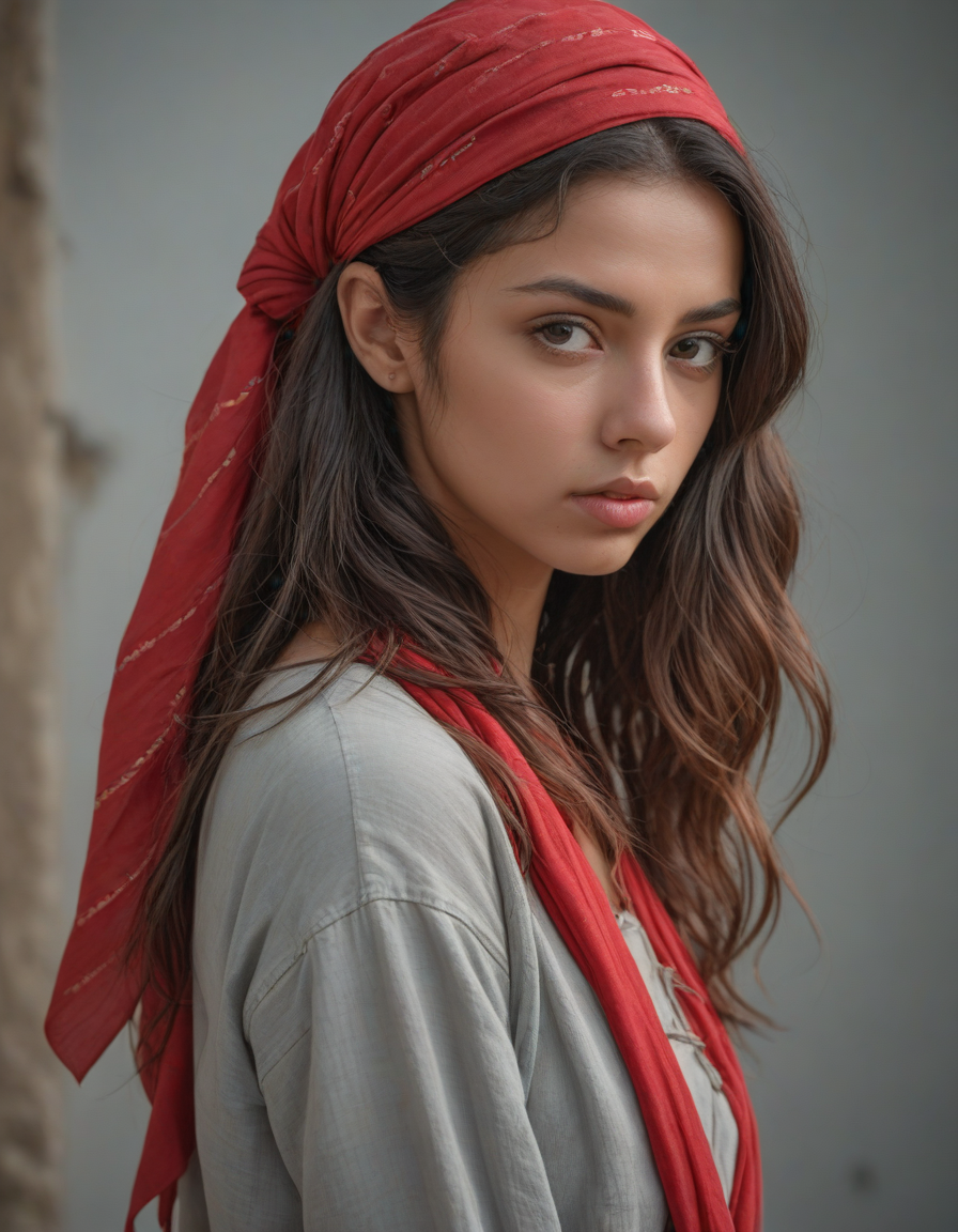 very attractive, Shadows darting in corners, Tattered clothing, pouting, wearing a red bandana, An envious stare