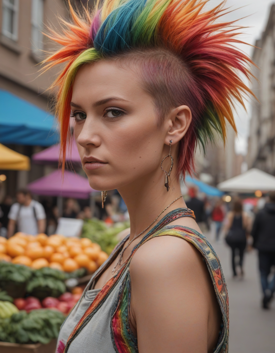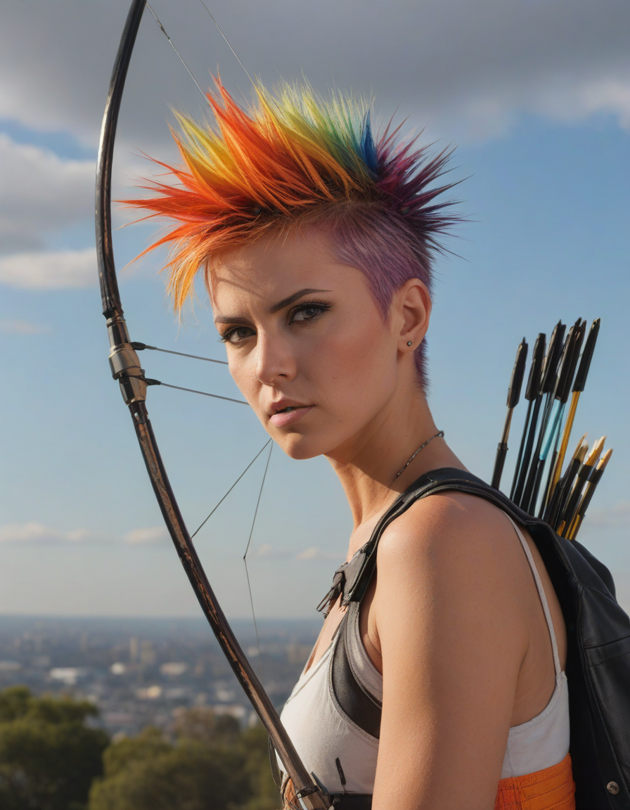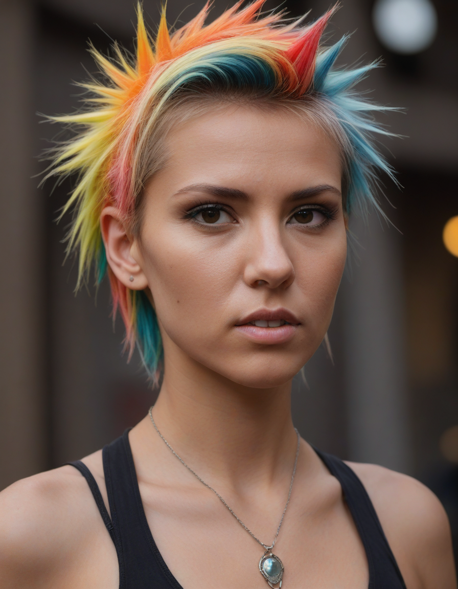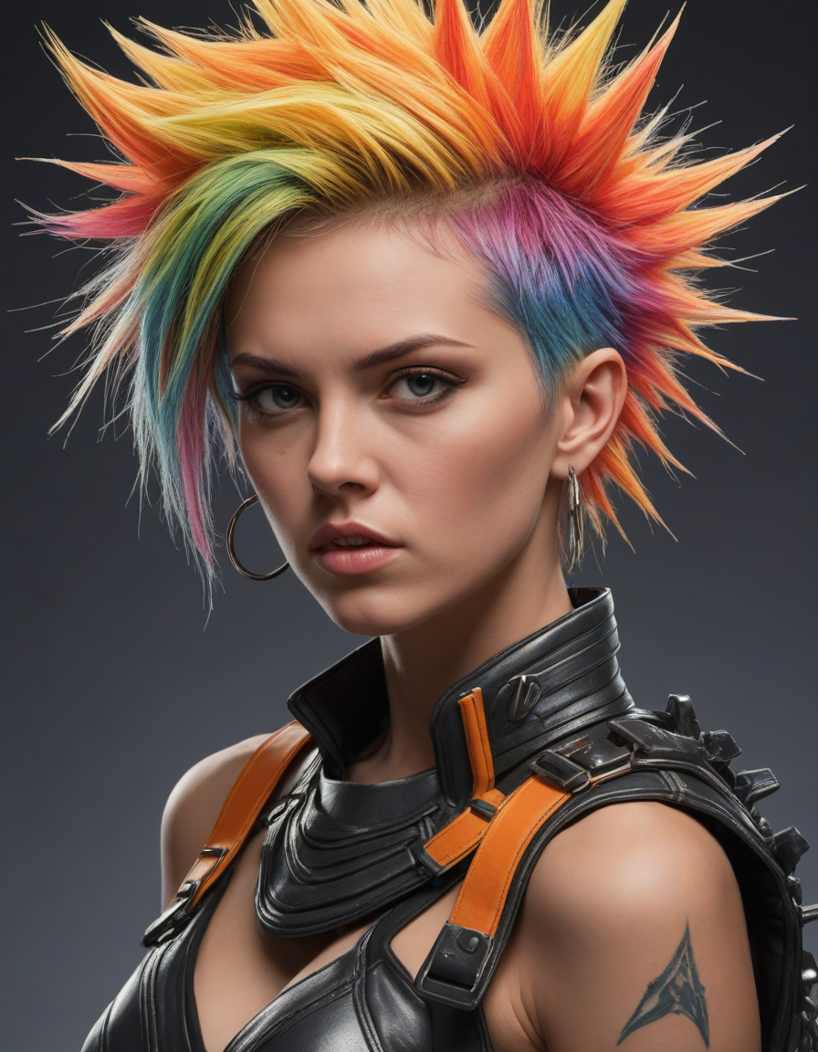 short, spiky, rainbow-colored punk hair, defiant stance, tangerine skyline