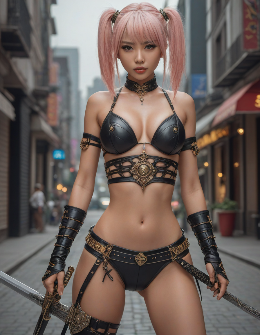 Holding a sword in both hands in a confident pose, detailed grip, detailed fuller, detailed pommel, detailed blade, detailed edge, , provocative clothing, slutty clothing, skimpy clothing, revealing clothing, seductive clothing, coquettish clothing, coquettish, seductive, taboo, sheer clothing,