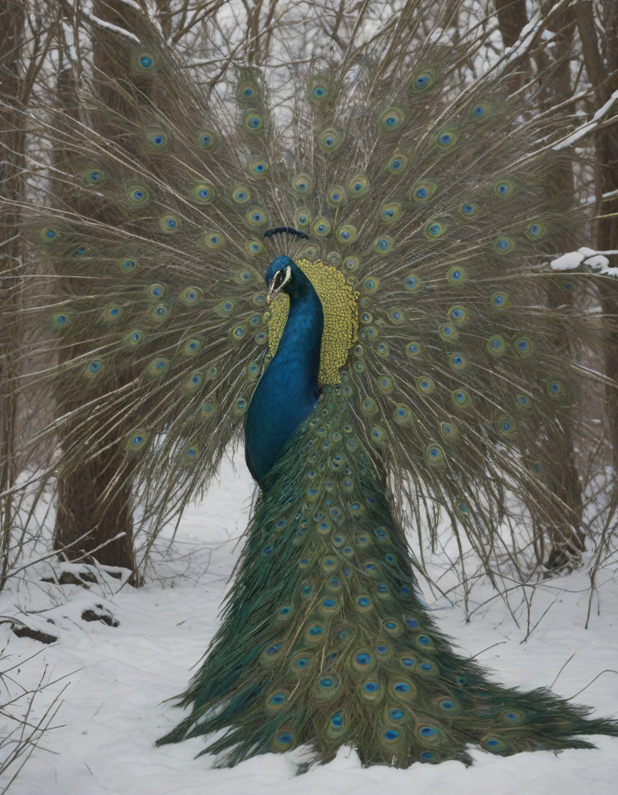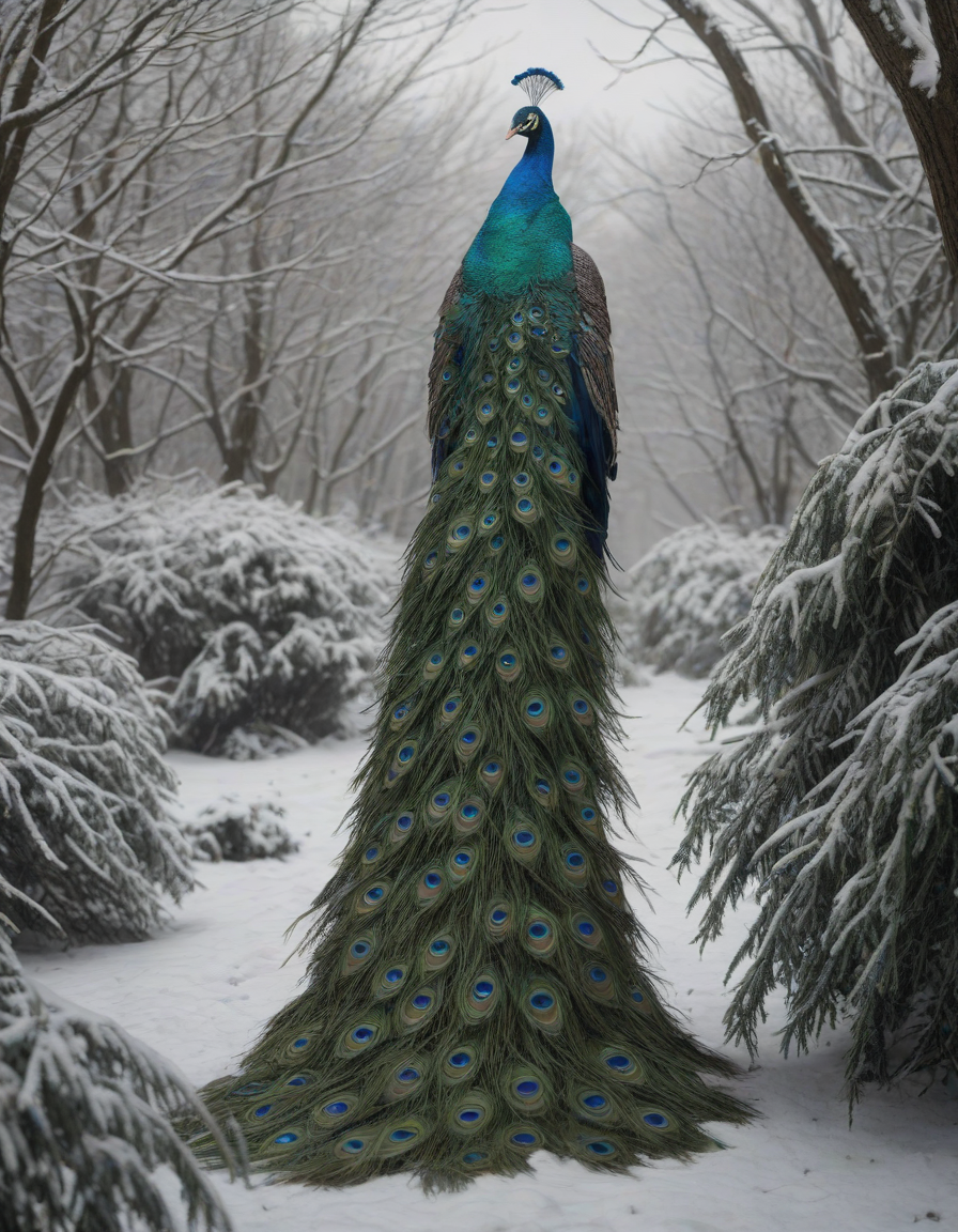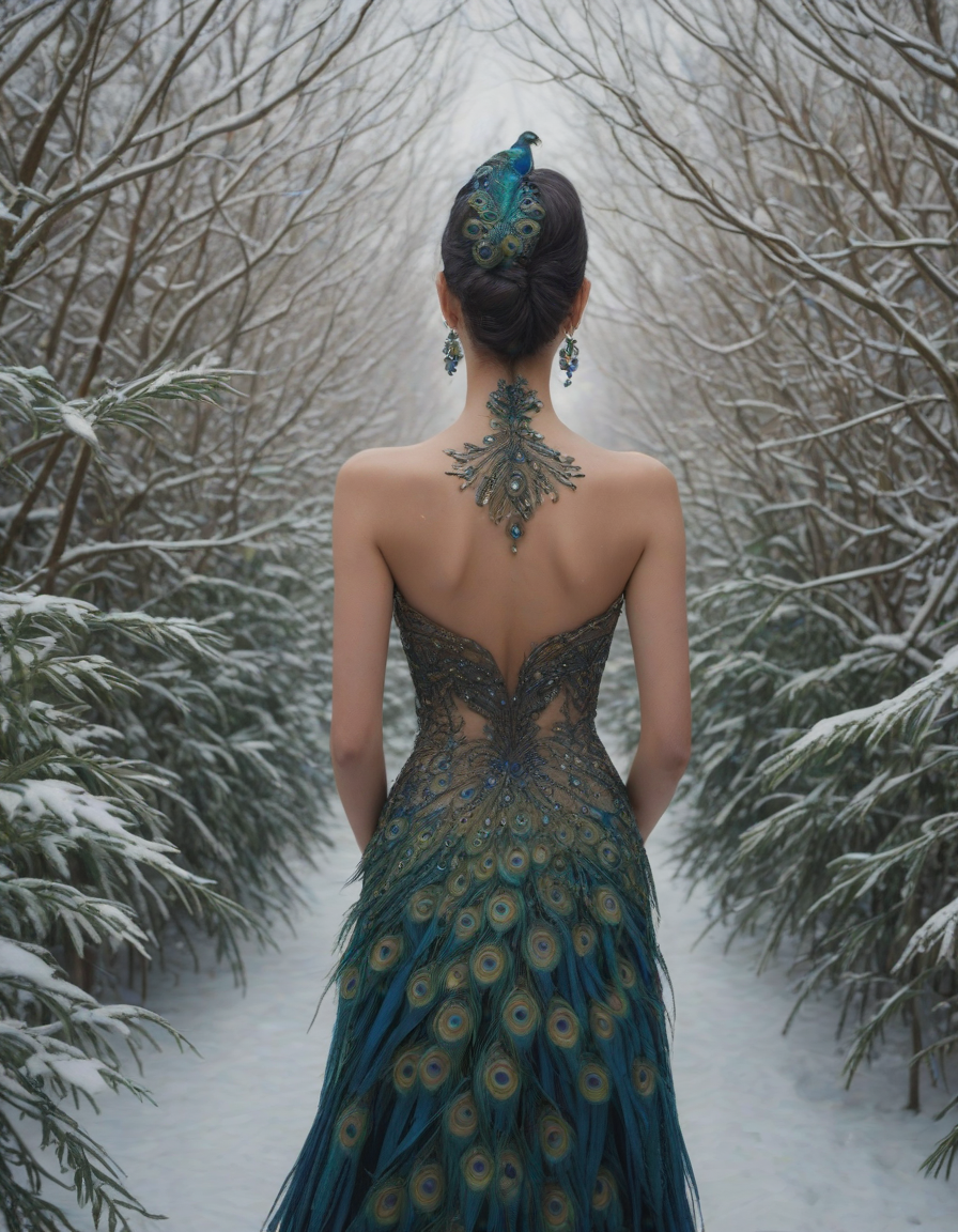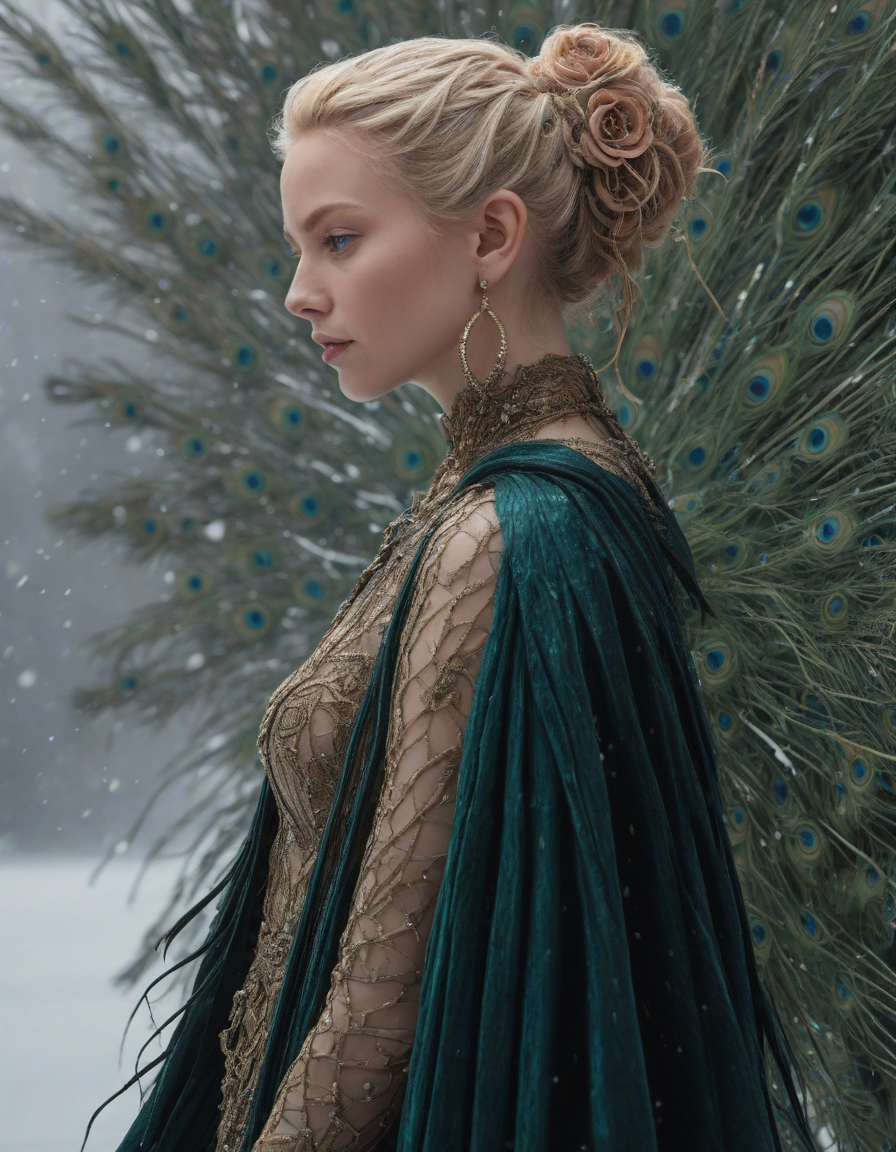 view from behind, overgown foliage, in a blizzard, awestruck, earrings, Glistening feathers of the majestic peacock, vibrant, glowing, and healthy skin, alien-looking, surrounded by people, pleased, trauma