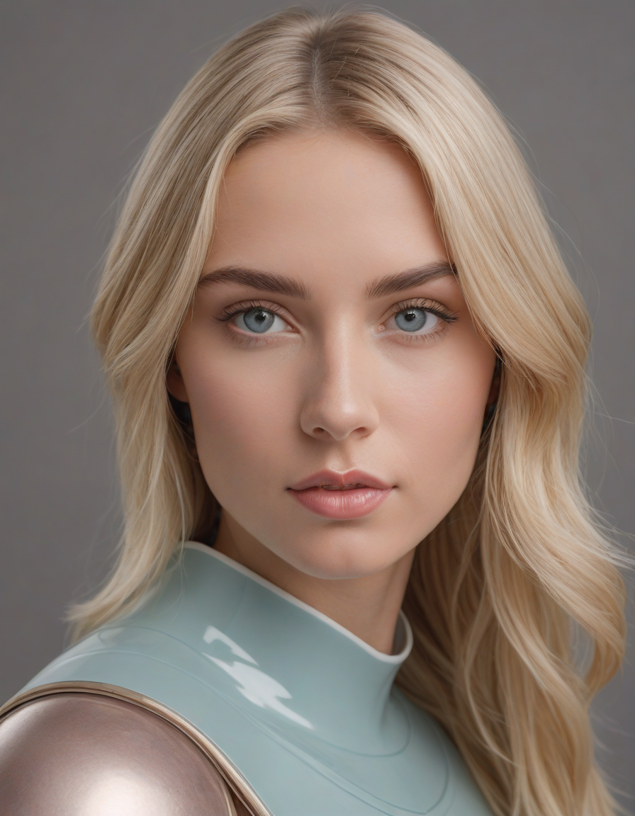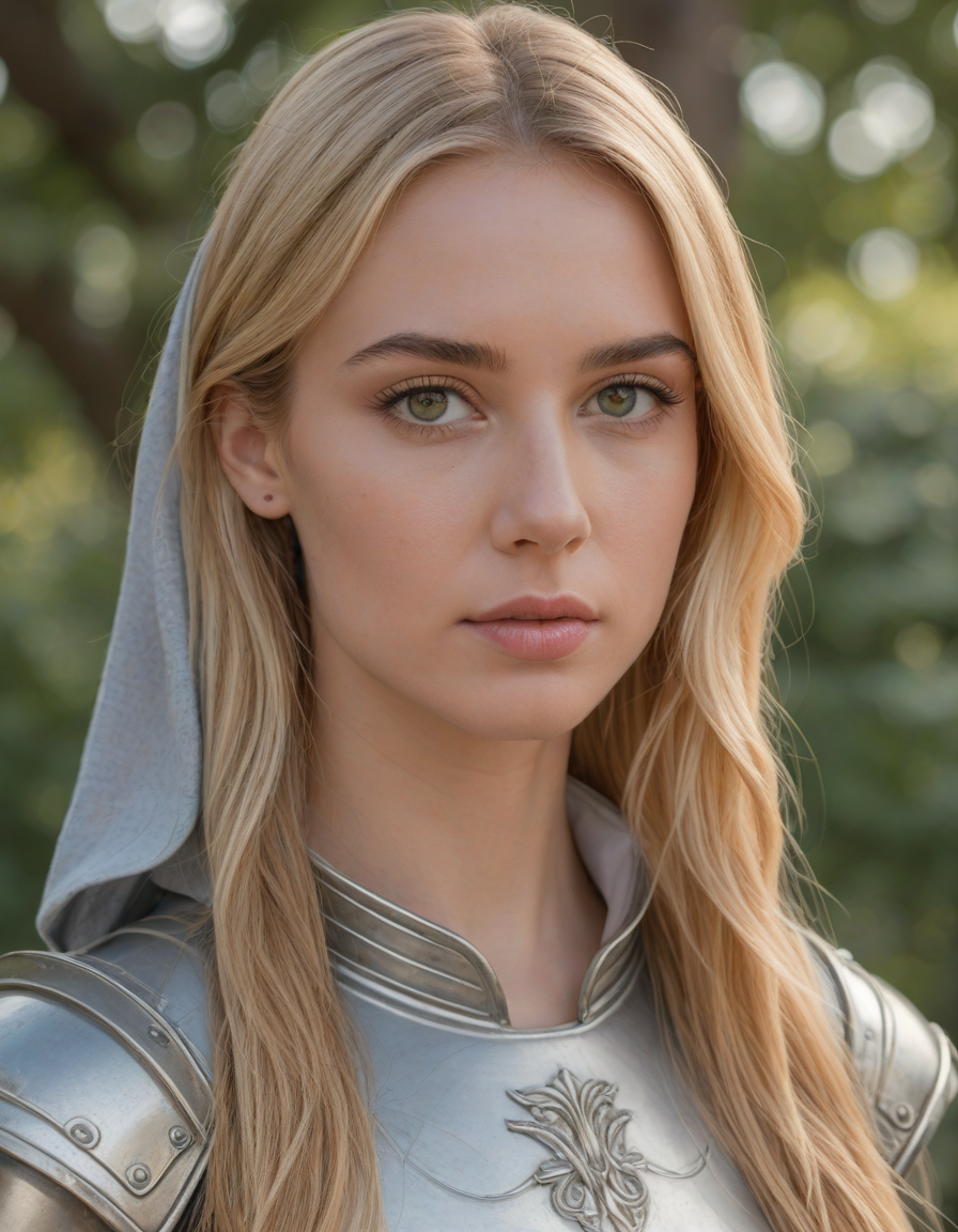 oval face shape, almond-shaped eyes, voluminous lashes, slightly arched eyebrows, narrow nasal bridge, rounded nose tip, symmetrical nostrils, full lips, pronounced cupid's bow, slightly fuller lower lip, defined cheekbones, rounded chin, smooth complexion, softly contoured jawline, balanced facial proportions, symmetrical features, gently curved eyelids, soft brow ridge, harmonious cheek to jawline transition, subtle philtrum, delicate ear lobes, straight blonde hair, clear skin, hooded eyelids, light pink lip color, slightly pouty expression, casual pose with hand on face, slight head tilt, indoor lighting, Light blue irises, Medium-thickness eyebrows, Softly angled eyebrows, A hint of freckles across the nose and cheeks, Natural makeup, Gentle frown lines between the eyebrows, Soft nasolabial folds, Smooth forehead, Subtle dimple on the chin, Clear facial contour without distinct shadows, Even skin tone with a hint of natural pink undertones, Slightly rosy cheeks, Tapered jawline, Fine hair texture with gentle waves, Youthful appearance with soft facial features, wearing complete set of armor, wearing full armor, Wearing chest armor, wearing leg armor, wearing feet armor, wearing bracer, wearing pauldrons,