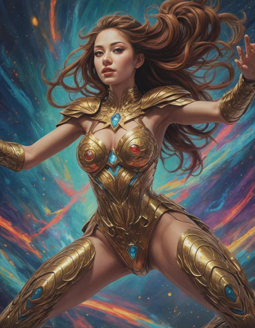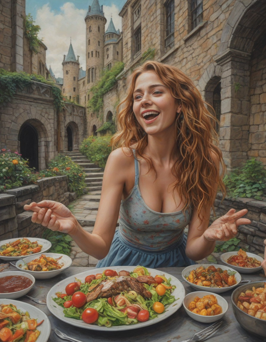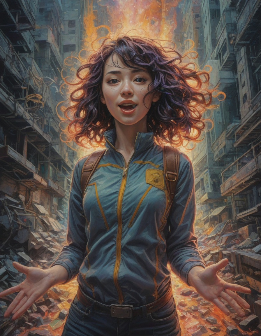 wide angle, reaching out, oil pastel portrait, you feel euphoric, decadent feast, bursting with happiness, super hero, complex