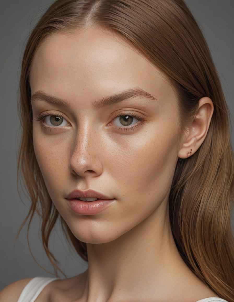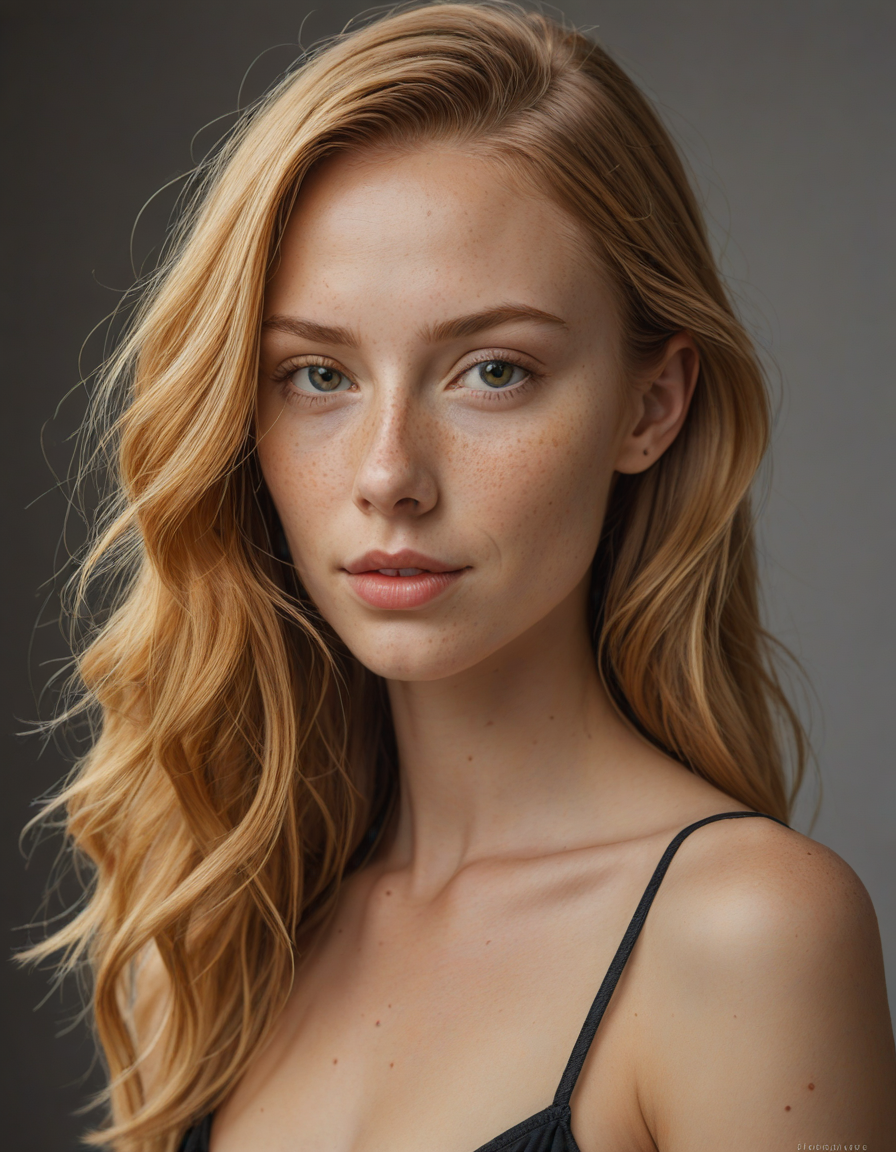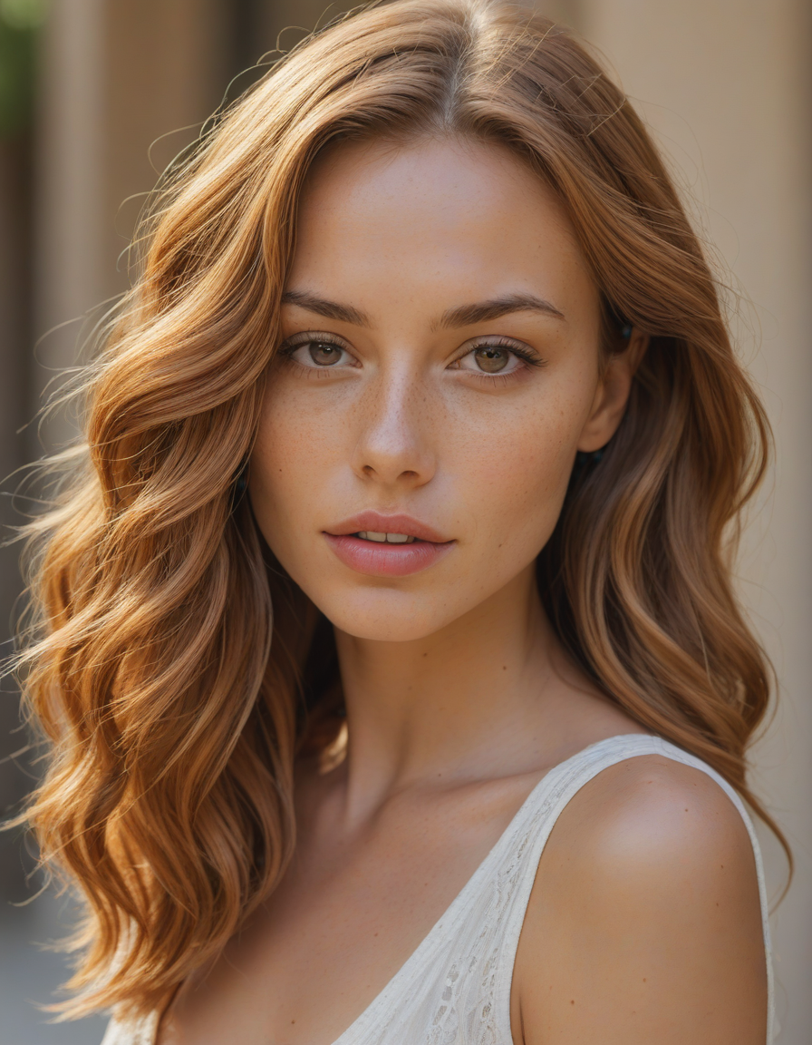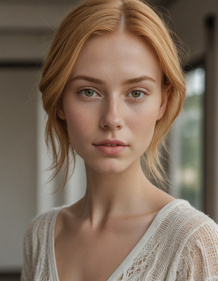 her reflection dances, high-arched eyebrows, pronounced cheekbones, full lips, narrow facial structure, small chin, pointed nose tip, deep-set eyes, prominent jawline, smooth forehead, elongated face shape, subtle eye creases, thin nose bridge, voluminous cheek appearance, defined lip contour, sculpted facial silhouette, soft nasolabial folds, high forehead, delicate ear shape, refined jaw angle, sleek facial contour, Caucasian American Girl, Bimbo Facial Features, Barbie-esque Facial Features, british, pale, 18yo, 18 year old, young, youthful, , Sofia from Australia, medium shoulder-length ginger parted in the side with blond streaks, brown eyes, curved nose, thick lips, dimples, perfect teeth, teasing look, freckles