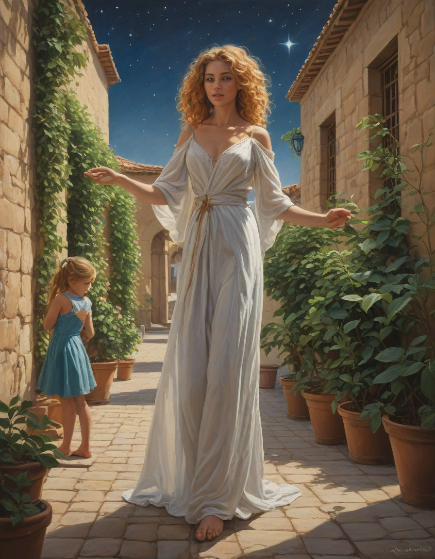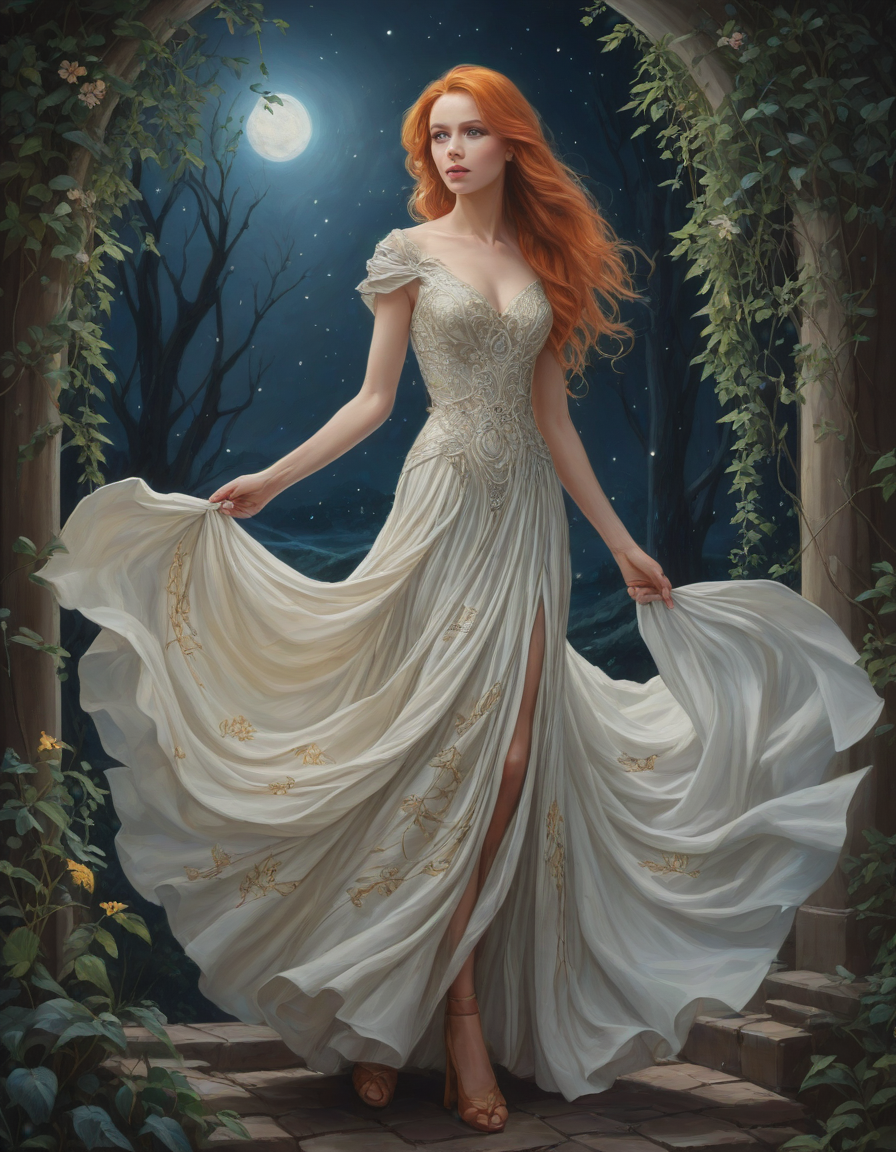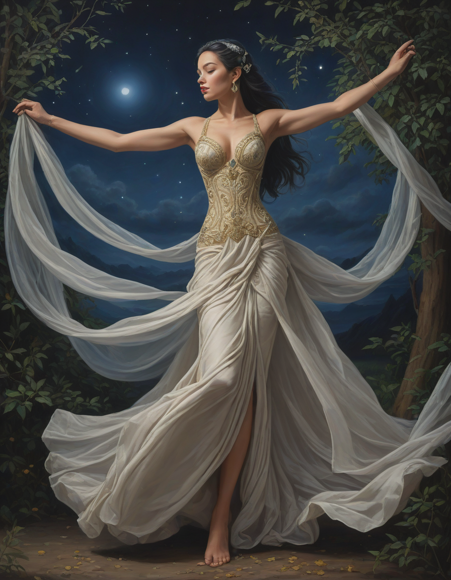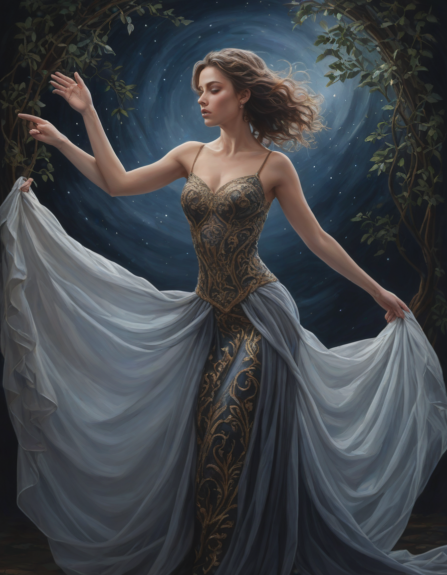 dancing, formal, elegant evening wear, standing rigidly present, complex, overgown foliage, epic oil painting, gazing at the stars