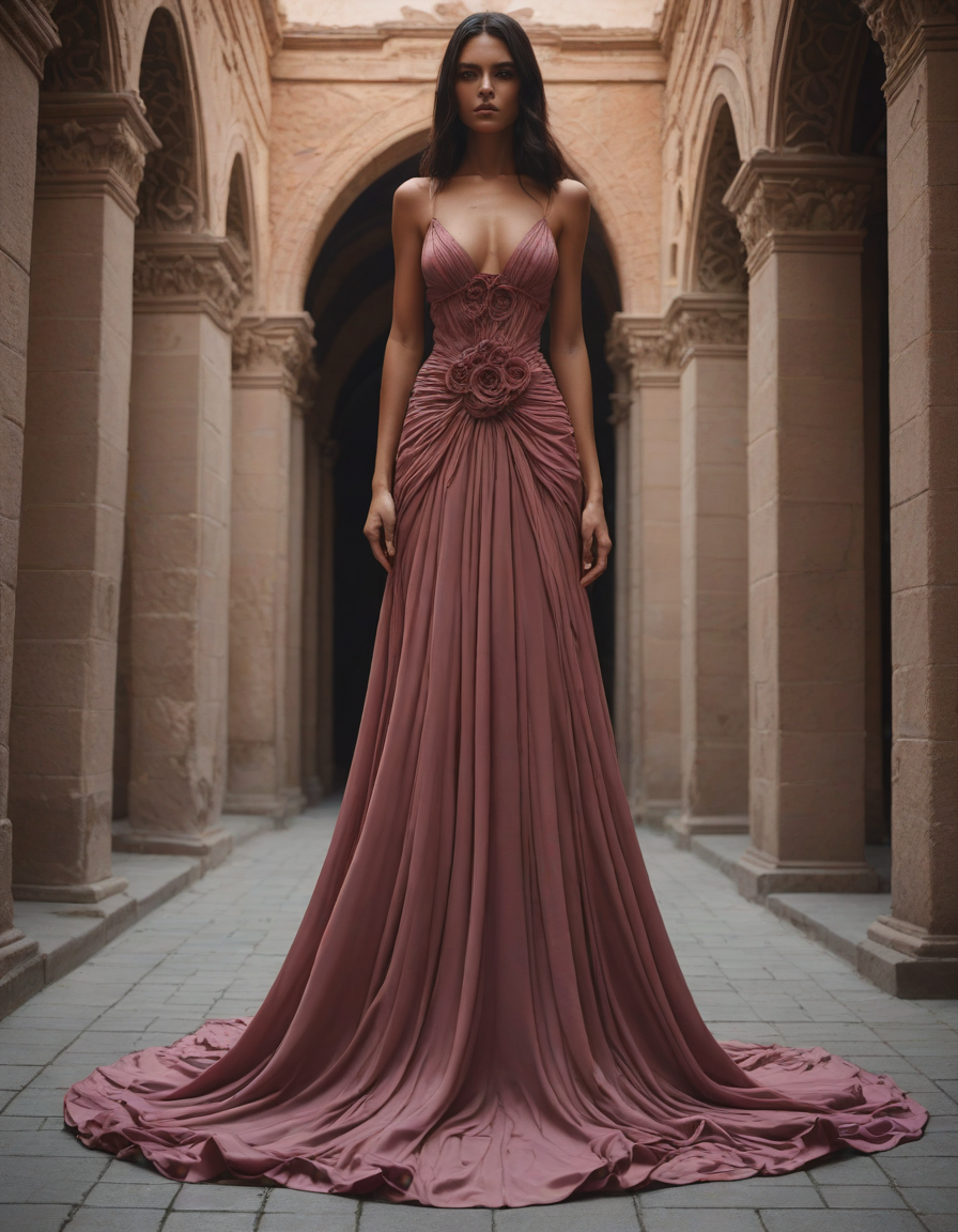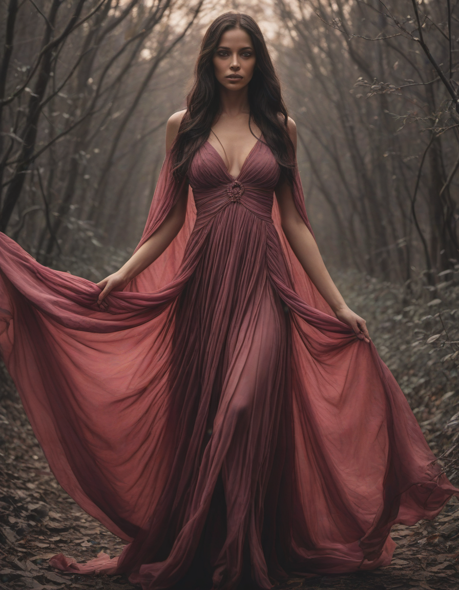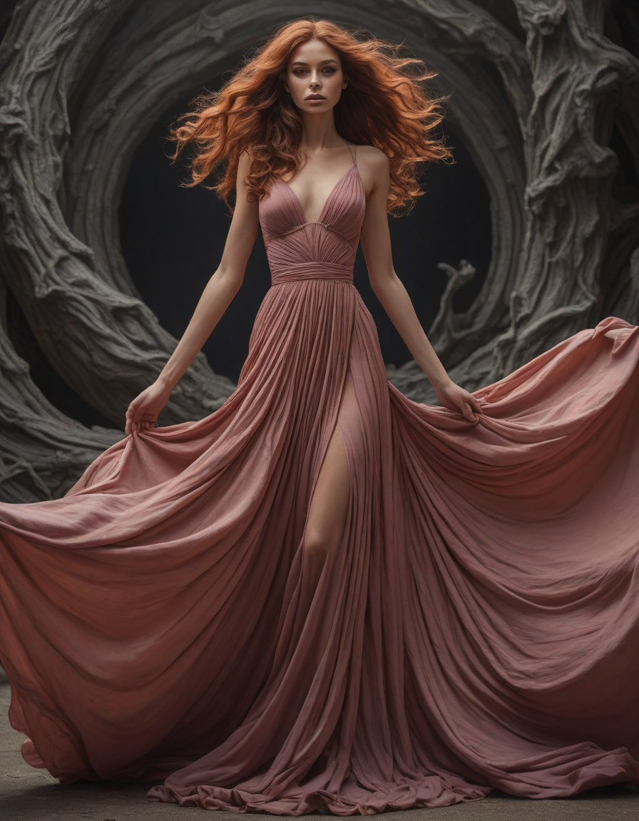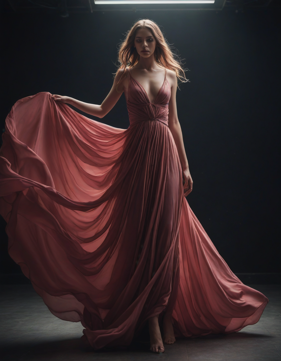 Rose colored long dress flowing in the wind in a curious way, cosmic horror, HOLY SHIT, hard to look away from, deep sadness, a mysterious figure, shrouded in shadows, symmetrical