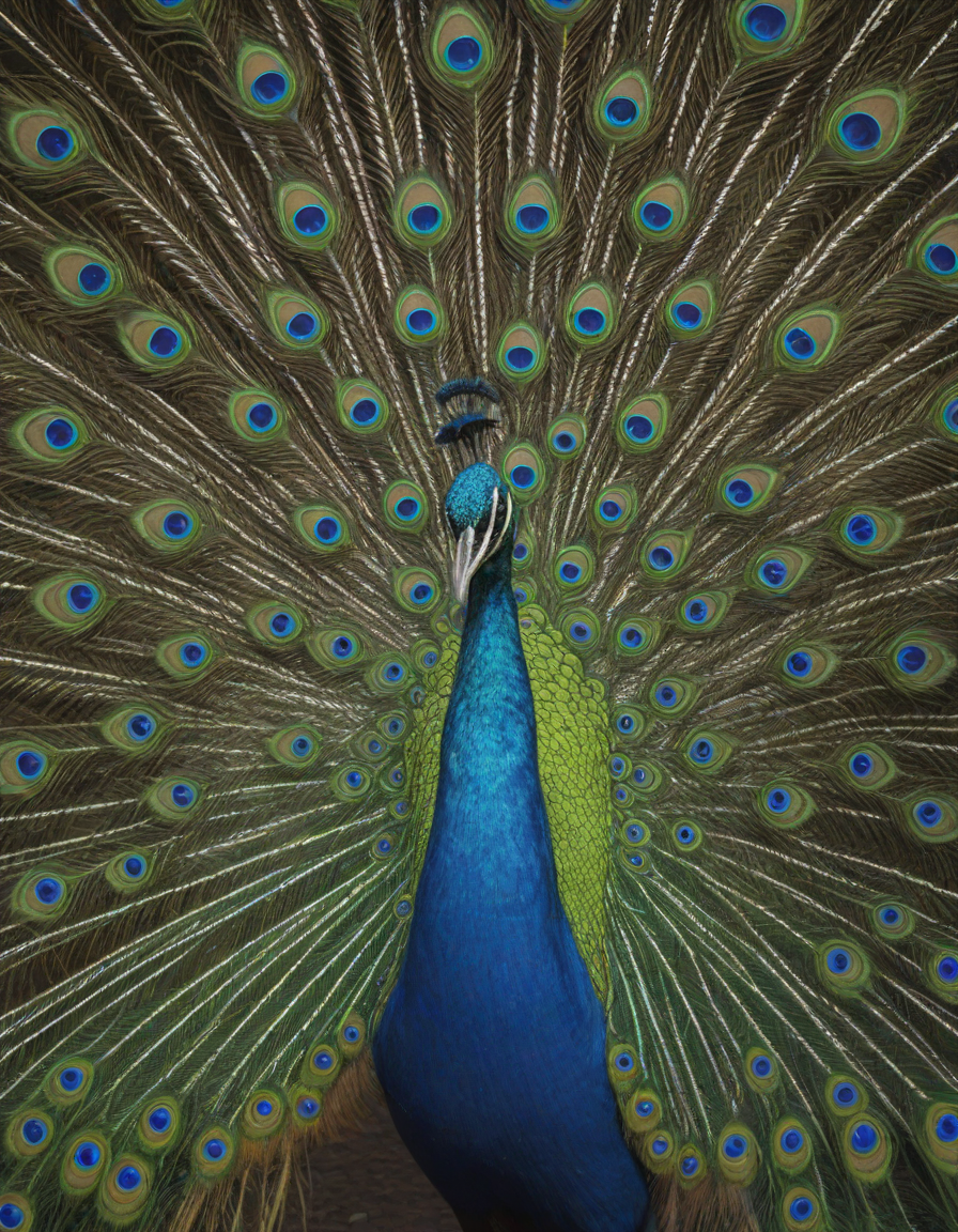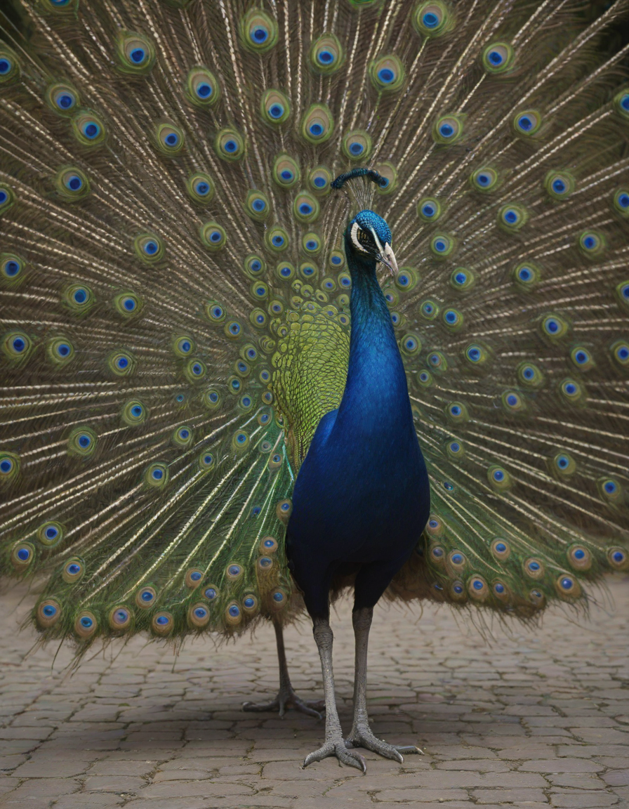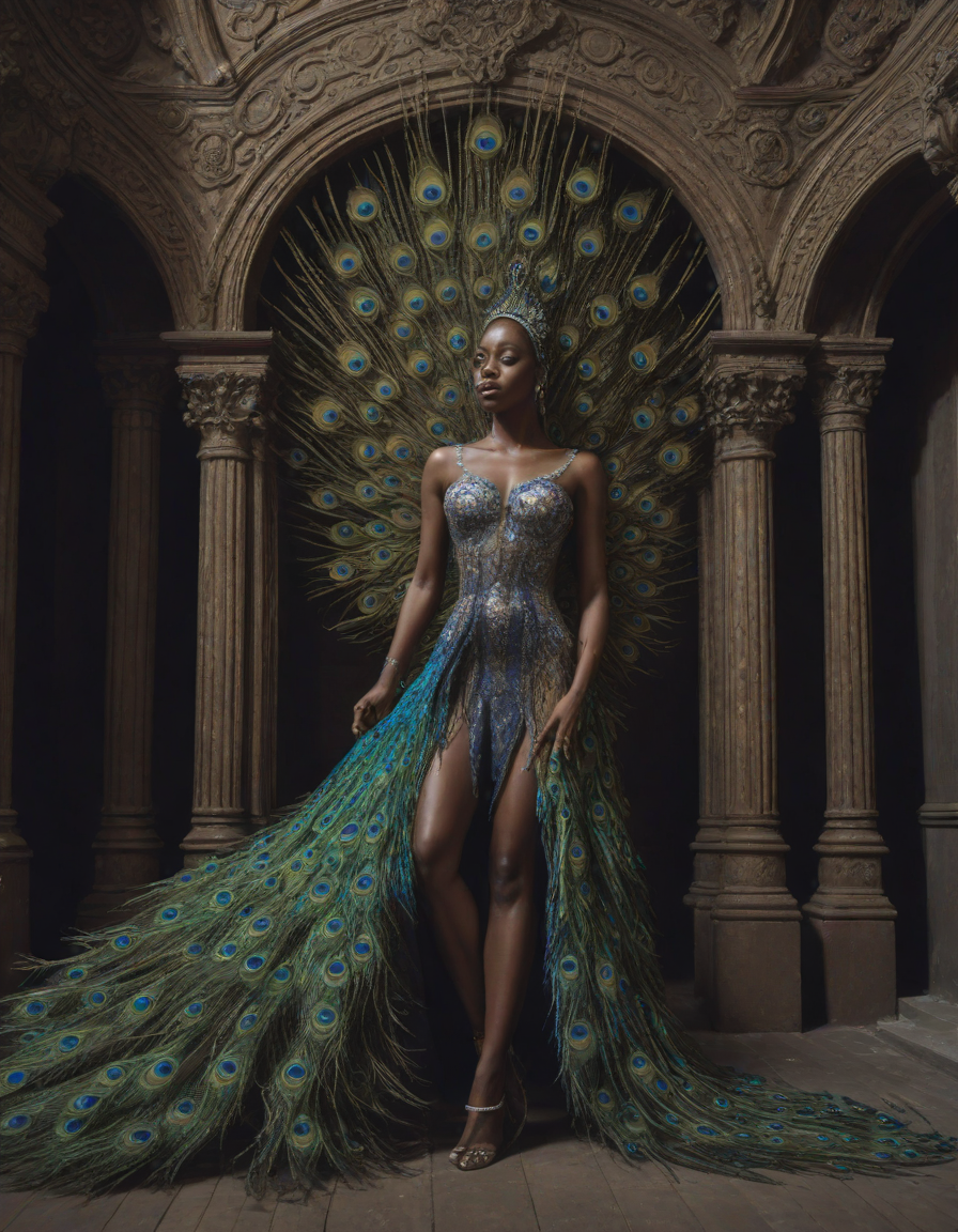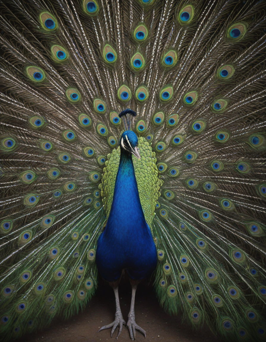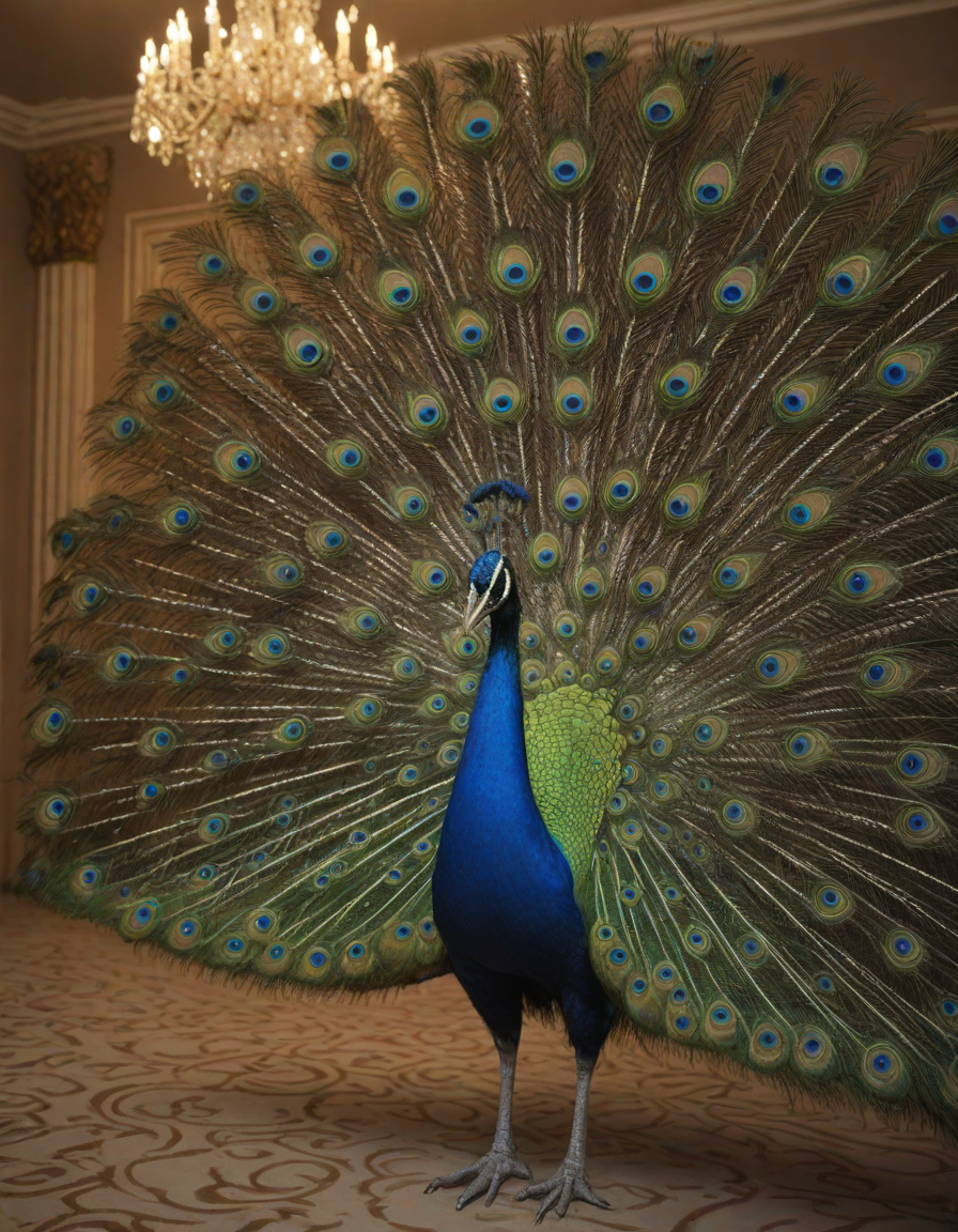 Glistening feathers of the majestic peacock, on stage, raw, reflection