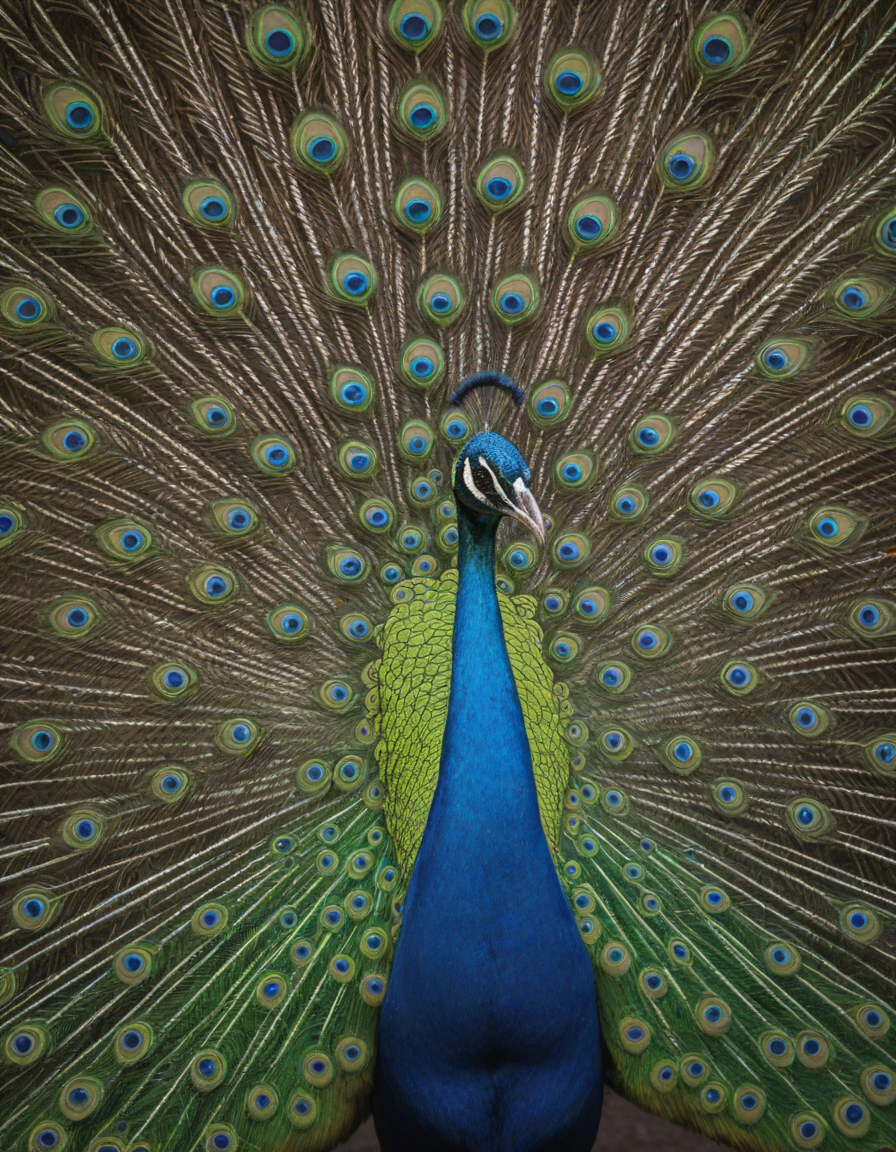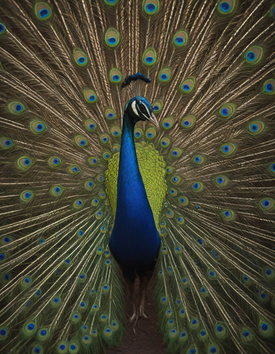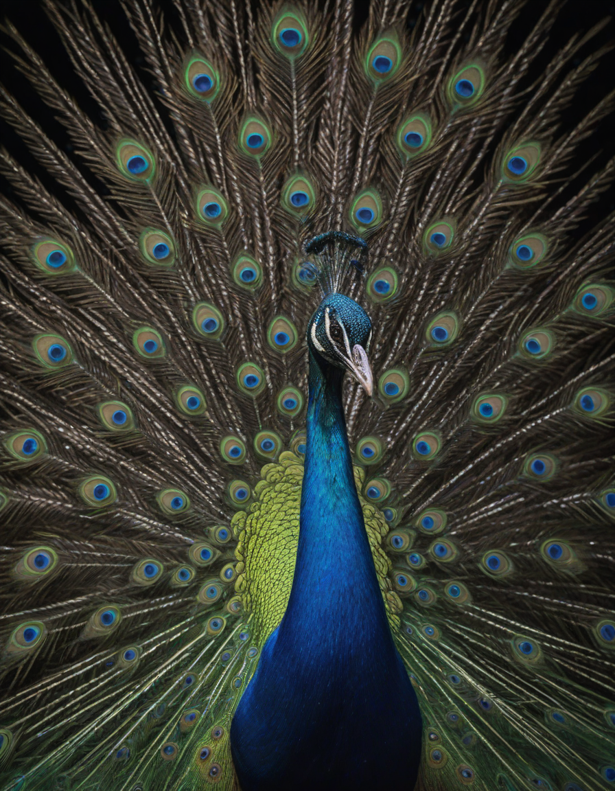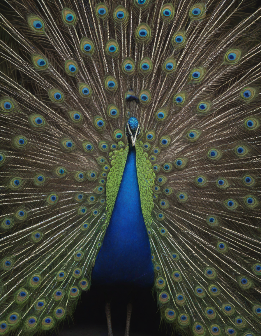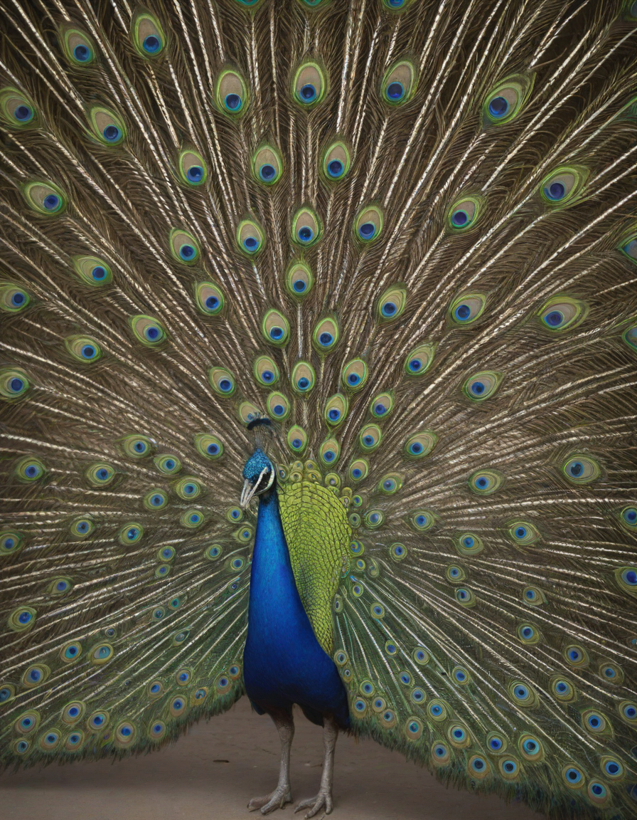 Glistening feathers of the majestic peacock, on stage, raw, reflection