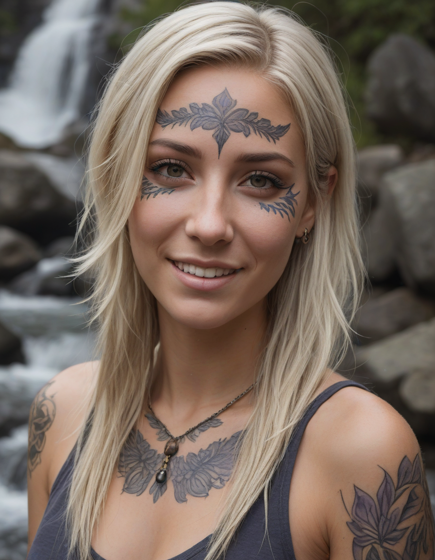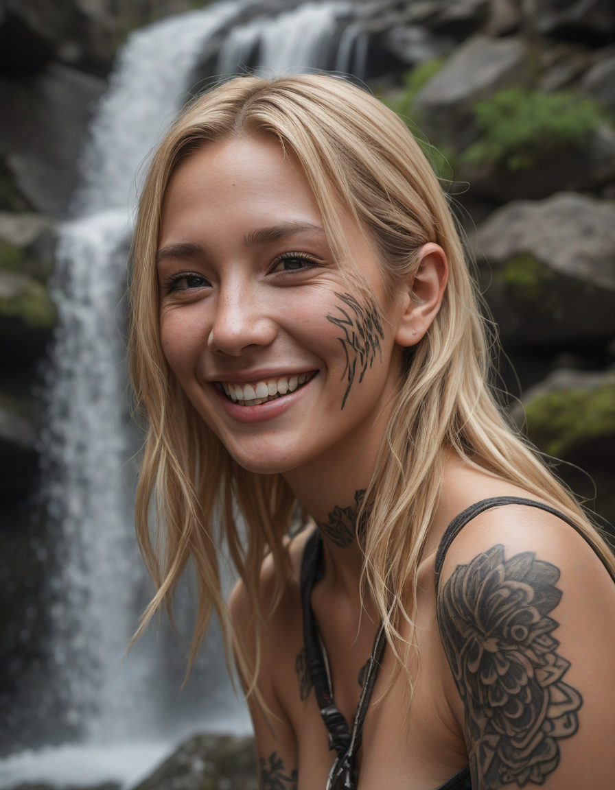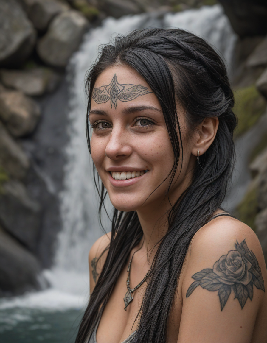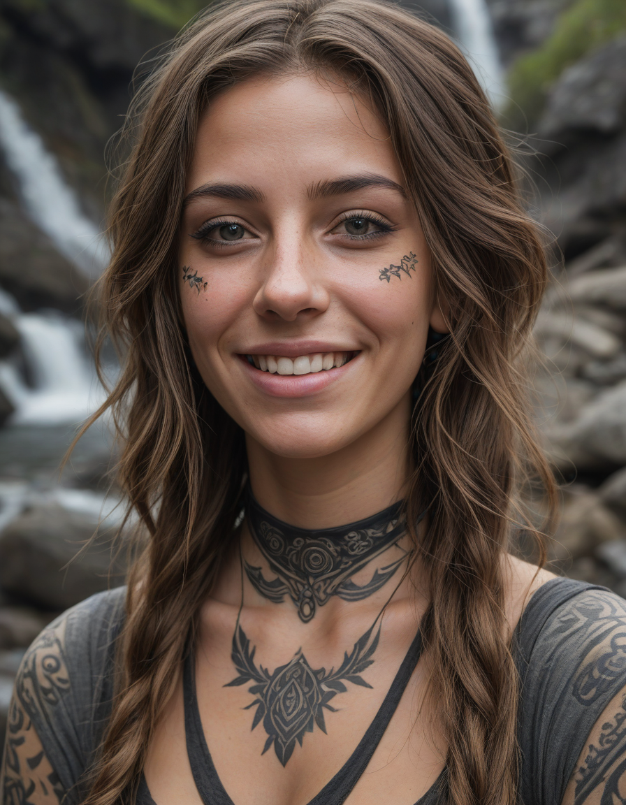 Eyes crinkled in laughter, nose scrunched up, cascading waterfall, skyrim npc, face tattoo