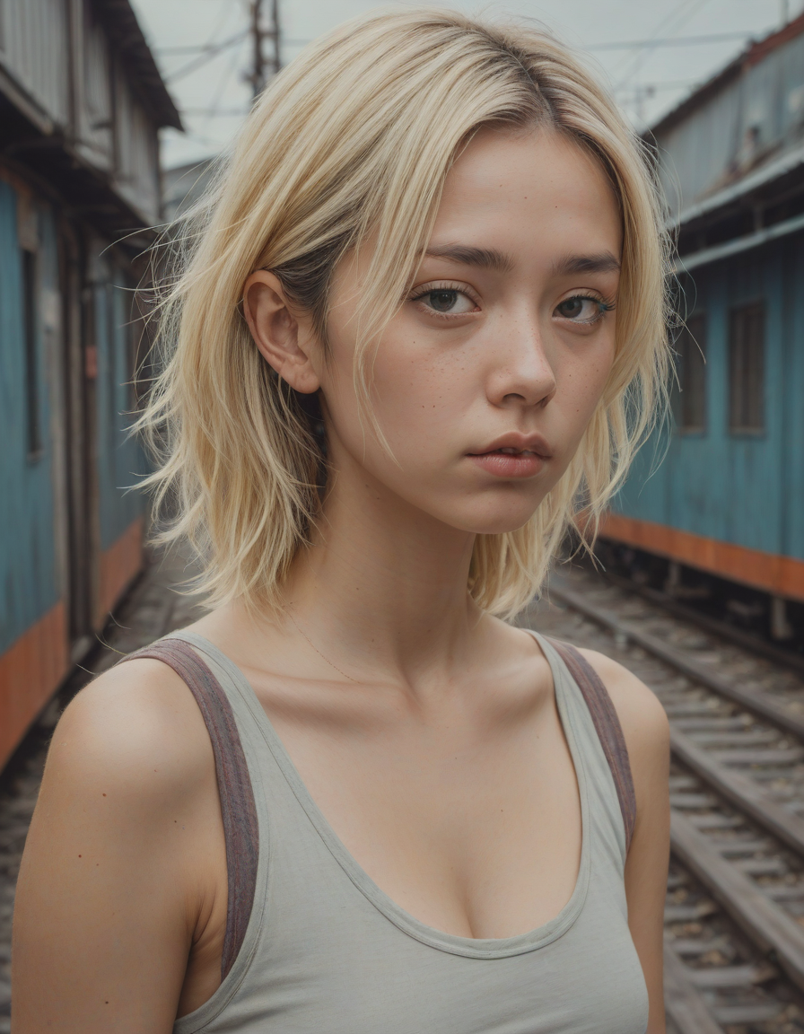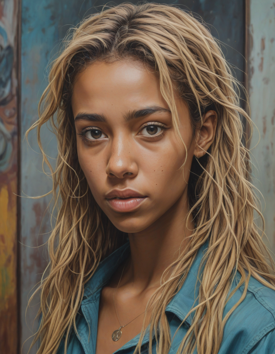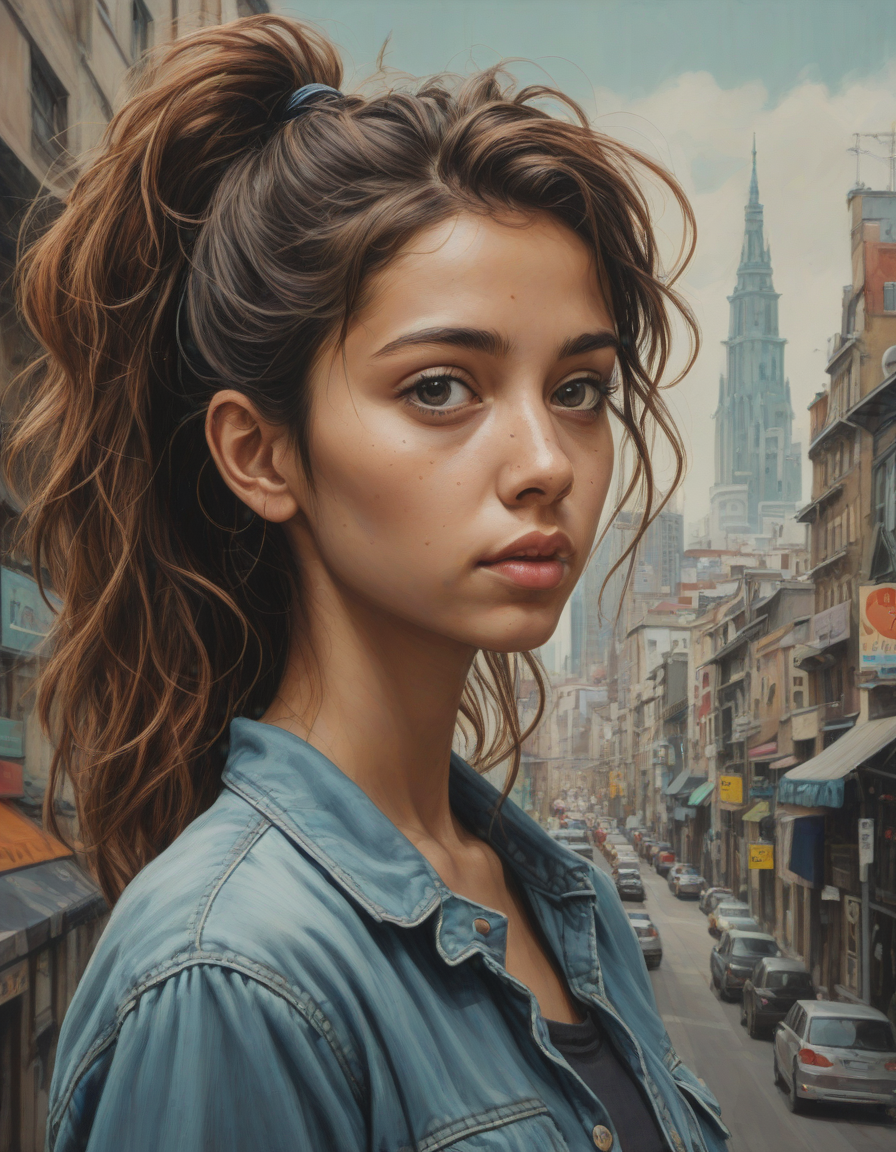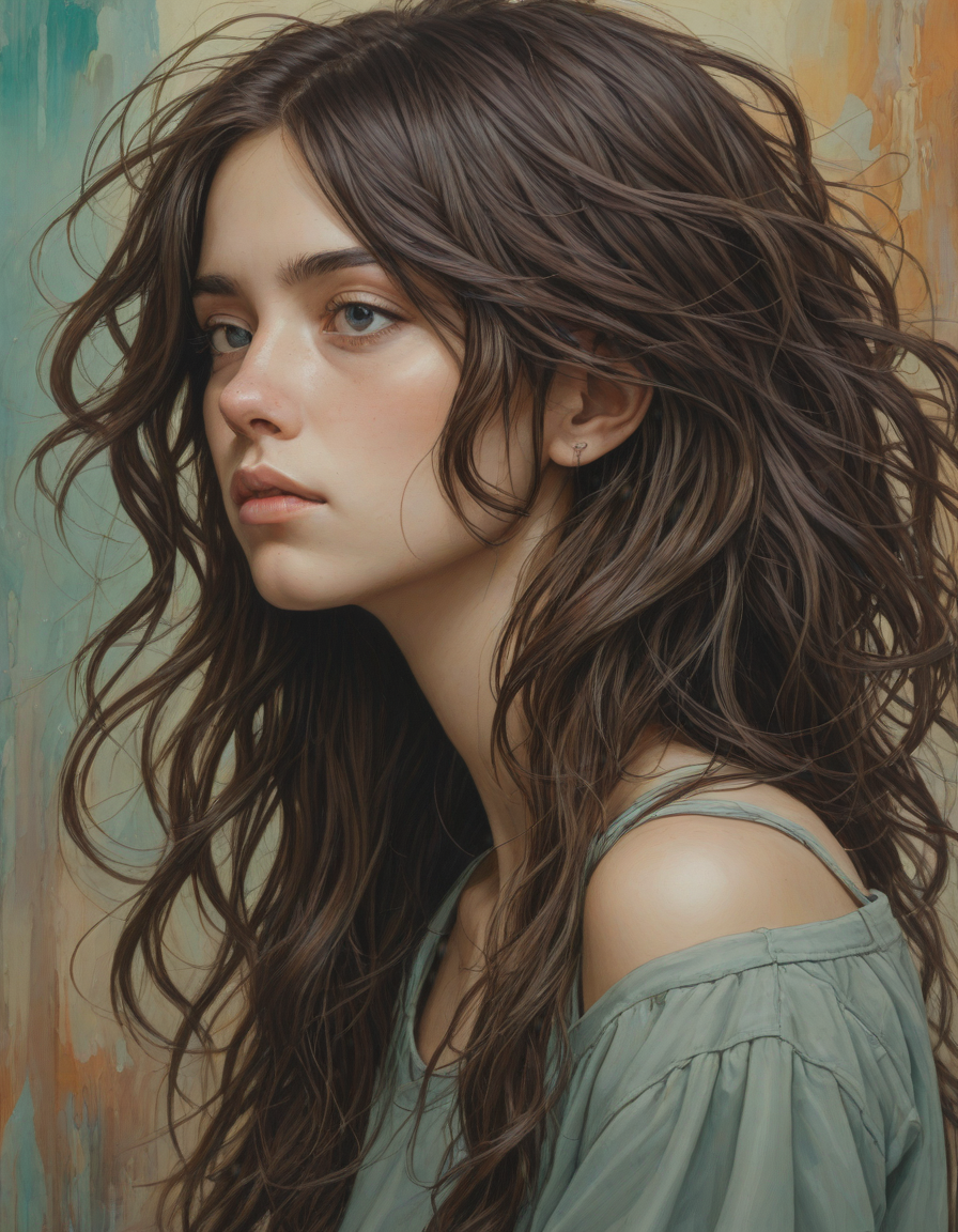 charming, 2000s indie art style, head tilted in confusion, A painter meticulously blends hues on a wooden canvas