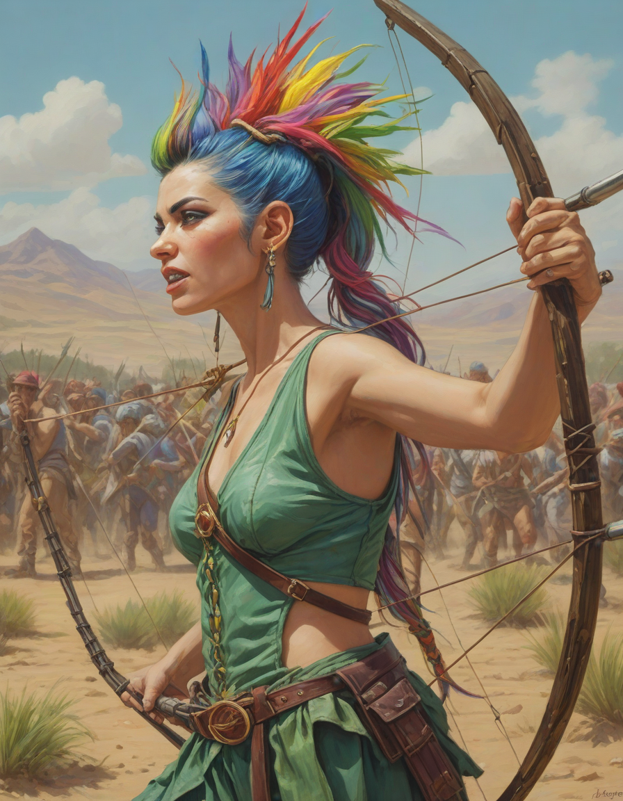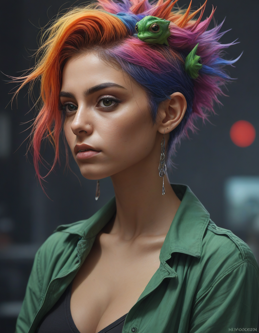 short, spiky, rainbow-colored punk hair, Gloating triumphantly, dryad, pepe the frog, propaganda poster, attention-stealing, Vivid oil paints