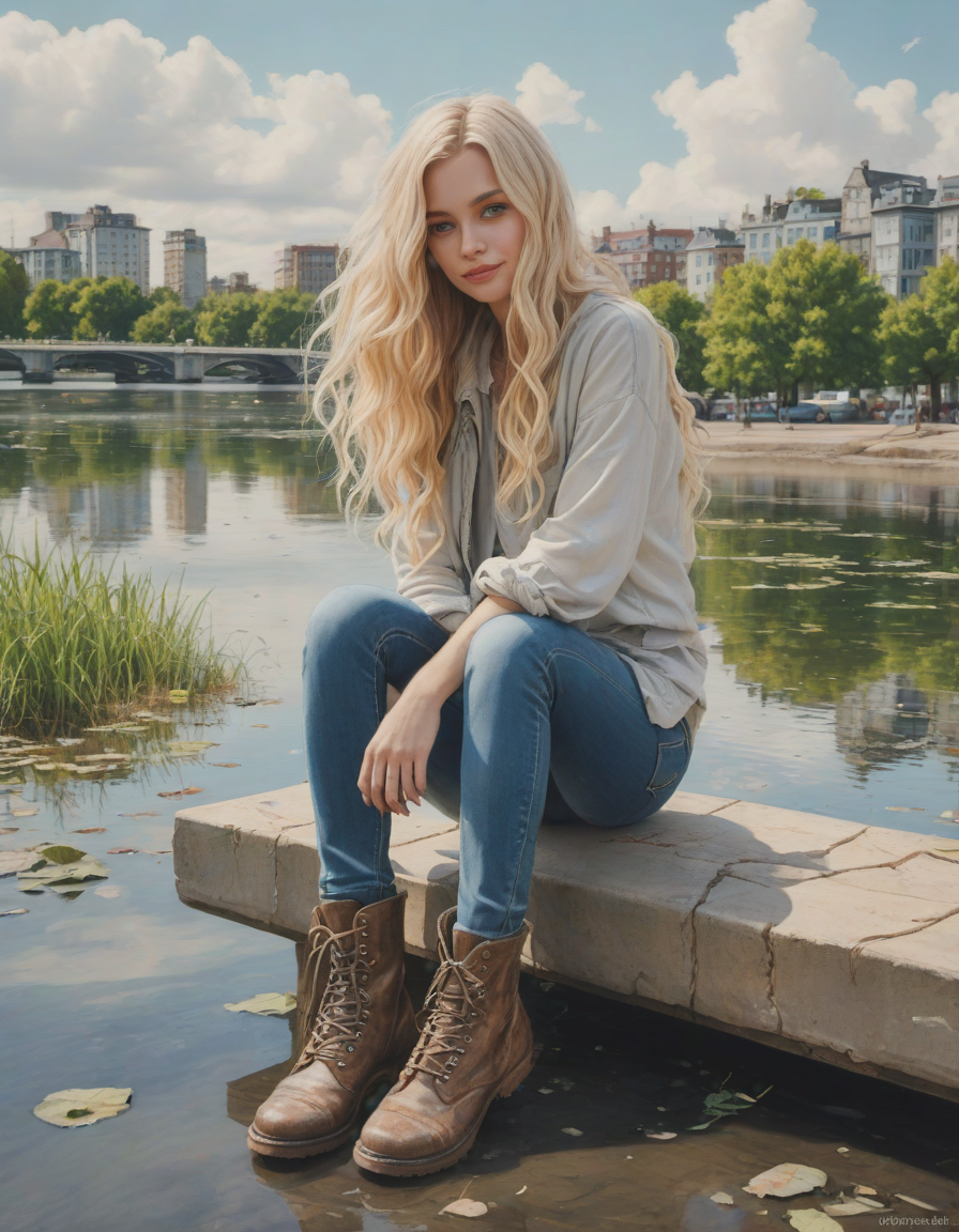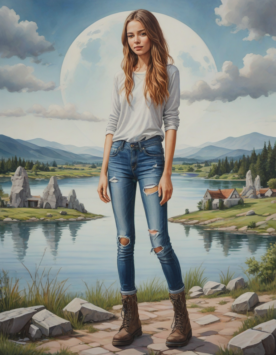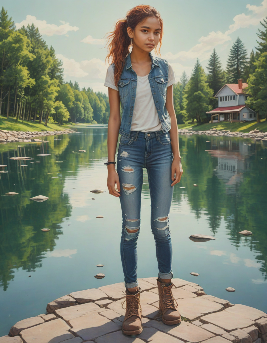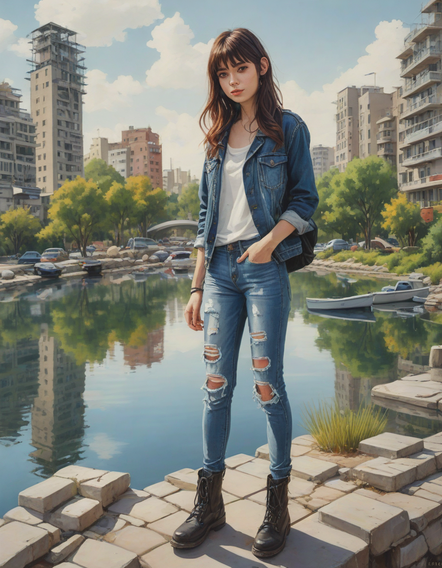 watercolor, tranquil lake, bursting with happiness, Graffiti artwork featuring an alien cityscape, torn jeans and combat boots